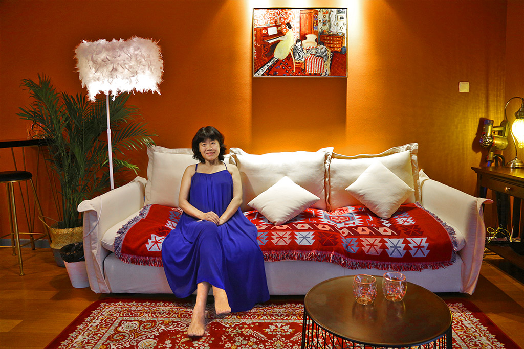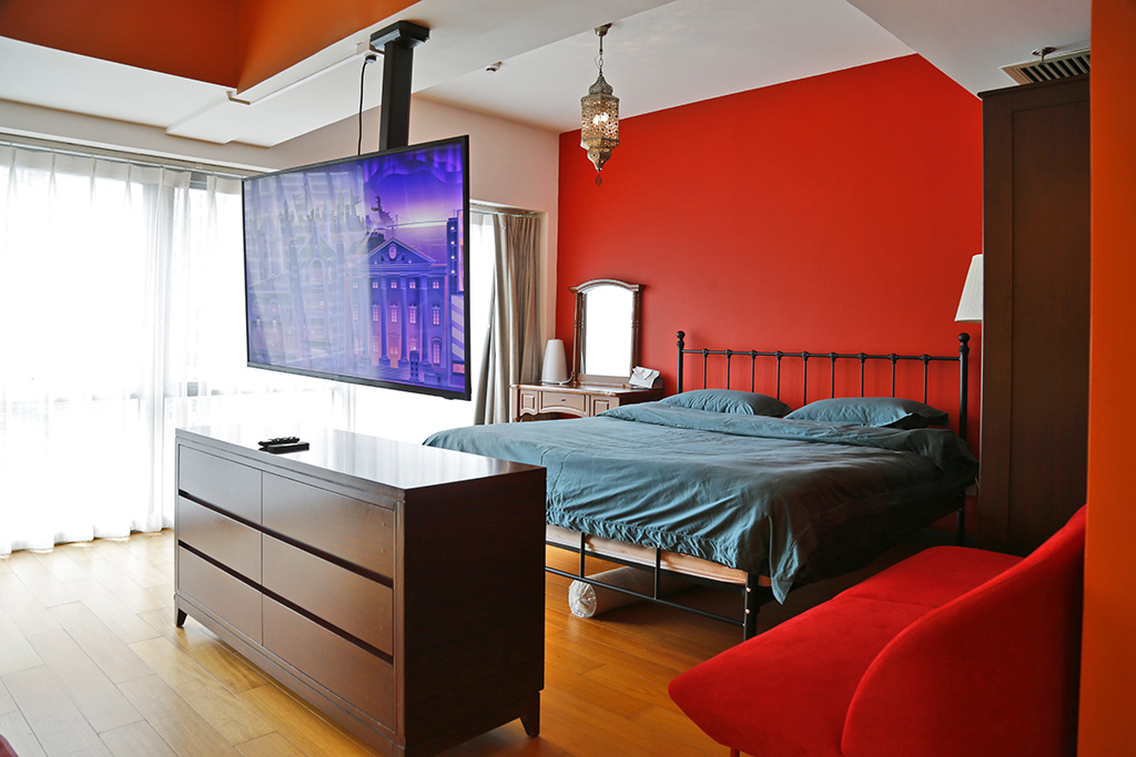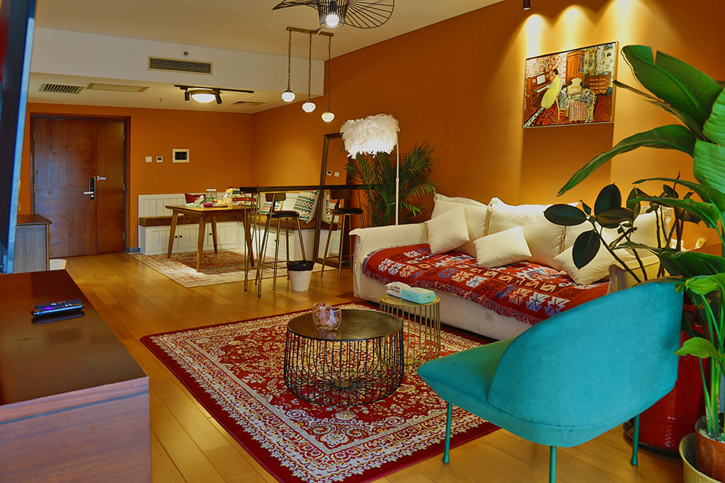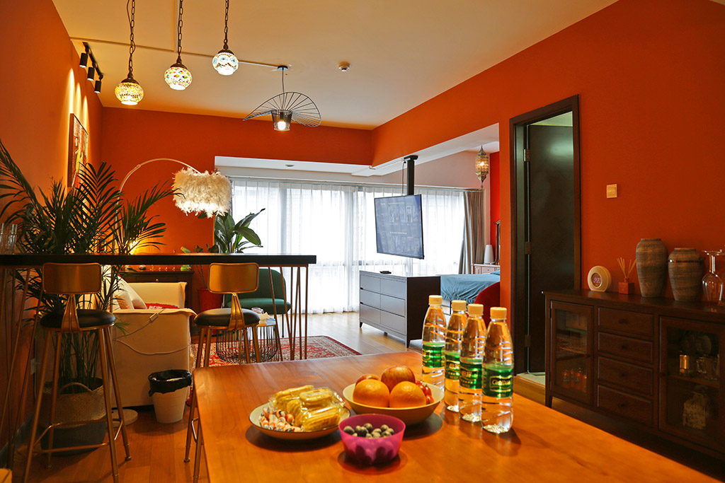 3、简约但不简单房间布置很简约,给人非常舒适的家一般的感觉。小茶几上摆放的绿植,不仅养眼,而且点缀了整个房间。除此之外,还有类似于榻榻米+小圆桌的休息区,让人眼前一亮。