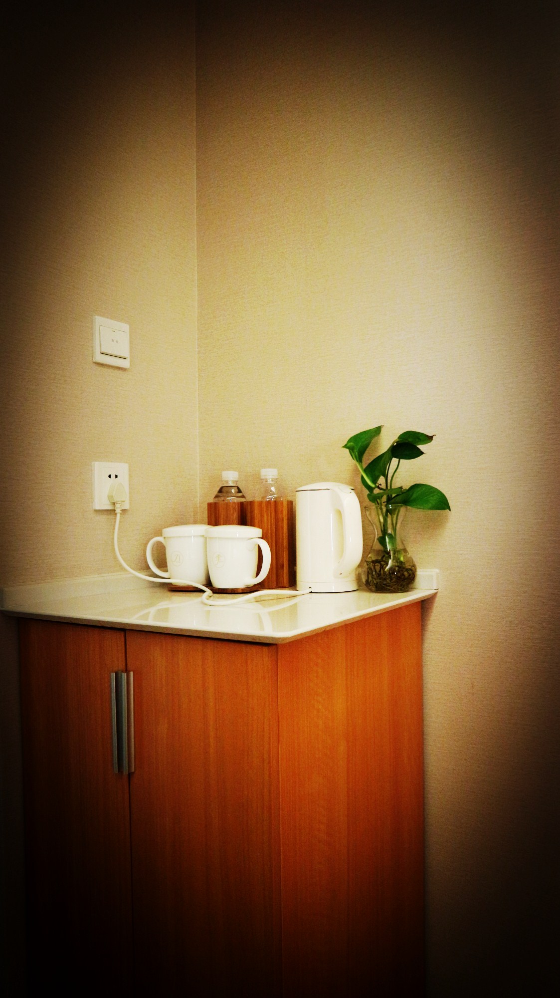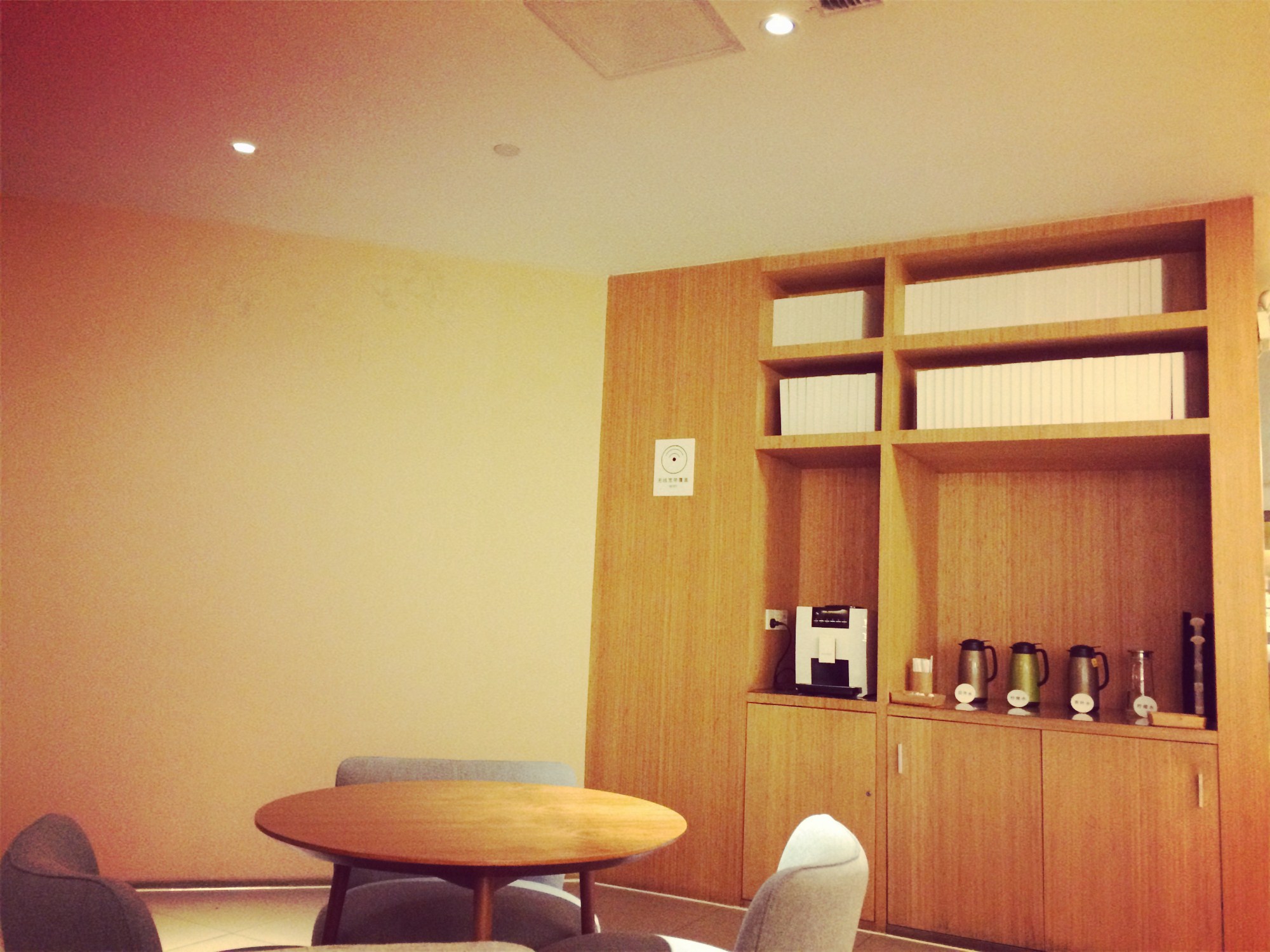 同时,这里还有一个mini水吧台,有几种不同口味的茶以及自助咖啡机,以满足不同人士的需求。