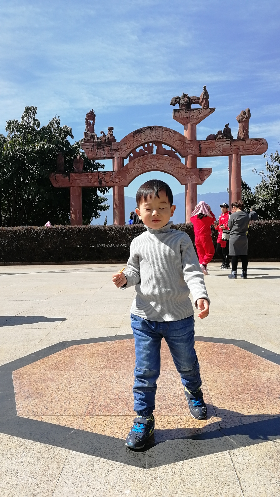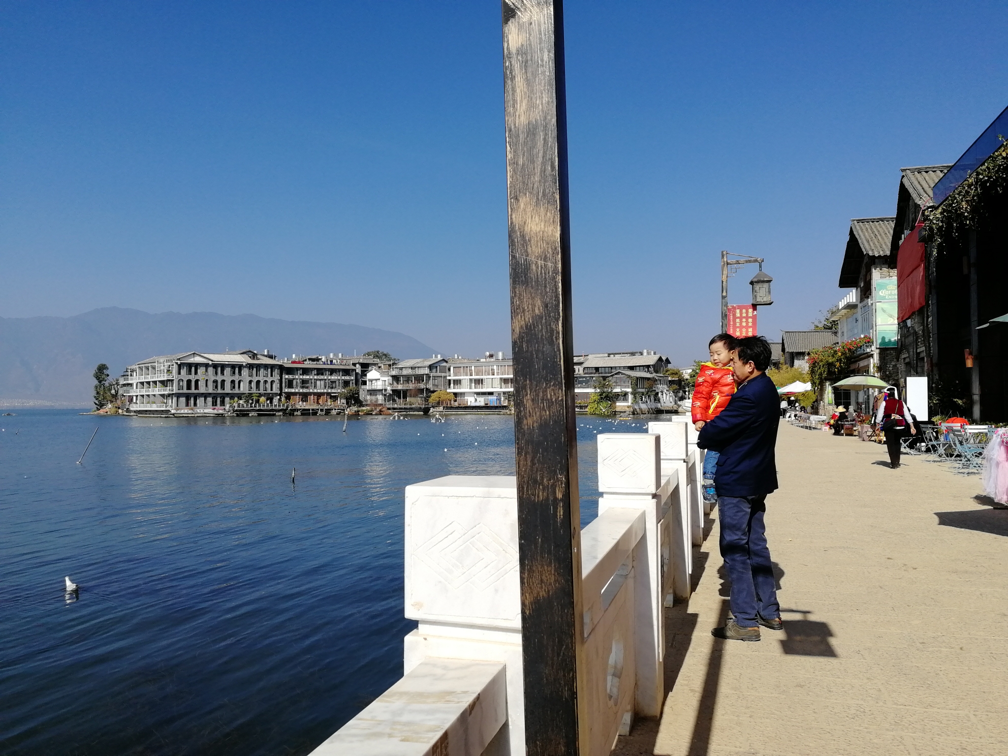 南诏风情岛和玉几岛之间有一条海街,也是美景拍照点,家婆一直很崇拜杨丽萍老师,所以我们两个人去玉几岛看太阳宫和月亮宫,粑粑和爷爷带着瑞瑞在海街坐着等我们。