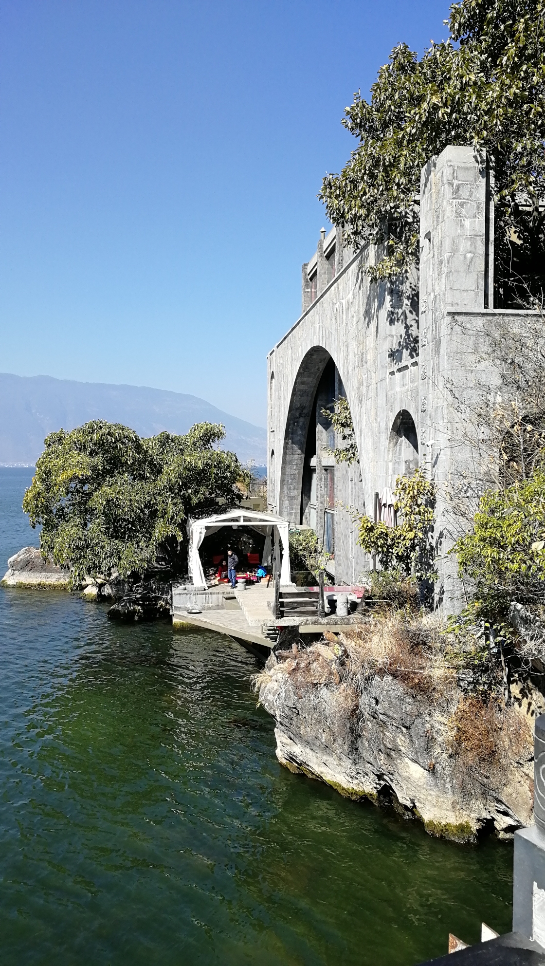 玉玑岛从海街走到底通过玉几桥再走到底就是玉几岛售票处,门票10元,好在有导游带着逛,也知道了月亮宫是杨丽萍老师的私人别墅,太阳宫是她建的酒店并非违建,营业十几年,由于洱海整治沿海客栈全部停业才关闭的。月亮宫被树挡住了看不到,其实在南诏风情岛也可以看到太阳宫。
