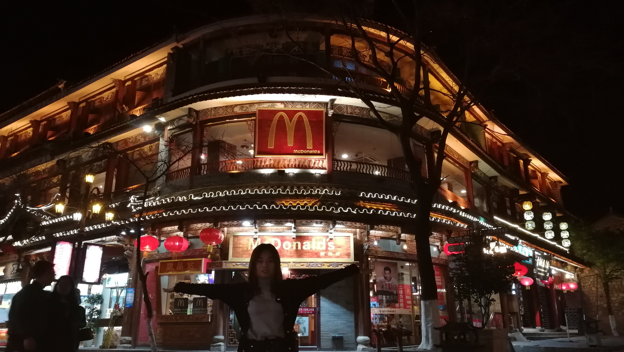 古城在麦当劳这里拍了照片就导航回客栈,路过洋人街牌坊。回到客栈23点。