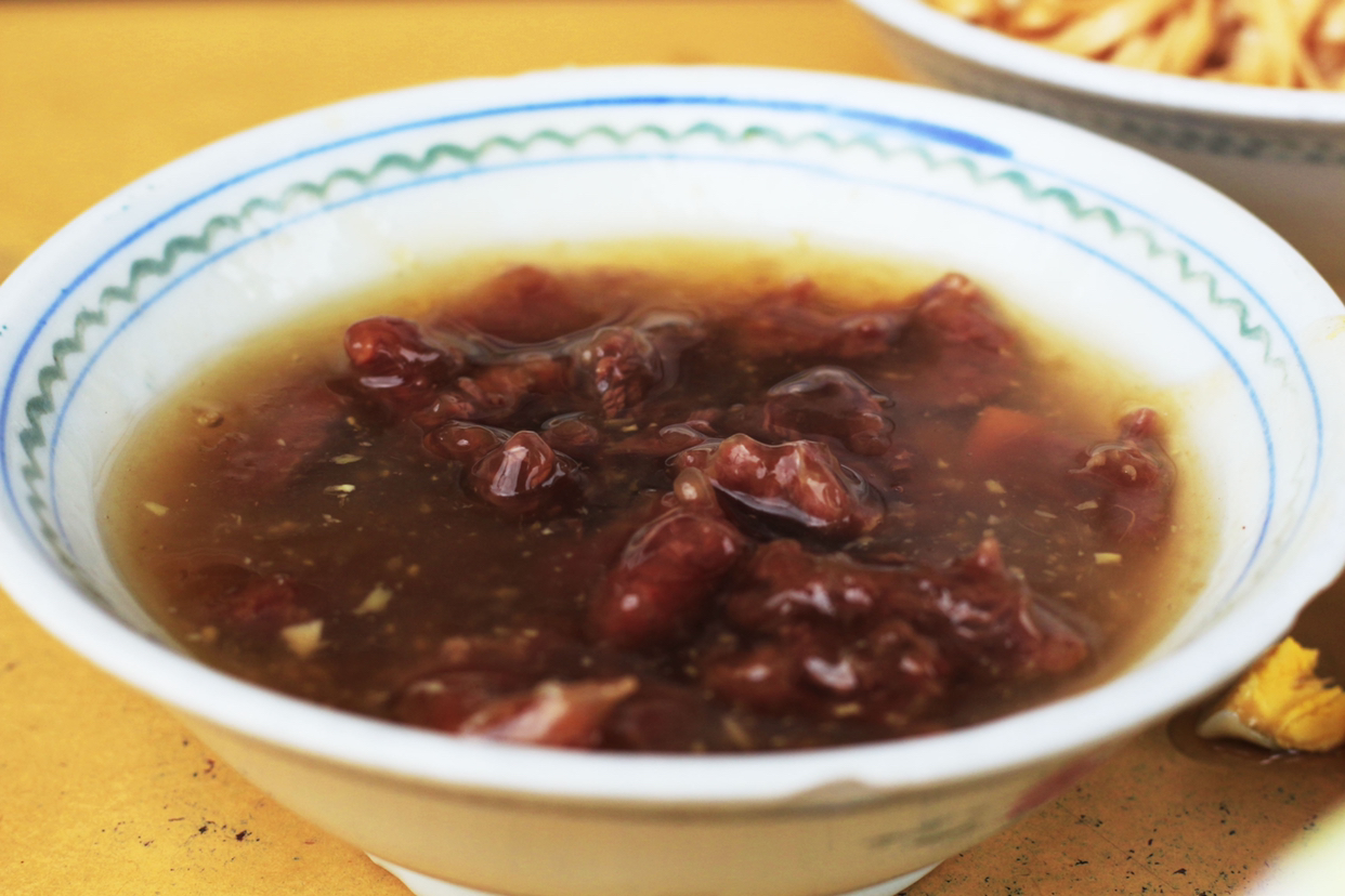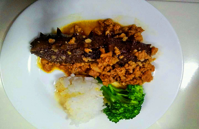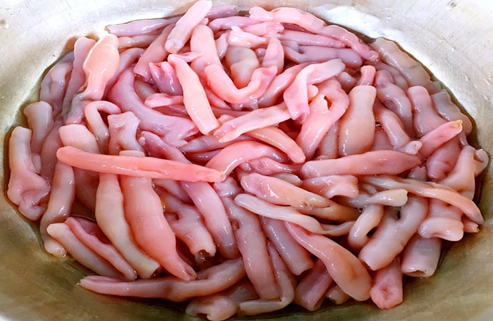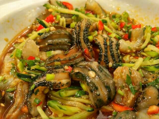 做法:海肠炒韭菜火候很要紧,火候老了咬不动,轻了不熟,第一要把海肠头有小刺刺的部分去掉,烧开水把海肠下锅后马上捞起,放花生油烧开先炒韭菜翻炒4-5下,放海肠加盐、少许生抽,加一点点醋,直接出锅即可