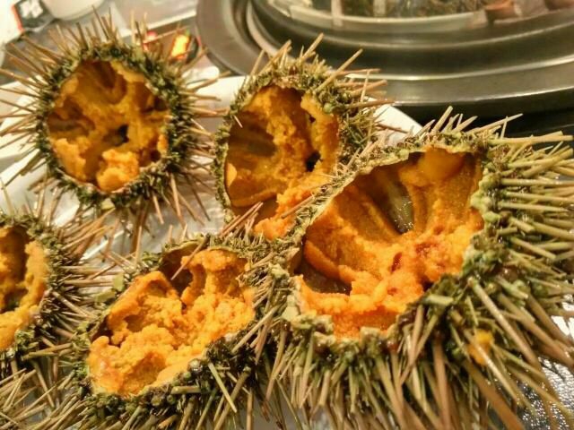 海胆,大连这边的海胆以前在我小的时候,还是紫黑海胆多些,现在也出现了很多别的品种。或许是出于养殖成本和市场的需求,现在紫黑海胆反而不多见了。我个人还是喜欢直接生食紫黑海胆,因为它更加的肥美,相比其他种类的海胆,它的味道也更加鲜甜一些。海胆蒸蛋,海胆刺身,海胆盖浇饭,海胆豆腐汤,也都是我很喜欢的做法,如果大家有机会来大连,一定要试试哦。
