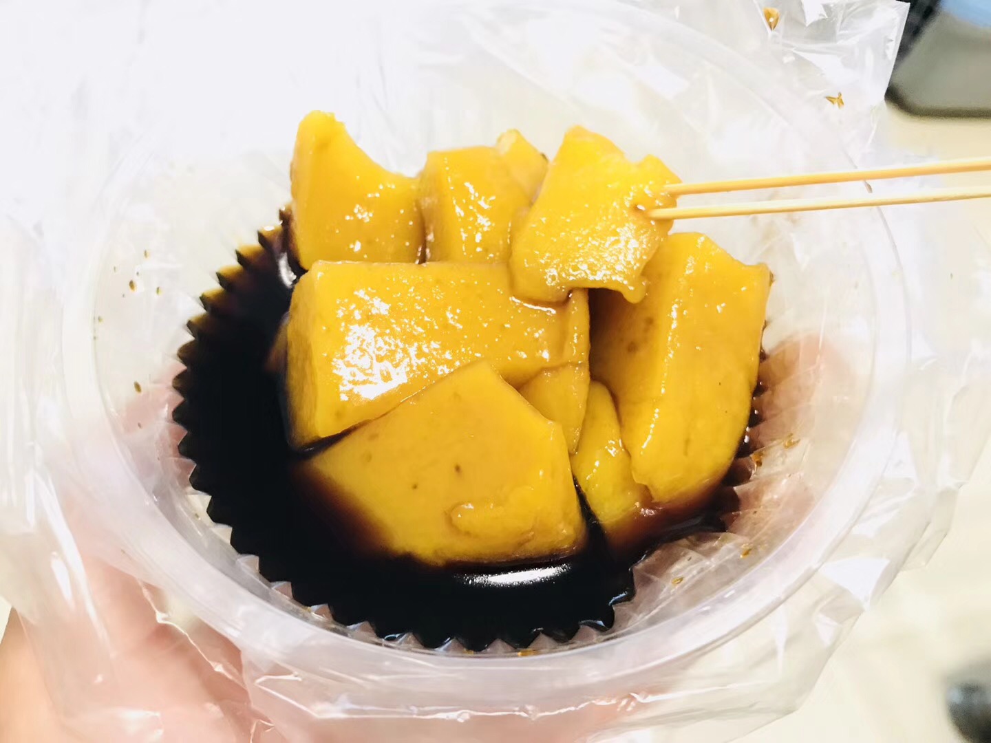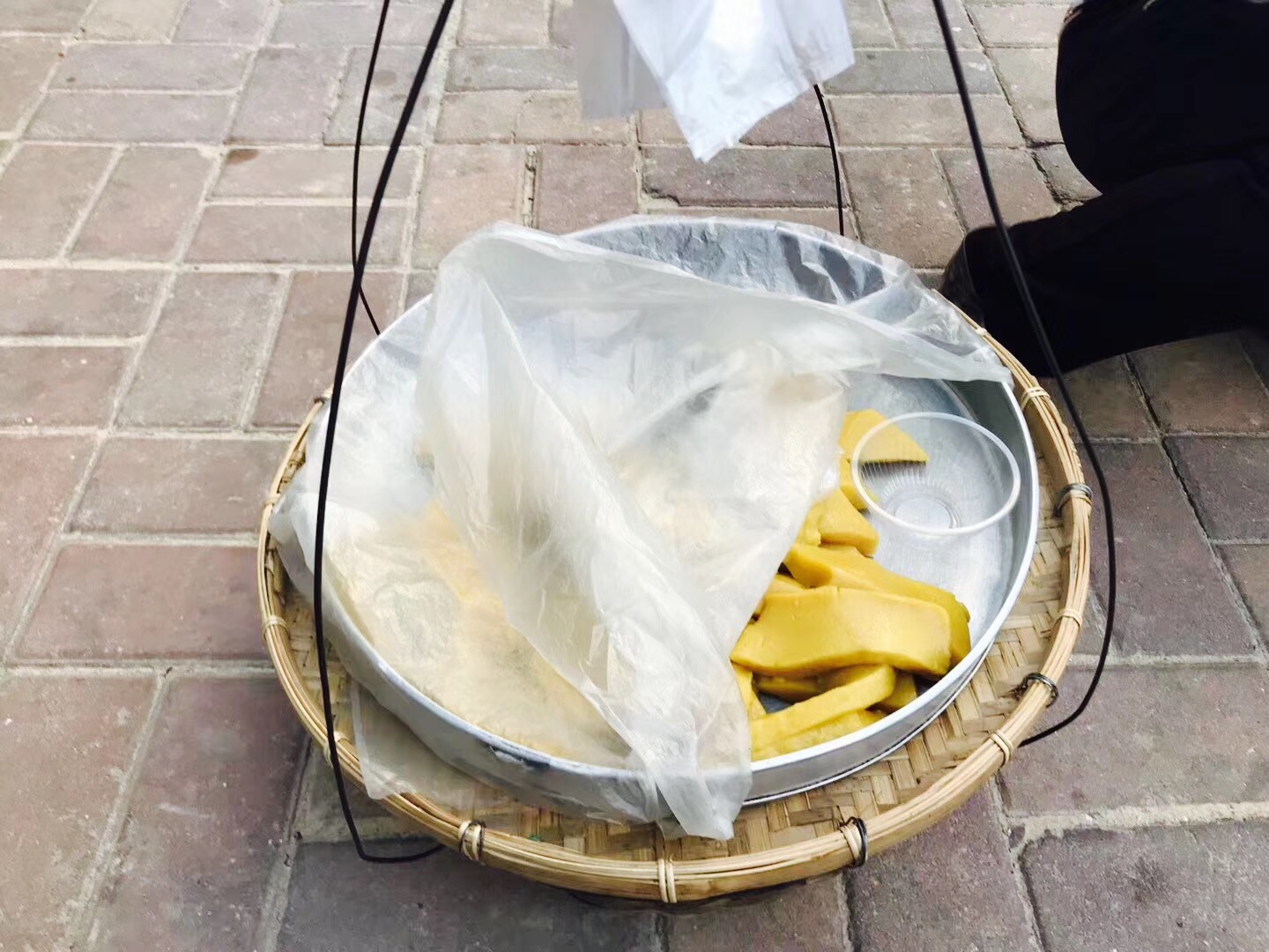 街上偶尔会有阿姨挑着担子卖糕点,黑色是的红糖酱,蘸着酱料吃味道还挺好吃的。