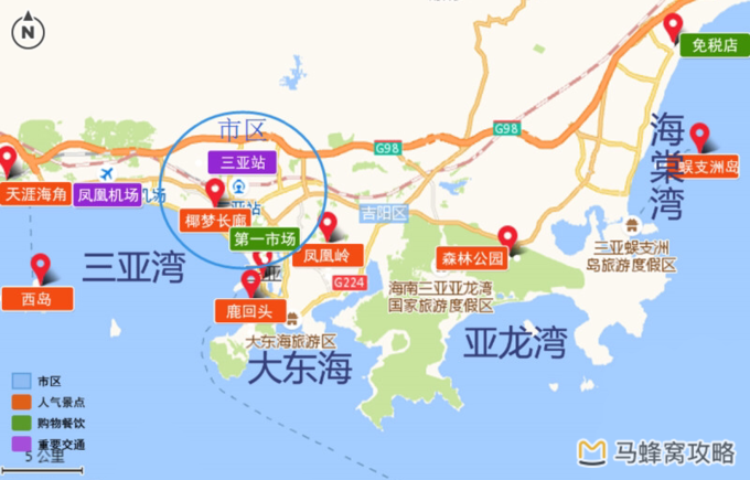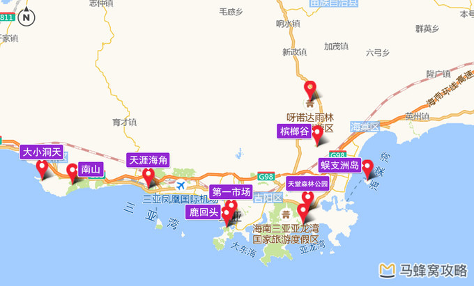 市全景的唯一佳处。 鹿回头公园山顶因有鹿的雕塑而出名,站在鹿回头公园山顶,可以看到南海上的东岛和西岛。鹿回头的定位是情爱文化和生态展示并重的主题公园,主要景点包括顺风台、鹿苑、滑道、紫气东来、情爱文化园、黎族歌舞表演、鹿回头雕塑、山顶花园、北亭观景台等。