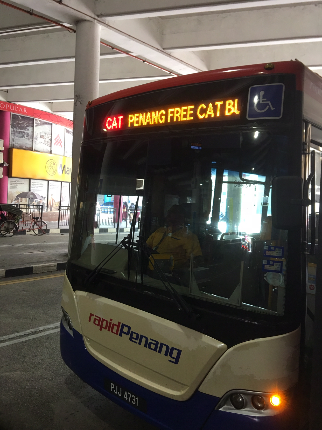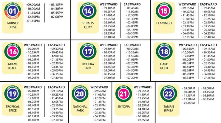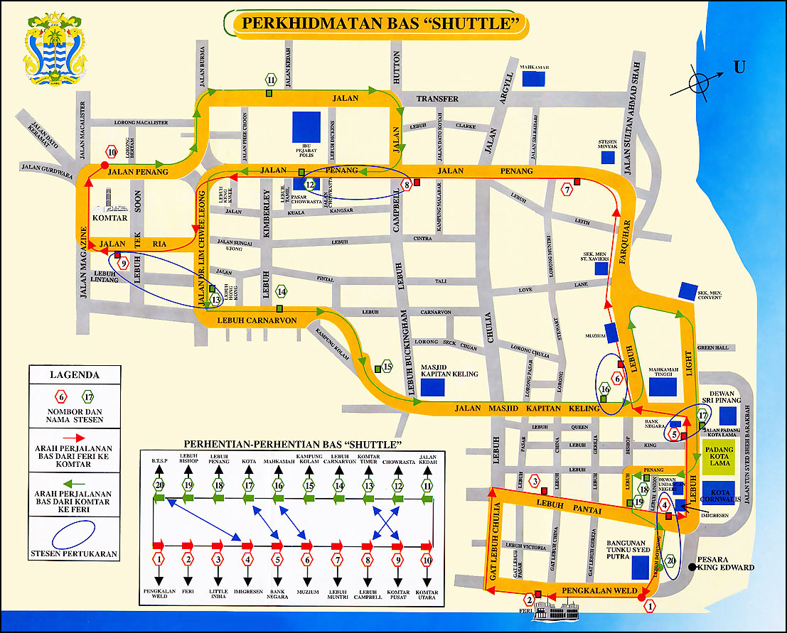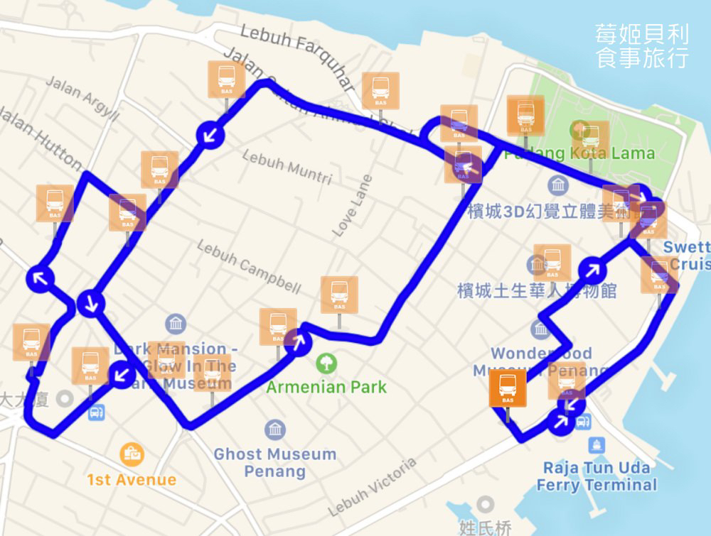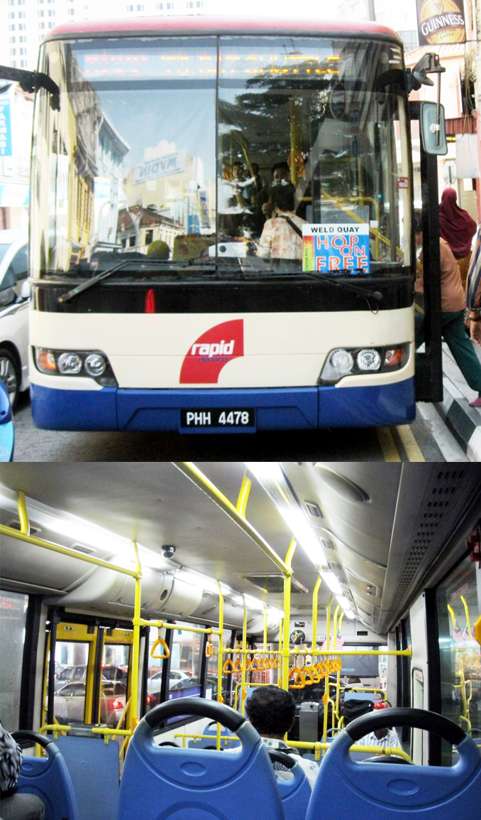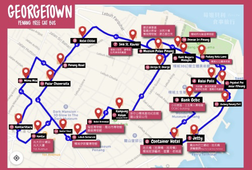 想要在世界遗产区逛逛的旅人,不妨考虑免费的观光巴士– Rapid Penang CAT (Penang hop on free central area transit);巴士一共有19站,可以任意上下车,每一站都有著名的乔治市的缴点可以参观;班次的间隔时间约为10-15分钟! 尽管每一站都有站名,但是站名不重要,只要把数字号码给记住就行了。搭乘免费观光巴士的人蛮多的,不只是观光客,本地人也会利用这项免费服务前往巴士总站,所以多数人都会在第十站 Komtar Pusat 下车。