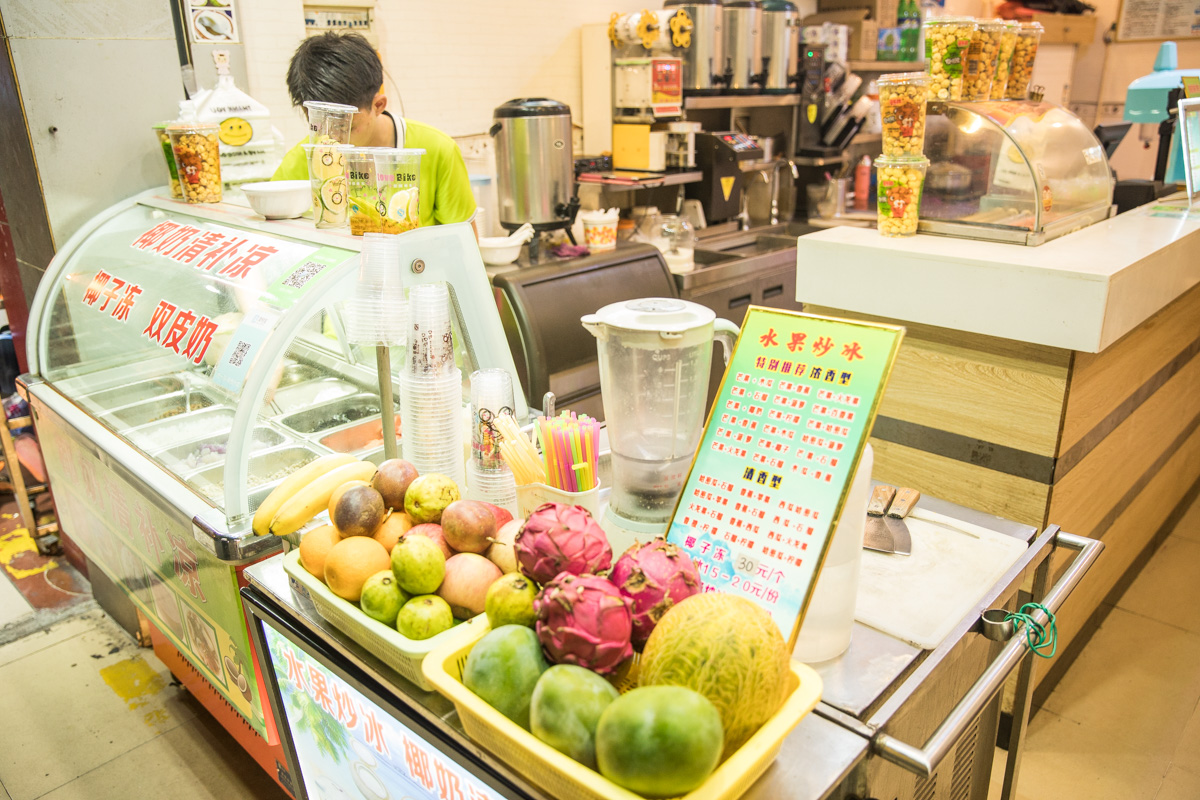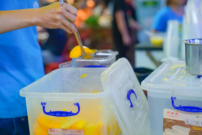哈尼果茶吧前面就是一个水果炒冰摊了,常见的炒冰有 哈密 瓜、火龙果、芒果、番石榴的,每一种炒冰都保留自己本有的颜色,炒制出来非常好看。