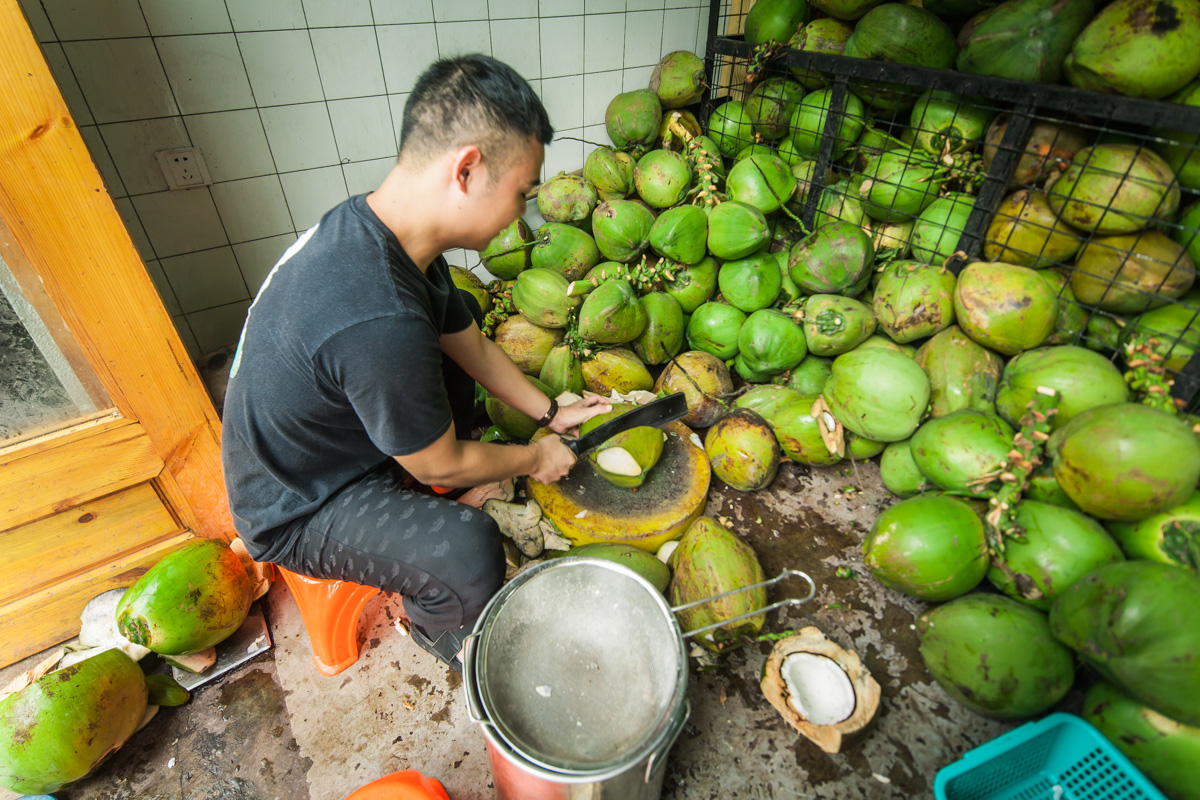 嗲嗲的椰子鸡入口处堆放着数百个新鲜的椰子,店里的服务员将椰子两头砍去,挖出一个小孔,将椰汁倒入一旁的桶里。我还在好奇为啥不直接将椰汁倒入锅内,那样更有仪式感一些,而要多次一举再处理。后来经店家解释才明白,原来,纯椰汁作汤底,甜度太高,影响口感,需要按一定比例兑些水,这样才能保持最佳口味。