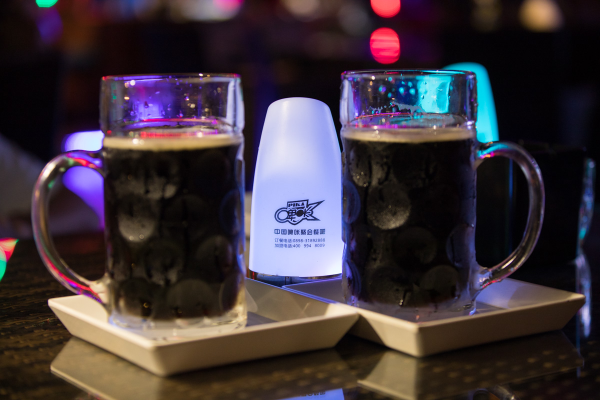 中国啤咔聚会餐吧由于我们来的时候已经饱餐了一顿了,所以就直接点了两杯黑扎啤和一杯果汁。酒杯下的夜色格外迷人。