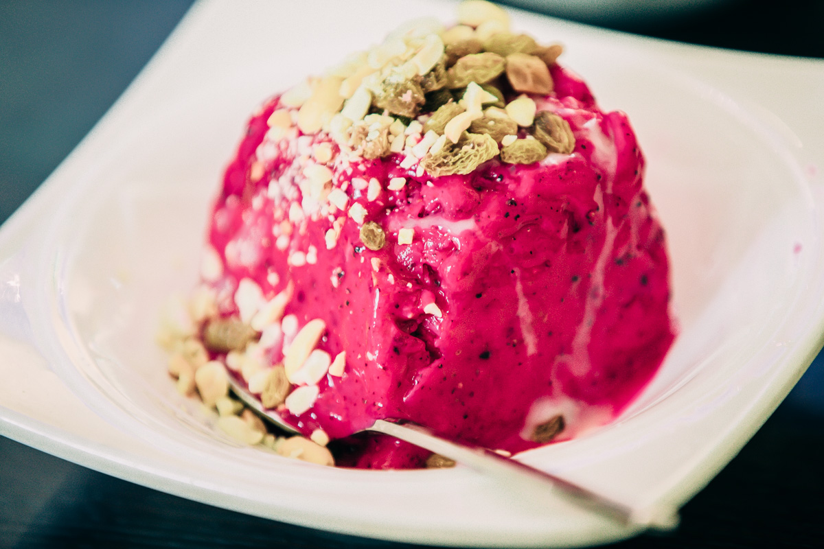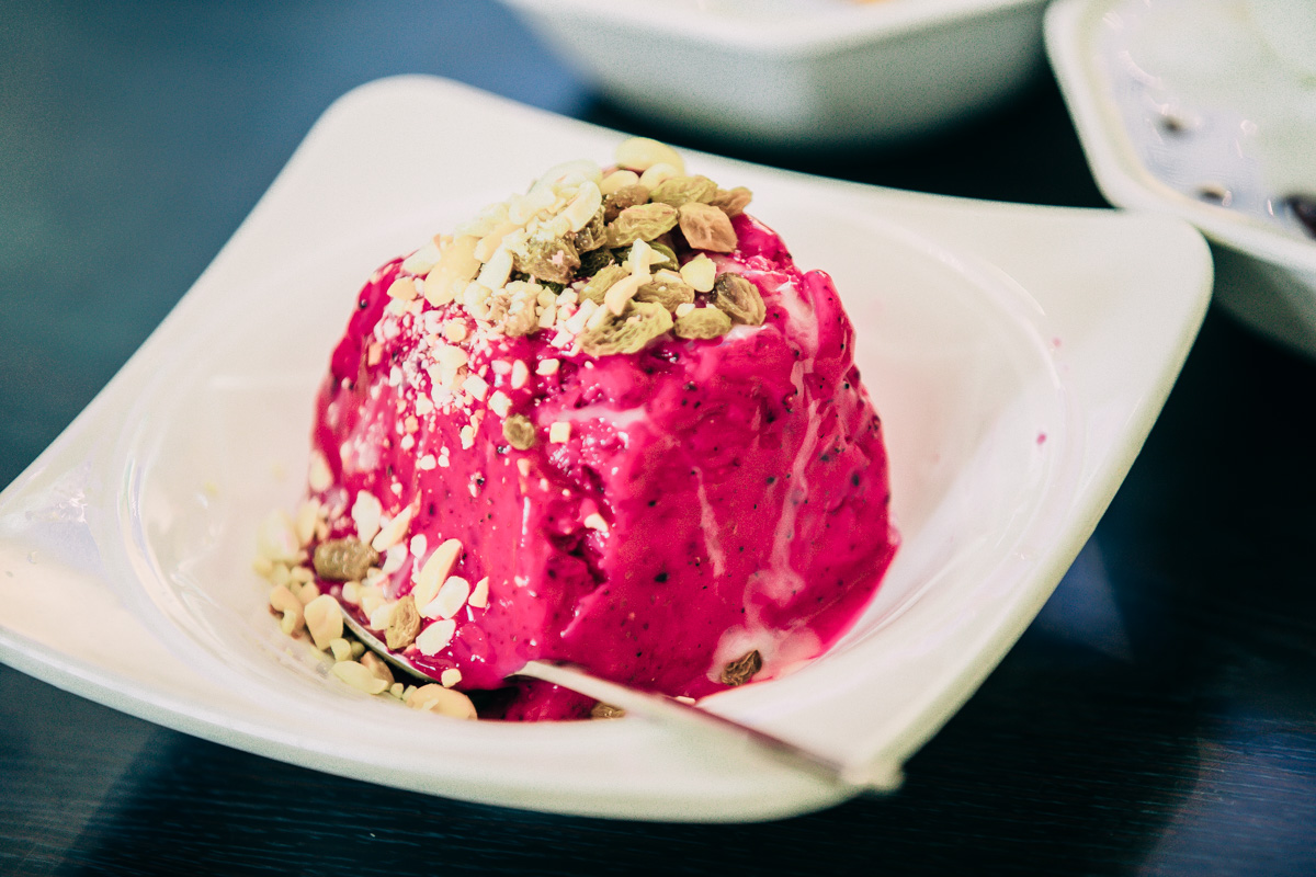 郑阿婆椰奶清补凉或许是容器原因,这里的水果炒冰看上去分外诱人。我们点了火龙果炒冰,玫红色的炒冰放置了一小会,略略有些融化,令表面更显 光泽 。顶端洒了些花生碎和提子干做点缀,挖上一勺,很绵密的口感,似乎能货真价实的感受到水果的新鲜度!配上香脆的花生和酸甜可口的提子干,口感很赞。
