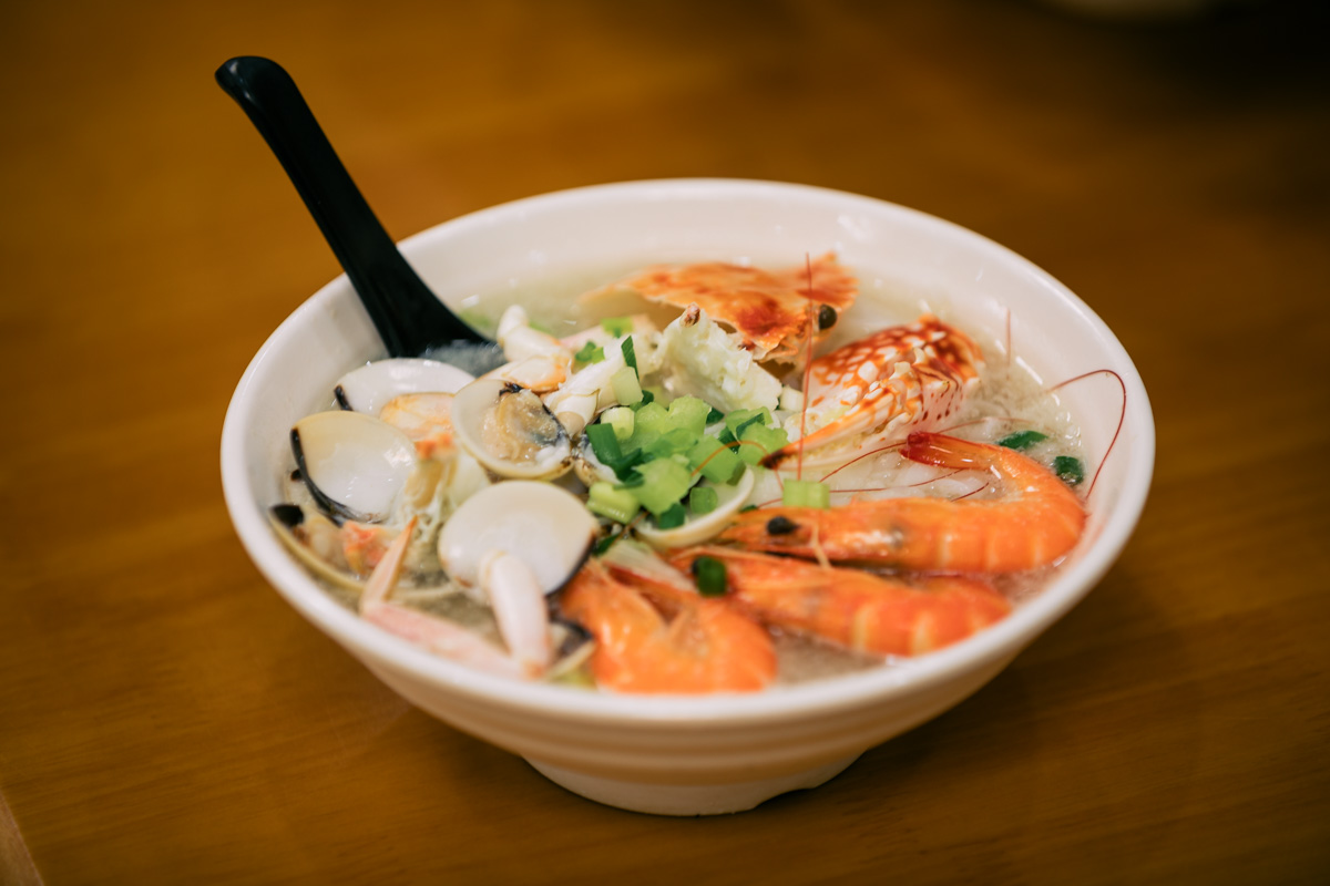 老粉记店我们点了抱罗粉和海鲜粉。海鲜粉的售价会贵一些,我原本以为海鲜粉里只是放几个贝类,但店家加了数只大虾,还放了两个蟹钳,而且海鲜都很新鲜干净!配上精心熬制的猪骨汤,加入调味的芹菜碎,色香味俱全。这一碗海鲜粉的确诚意满满,性价比很高。