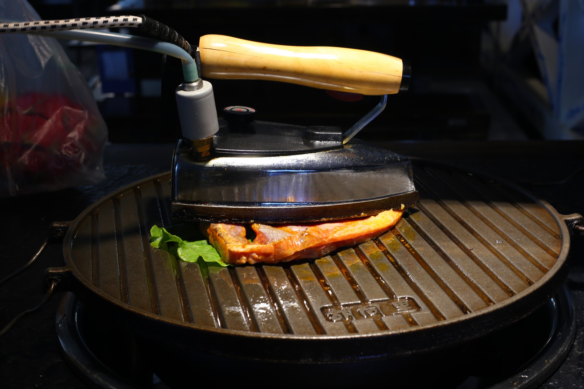 他们家最大的特色就是熨斗牛排,来一次是绝对不能错过的。感觉用的应该是比较嫩的部位的牛仔骨。端上生的牛肉来以后,小妹把电熨斗拿过来,特意询问你们要录像吗?哈哈我说不用,我只看抖音,不拍的,只拍照就好了,随后小妹一边用电熨斗烤制牛排,一边喊出一连串的吉祥话。