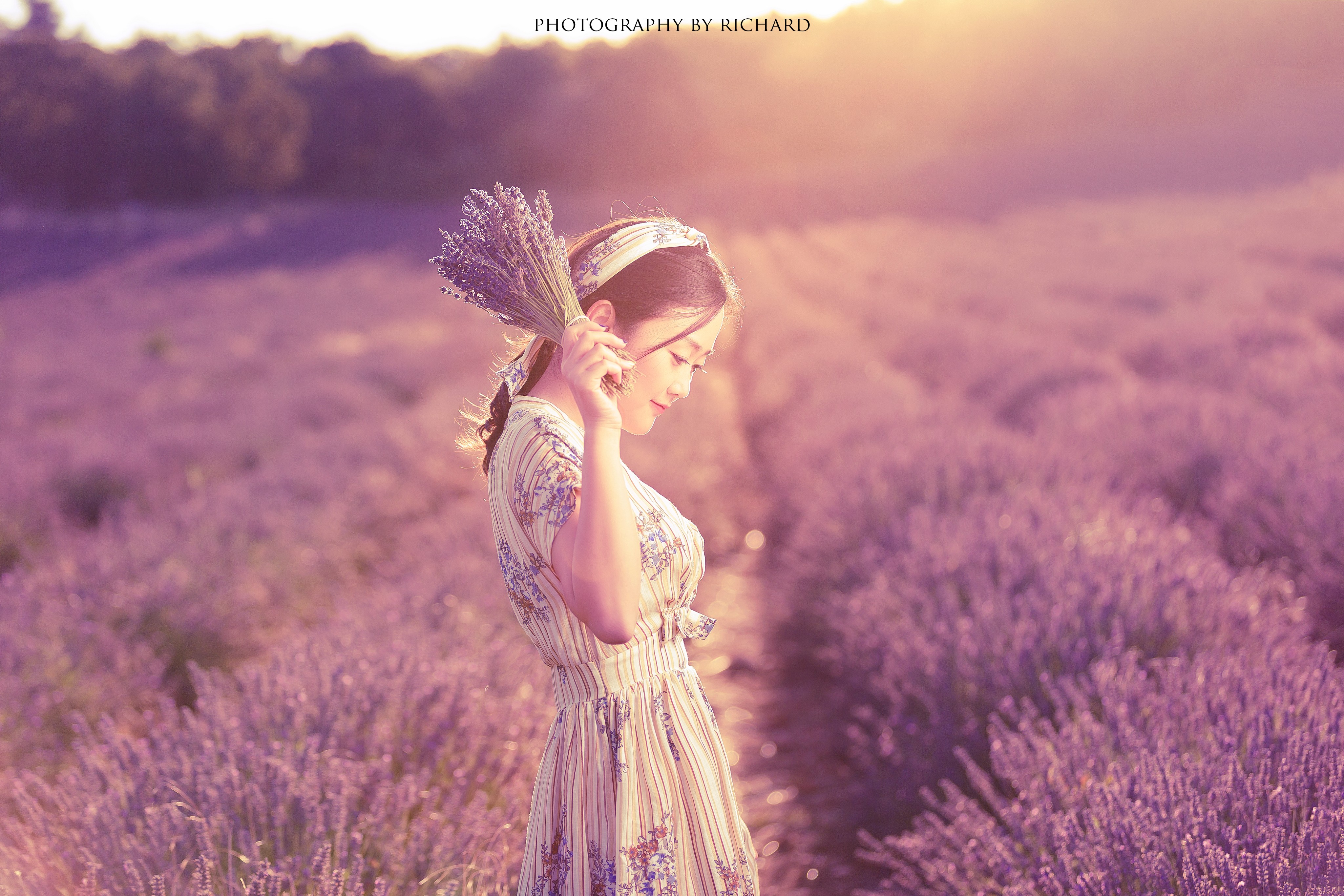 2、在自然风光中选择与花草相搭配的颜色和样式。如薰衣草为紫色,选择的裙子上有紫色花的图腾就比较应景。