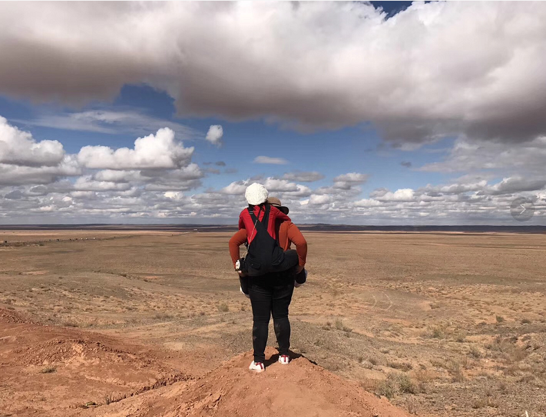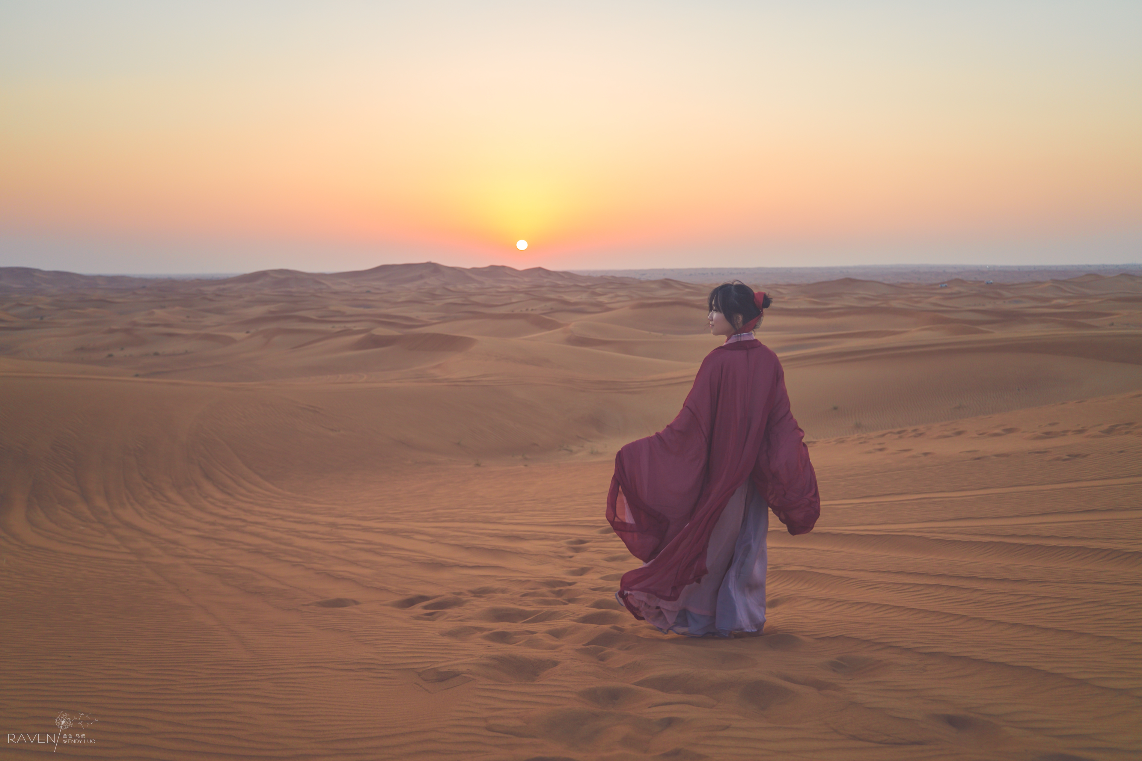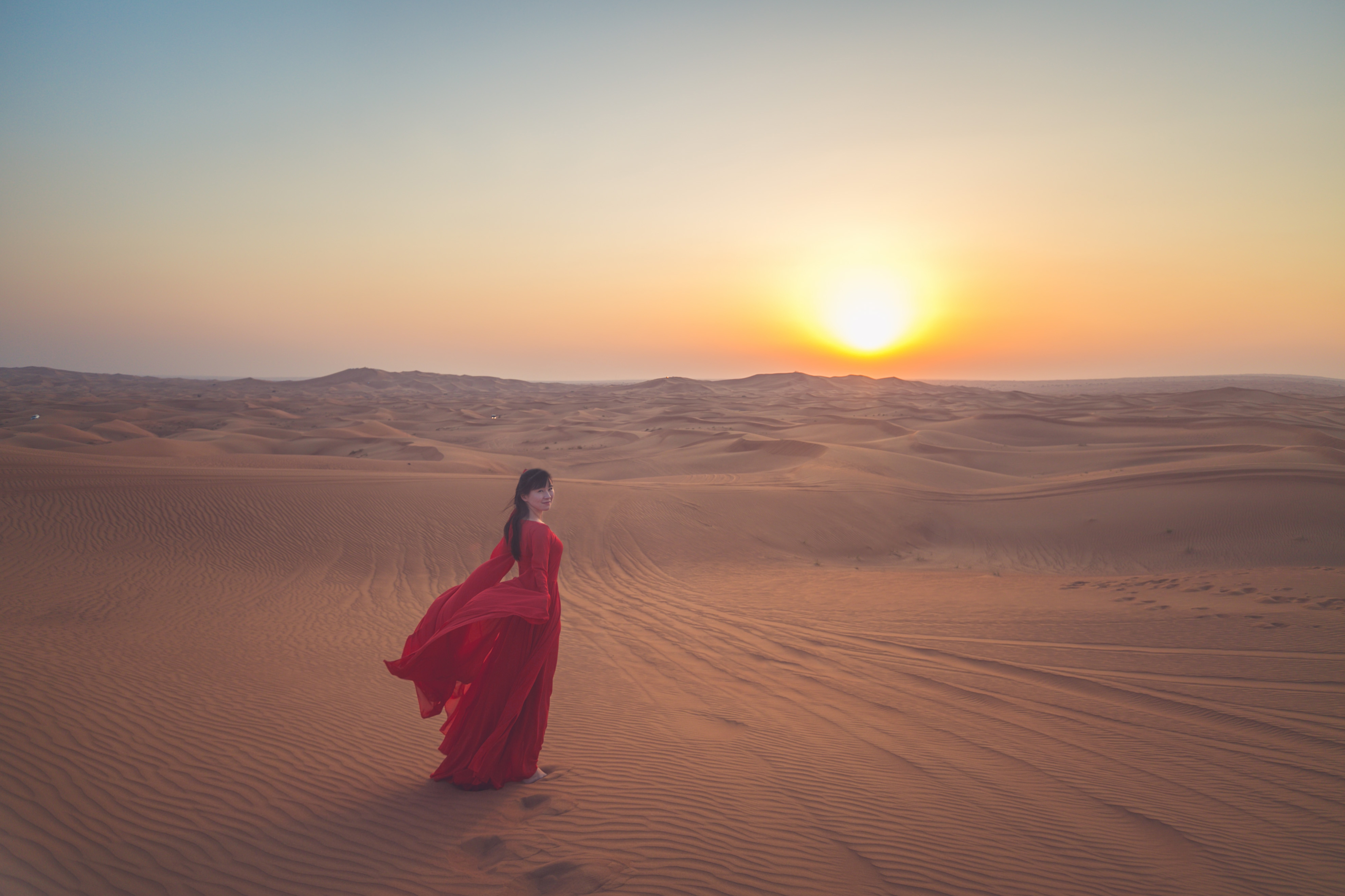 在腾格里沙漠,穿越露营,一起沙雕的穿着裙子滑沙。