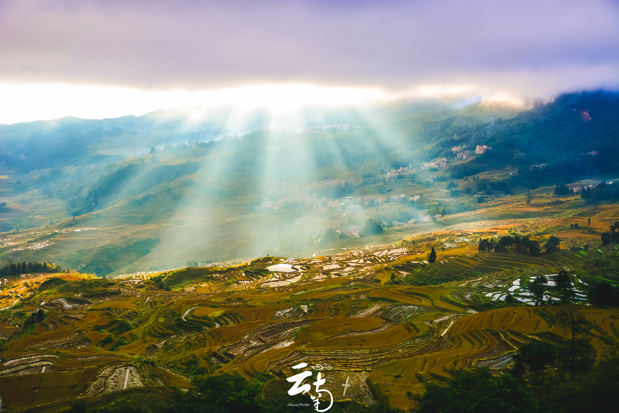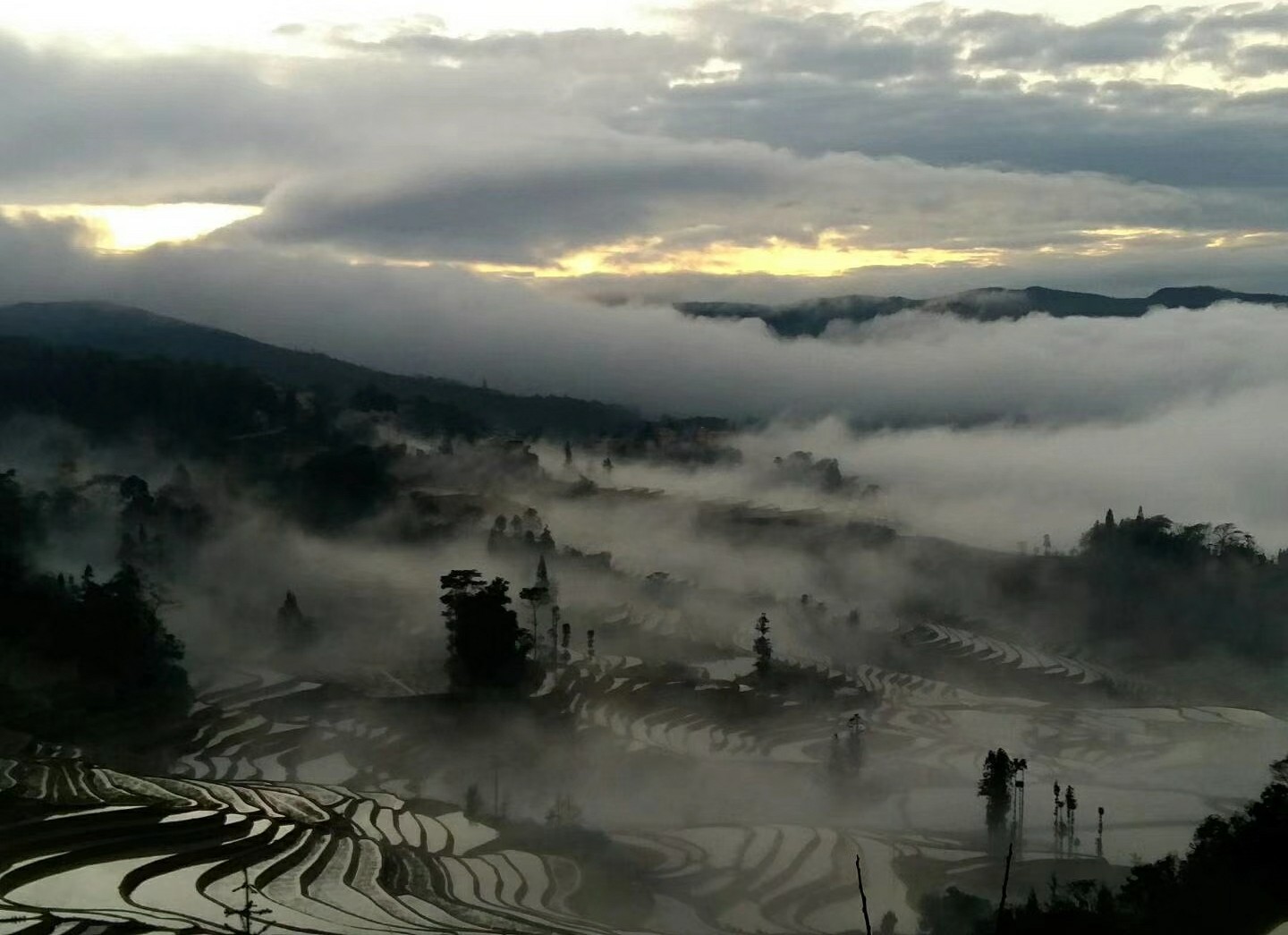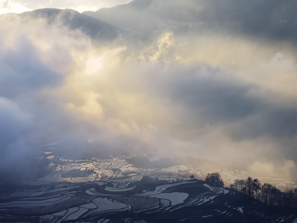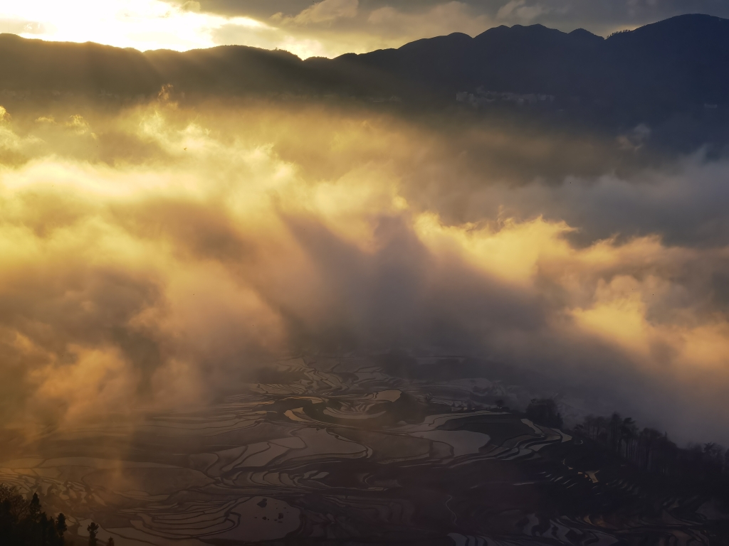 多依树的云海奇观,起初只是微弱的耶稣光从天而降,照在梯田池塘中反射出耀眼的光芒,紧接着山间的云雾突然产生,并迅速向中央聚拢,稍后随之散去——整个过程虽不如GIF图片中那样迅速,但同样一气呵成、让人大呼过瘾,为大自然的神秘莫测所彻底折服。