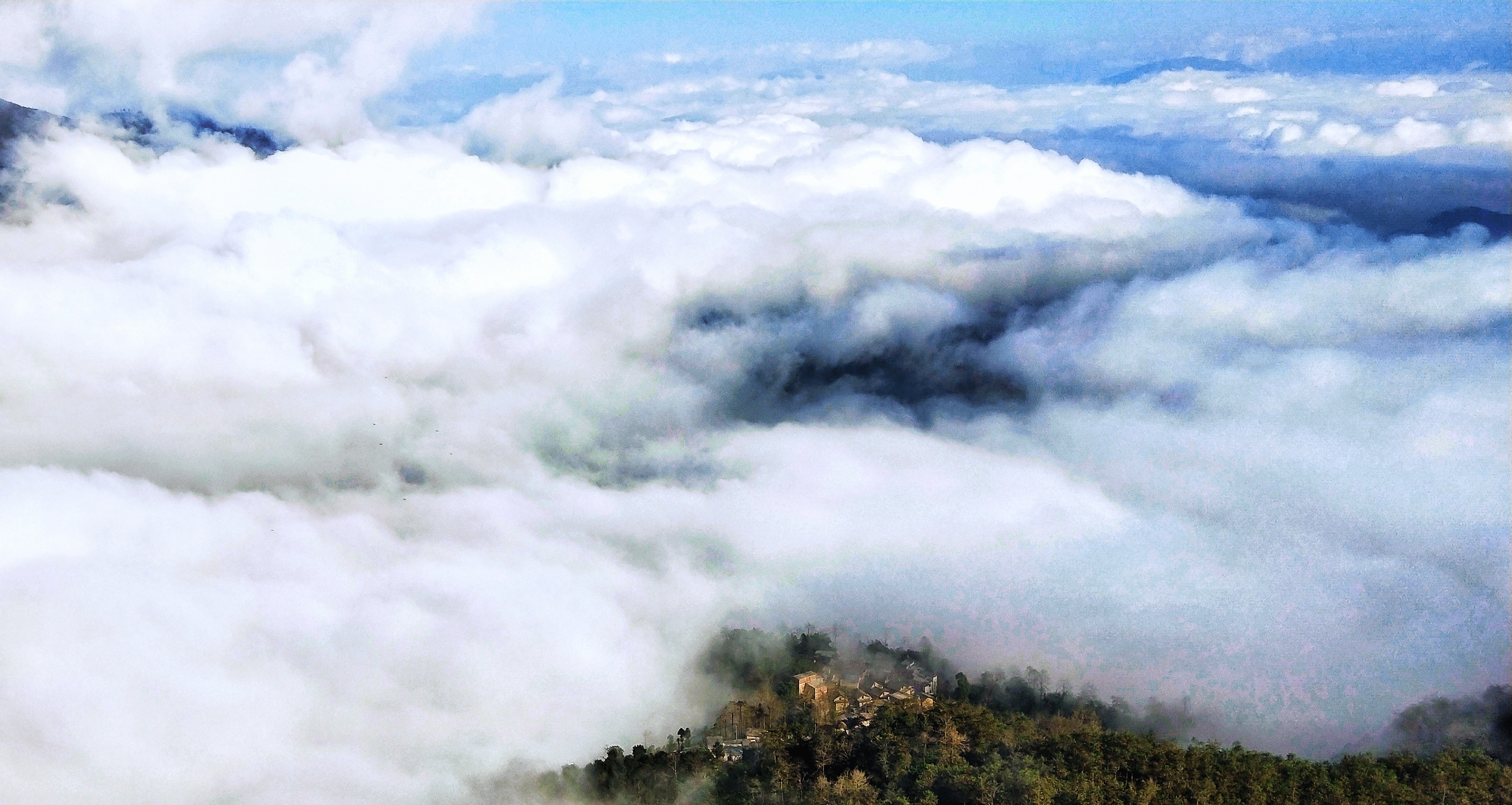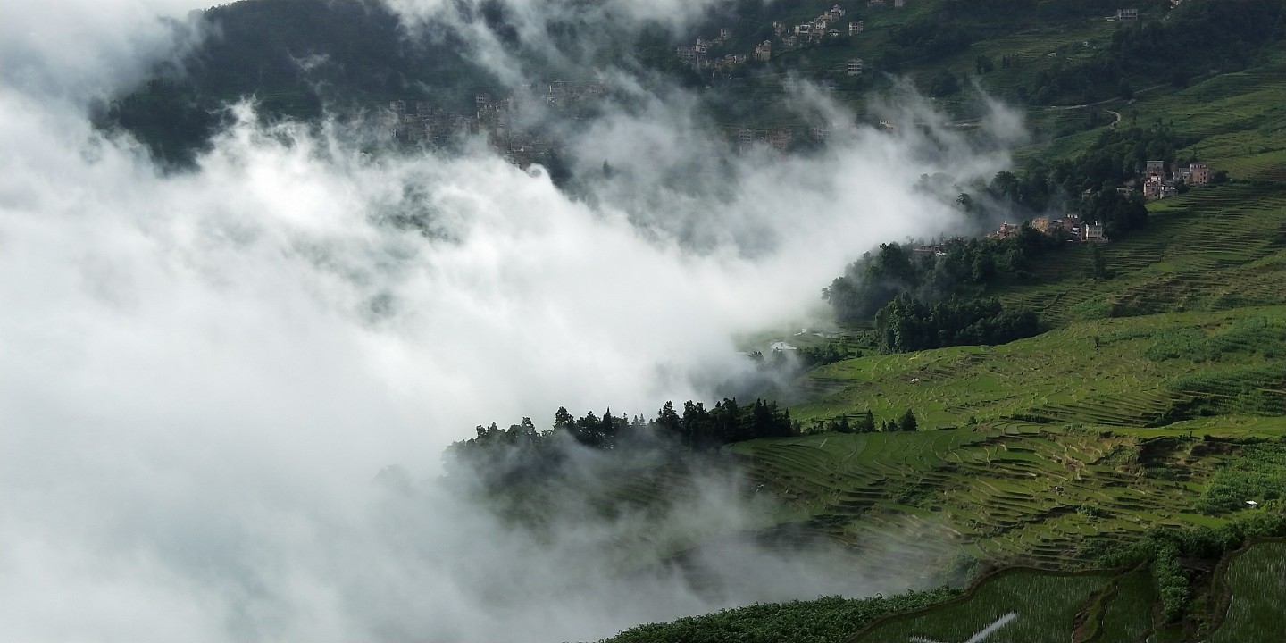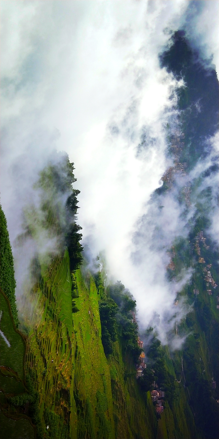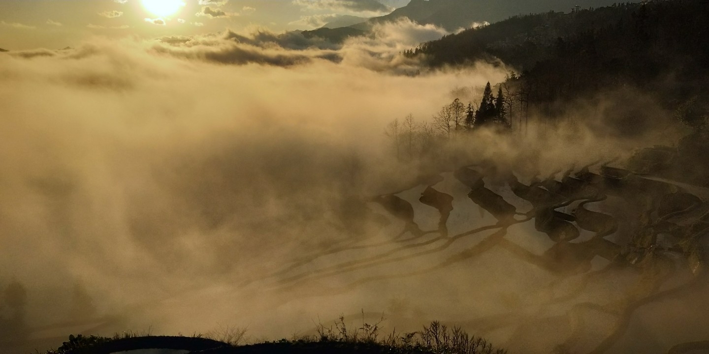 多依树的云海奇观,起初只是微弱的耶稣光从天而降,照在梯田池塘中反射出耀眼的光芒,紧接着山间的云雾突然产生,并迅速向中央聚拢,稍后随之散去——整个过程虽不如GIF图片中那样迅速,但同样一气呵成、让人大呼过瘾,为大自然的神秘莫测所彻底折服。