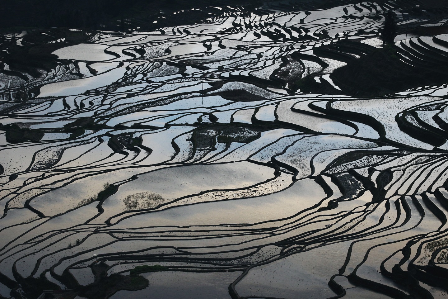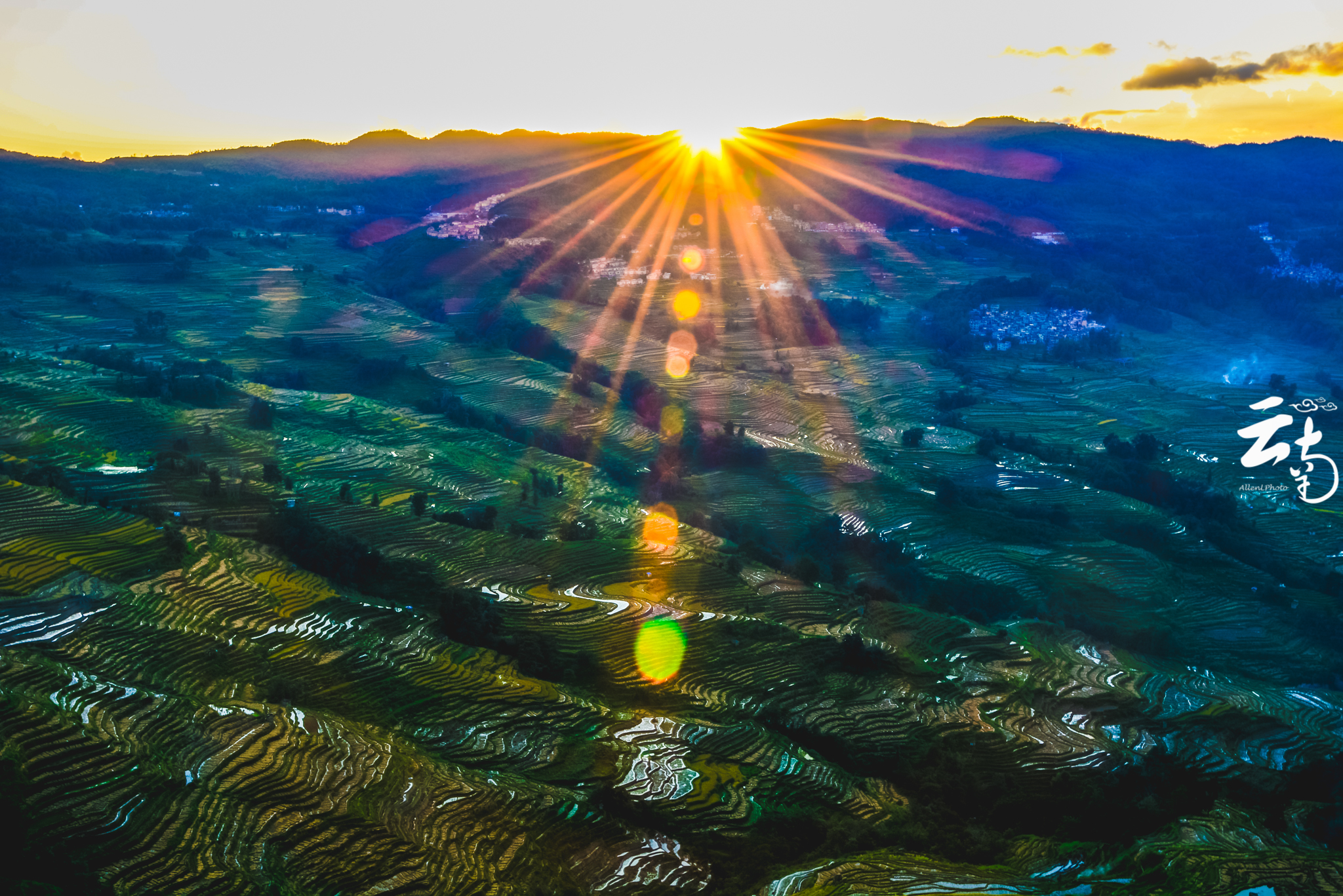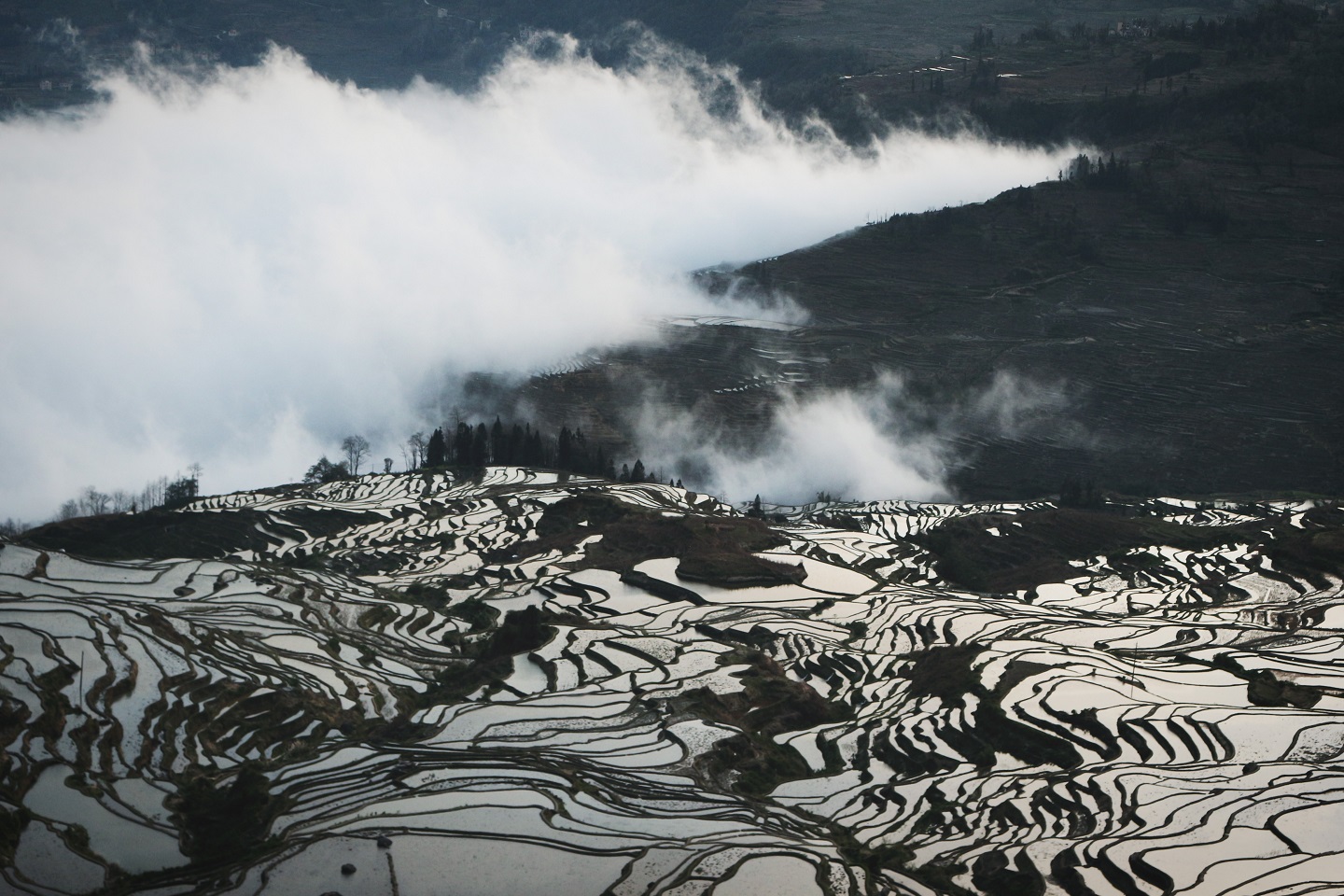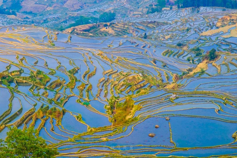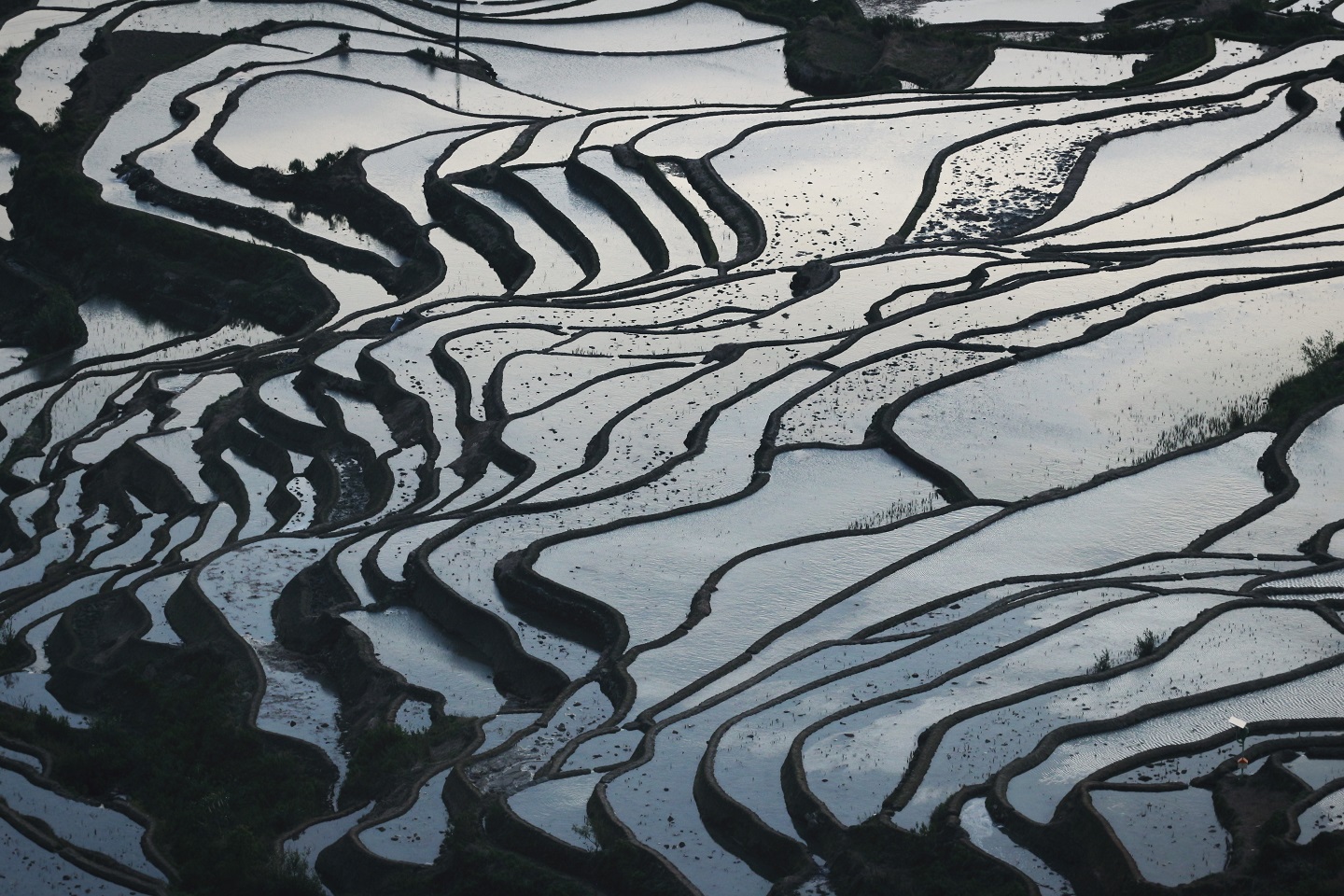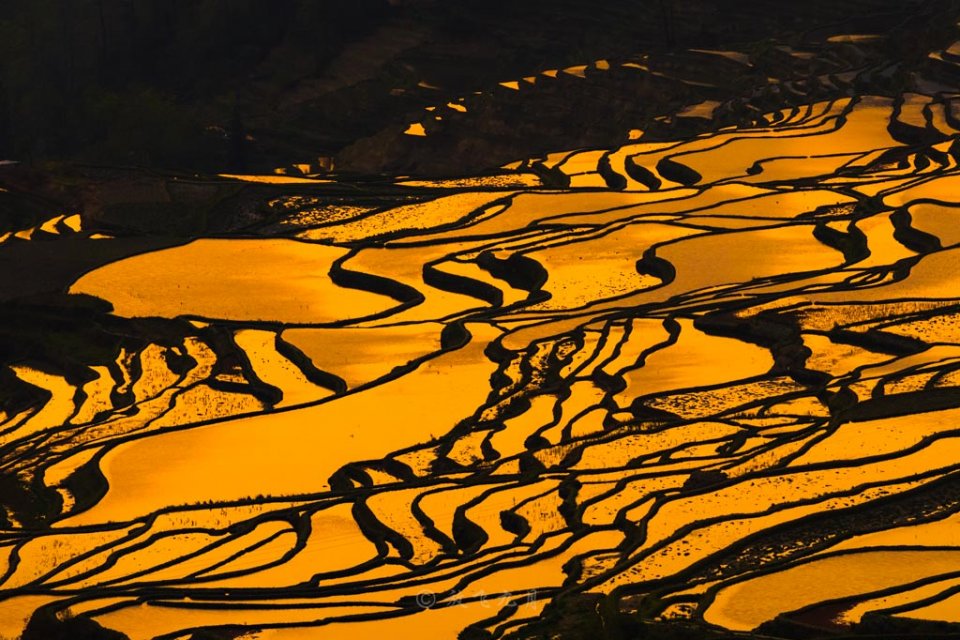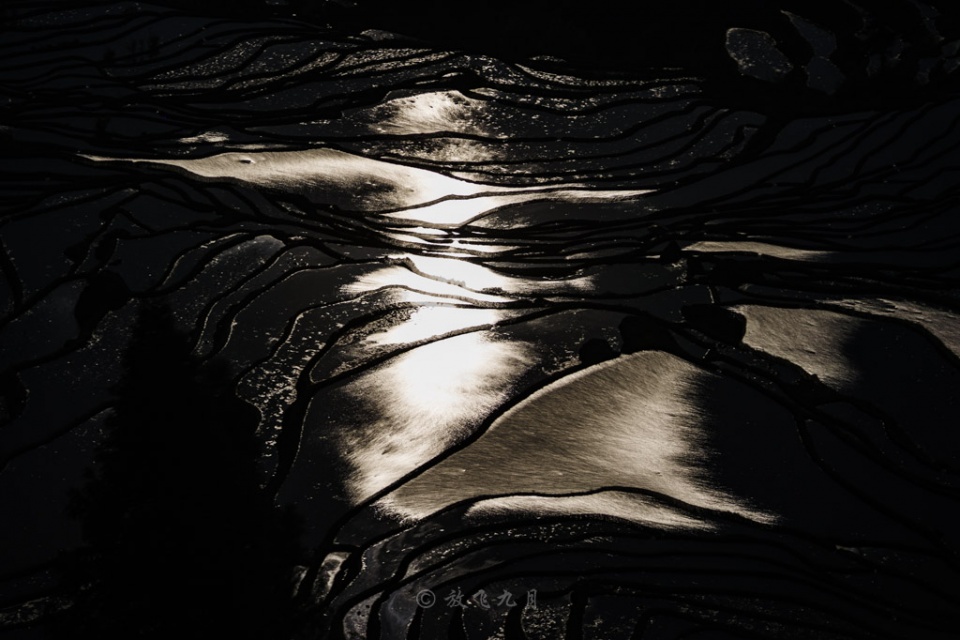 梯田的最佳拍摄时间是每年12月至来年的3月下旬,但要说最美的,还是1-2月之间。梯田被灌满水用来涵养土地,而稻苗还没有被插上。于是,层层的梯田银波荡漾,像极了一块块精美的玻璃,更像是大地山川挥就的一幅泼墨山水。