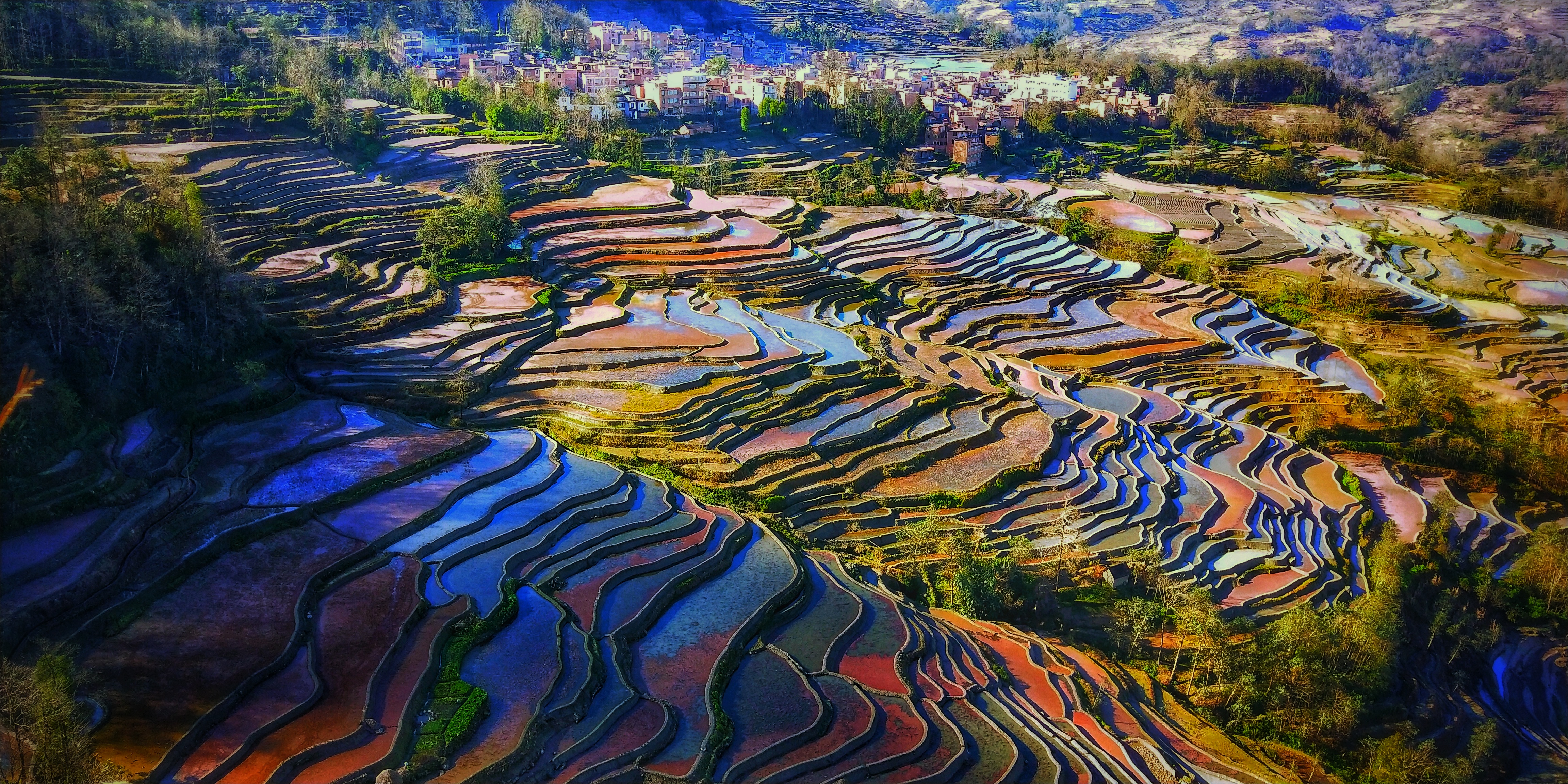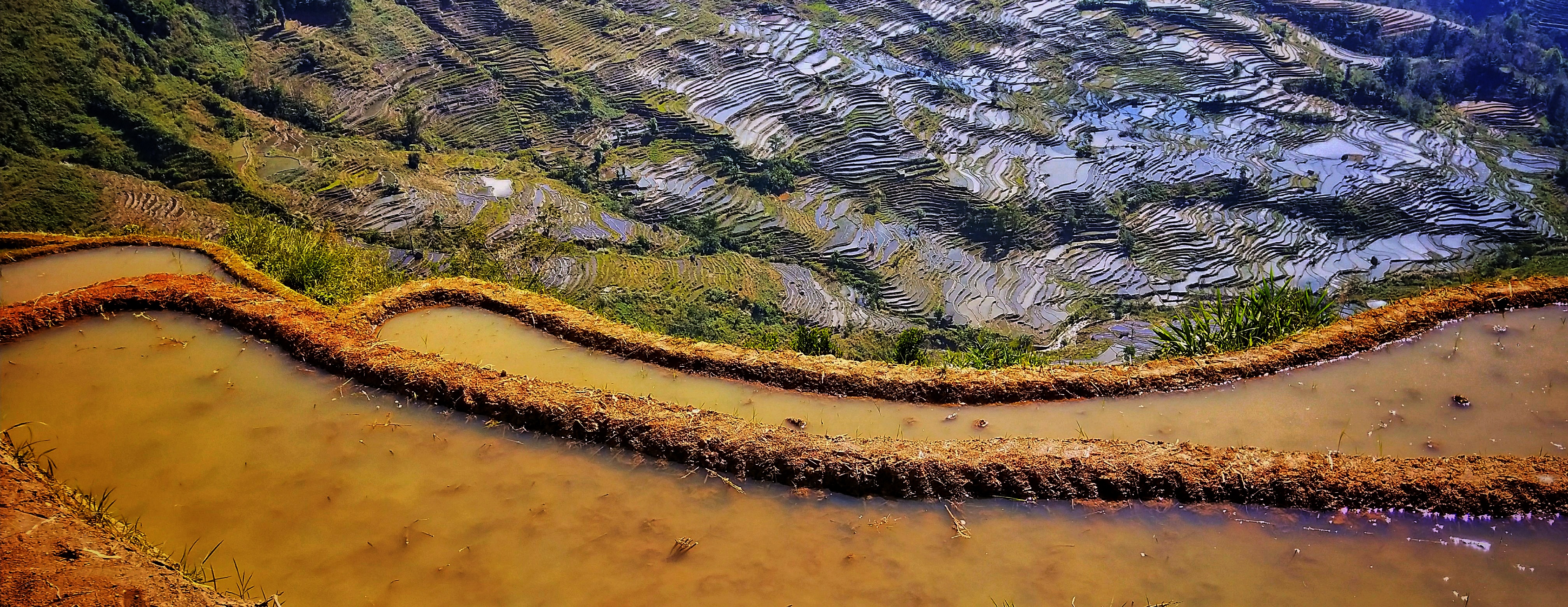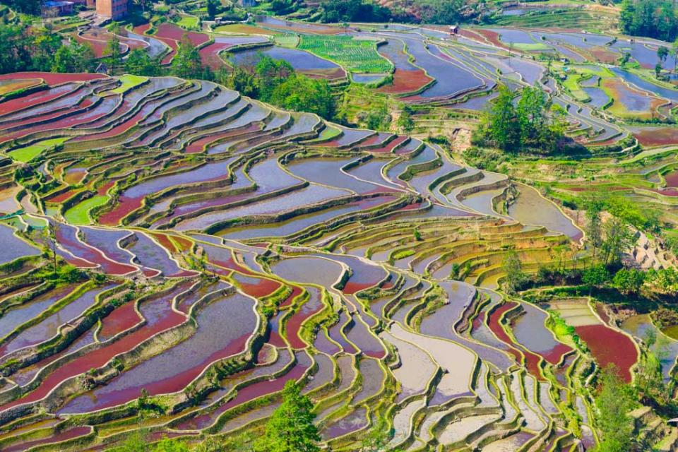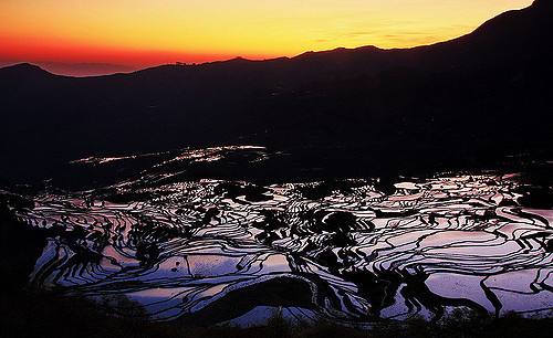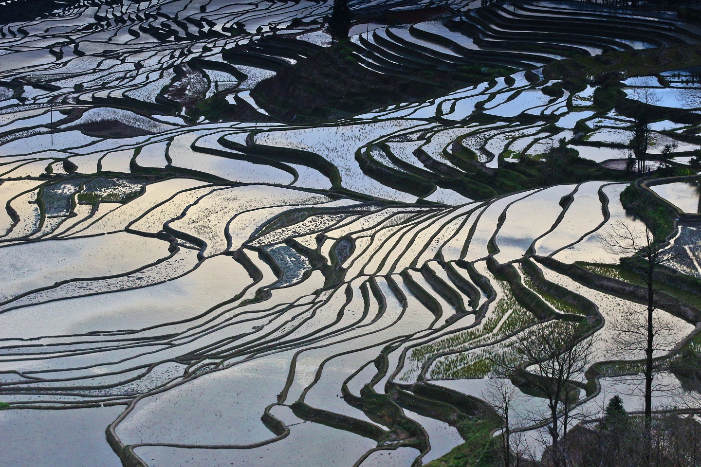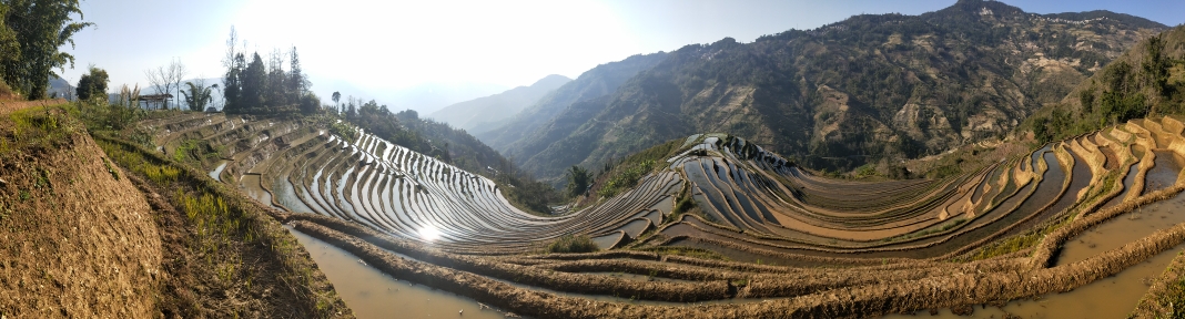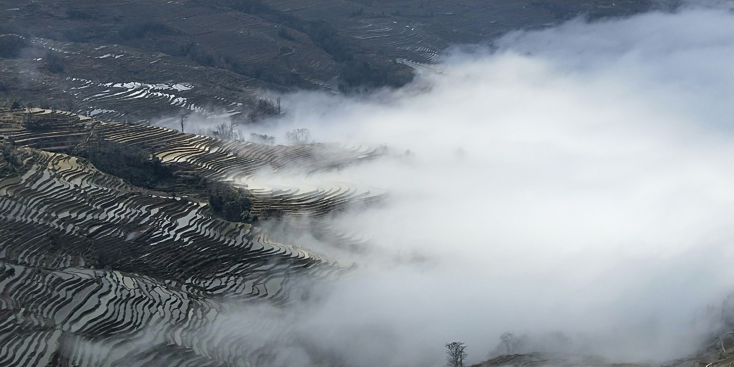梯田的最佳拍摄时间是每年12月至来年的3月下旬,但要说最美的,还是1-2月之间。梯田被灌满水用来涵养土地,而稻苗还没有被插上。于是,层层的梯田银波荡漾,像极了一块块精美的玻璃,更像是大地山川挥就的一幅泼墨山水。