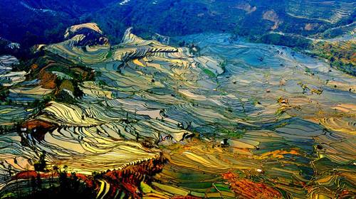 县哀牢山南部,是哈尼族人的杰作。梯田随山势地形变化,因地制宜,缓坡开垦大田,陡坡开垦小田。