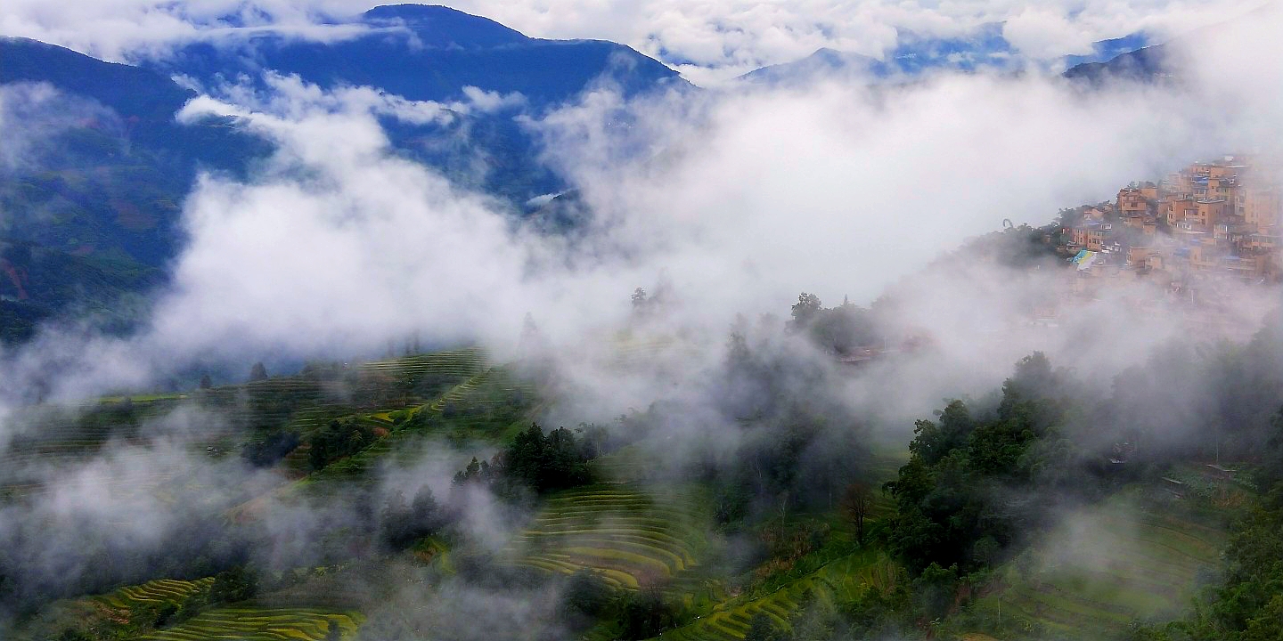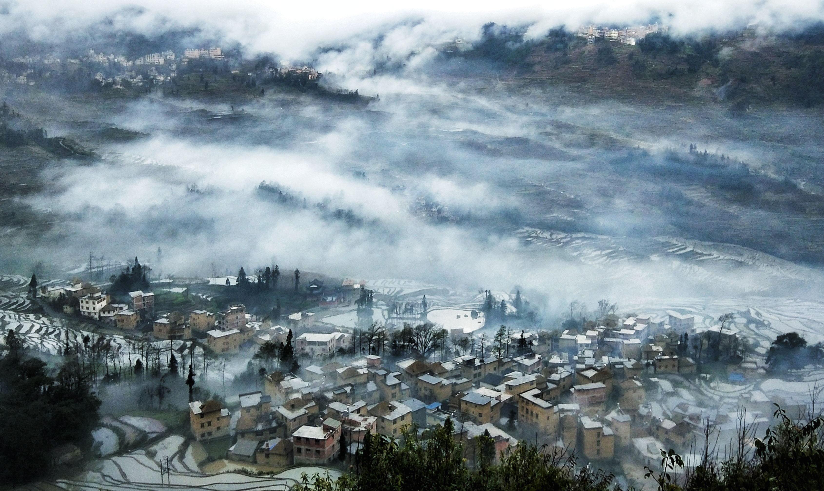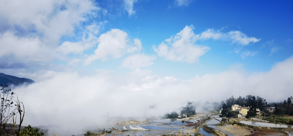 清晨的多依树,薄雾弥漫梯田上空,远处的房屋树林都带着一丝朦胧,周身有着说不出的仙气撩人。