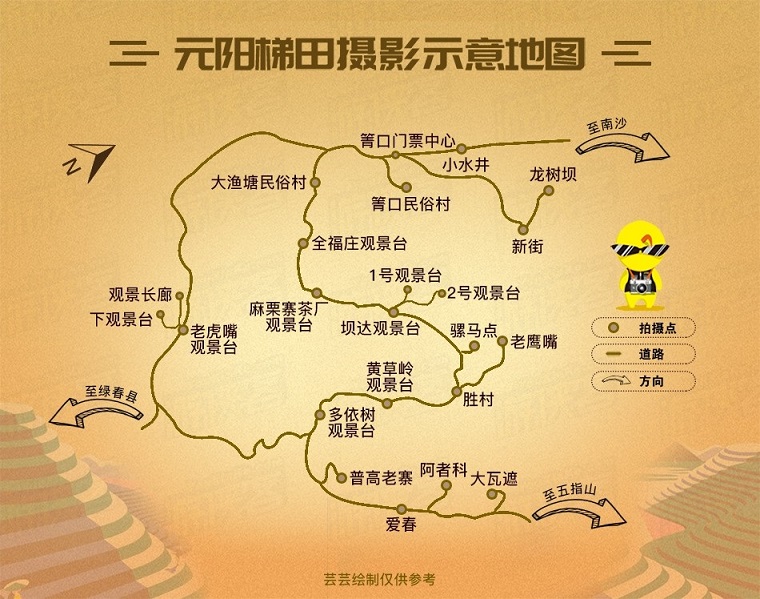 目前元阳哈尼梯田景区主要包含箐口民俗村、坝达、多依树、老虎嘴四个官方点位(龙树坝早已废弃),是国家4A级景区、国家湿地公园,被联合国教科文组织列入世界文化遗产名录,是世界上最大的、参与制作人数最多的、制作时间最长的造型艺术群落。