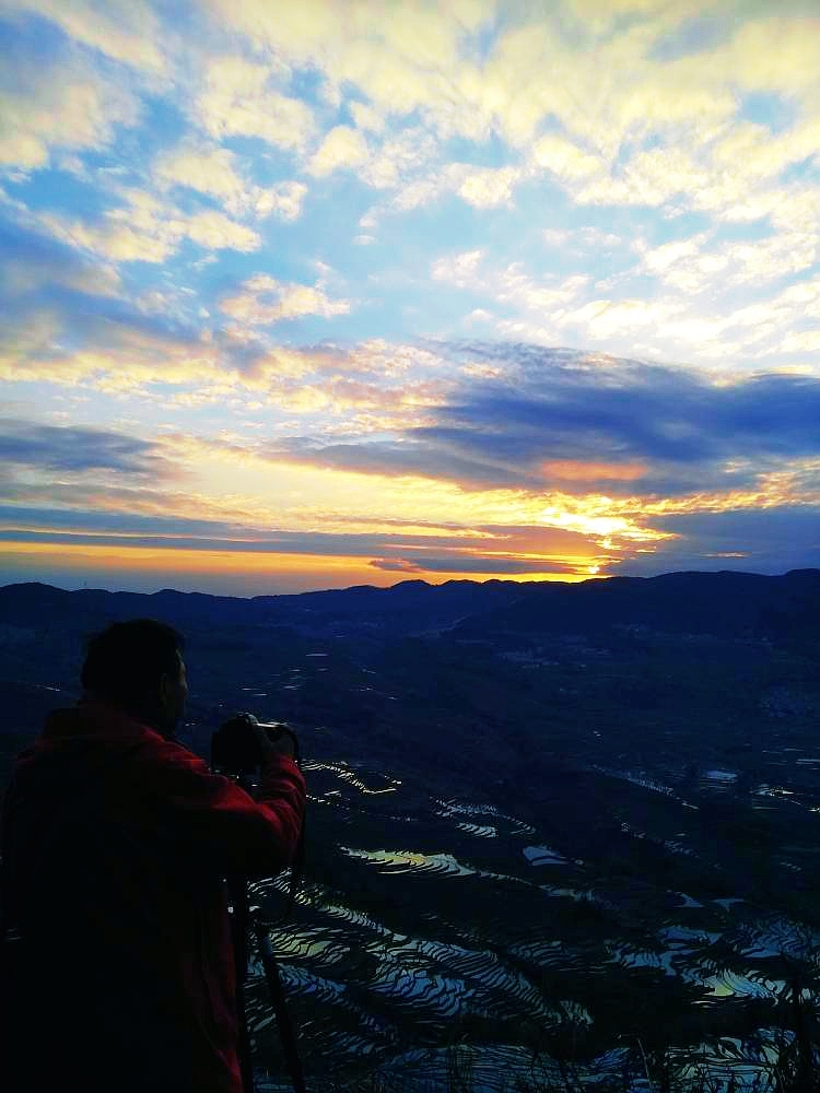 人们早早就拿着长枪短跑在梯田旁边守候,希望记录下属于自己的美景和回忆