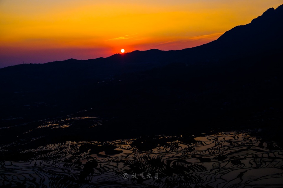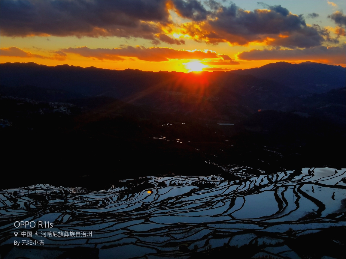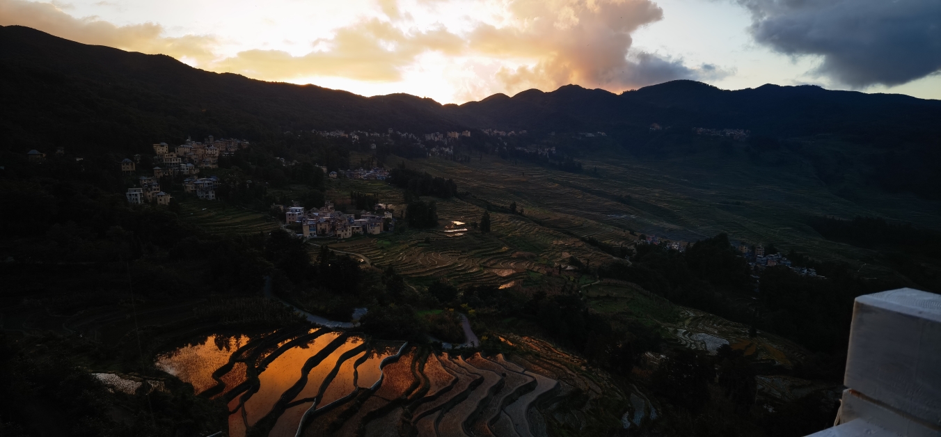 最大特点是落差大、线条分明,亲眼所见的确如此,梯田群确实最为壮观、气势恢宏,一般是观赏日落的好去处。需要注意的是,坝达村一带的山腰地段不查验门票,也有不错的观景平台,但看日落的最佳地点个人认为是在2号观景台(景区内要验票)。