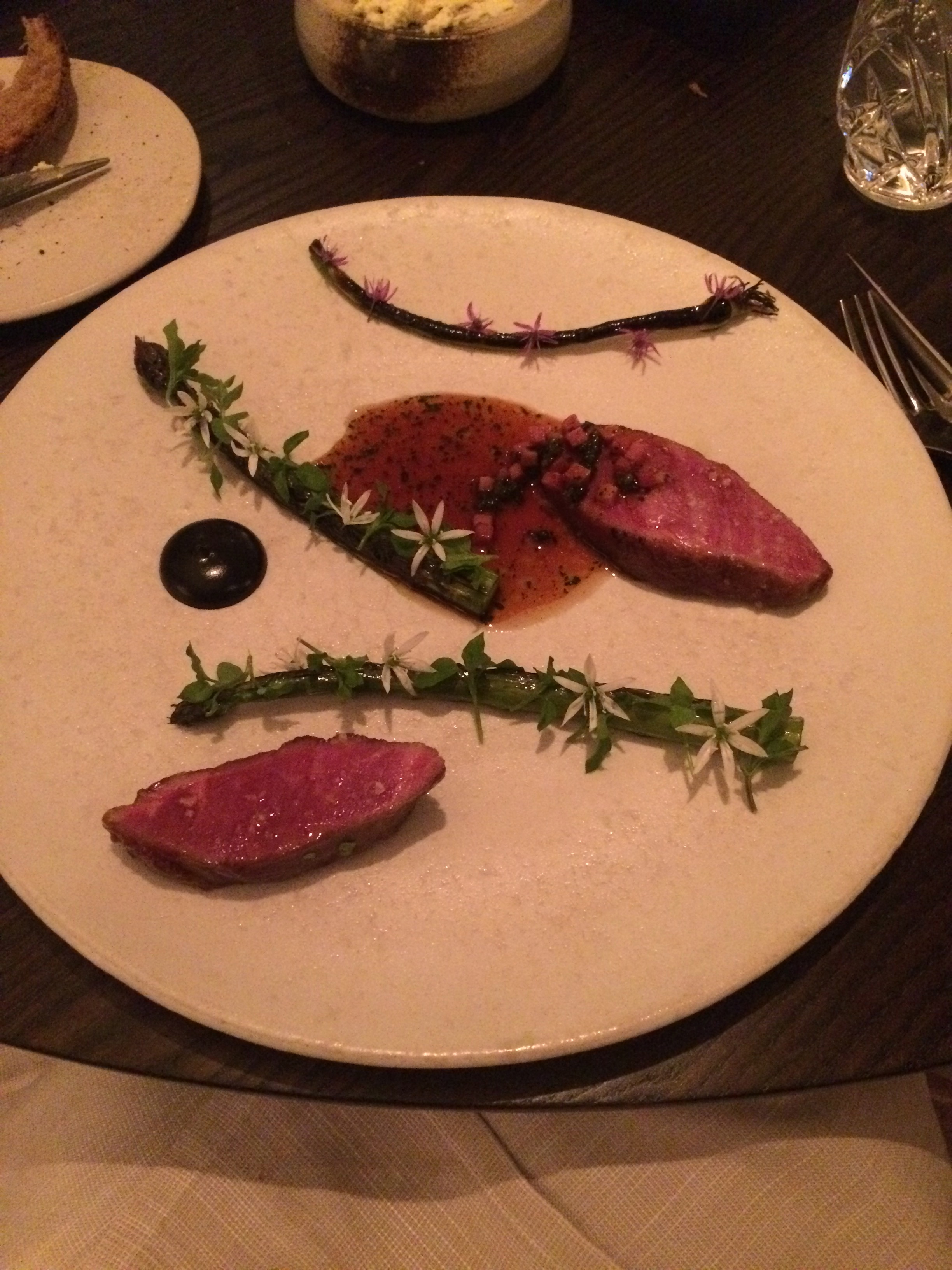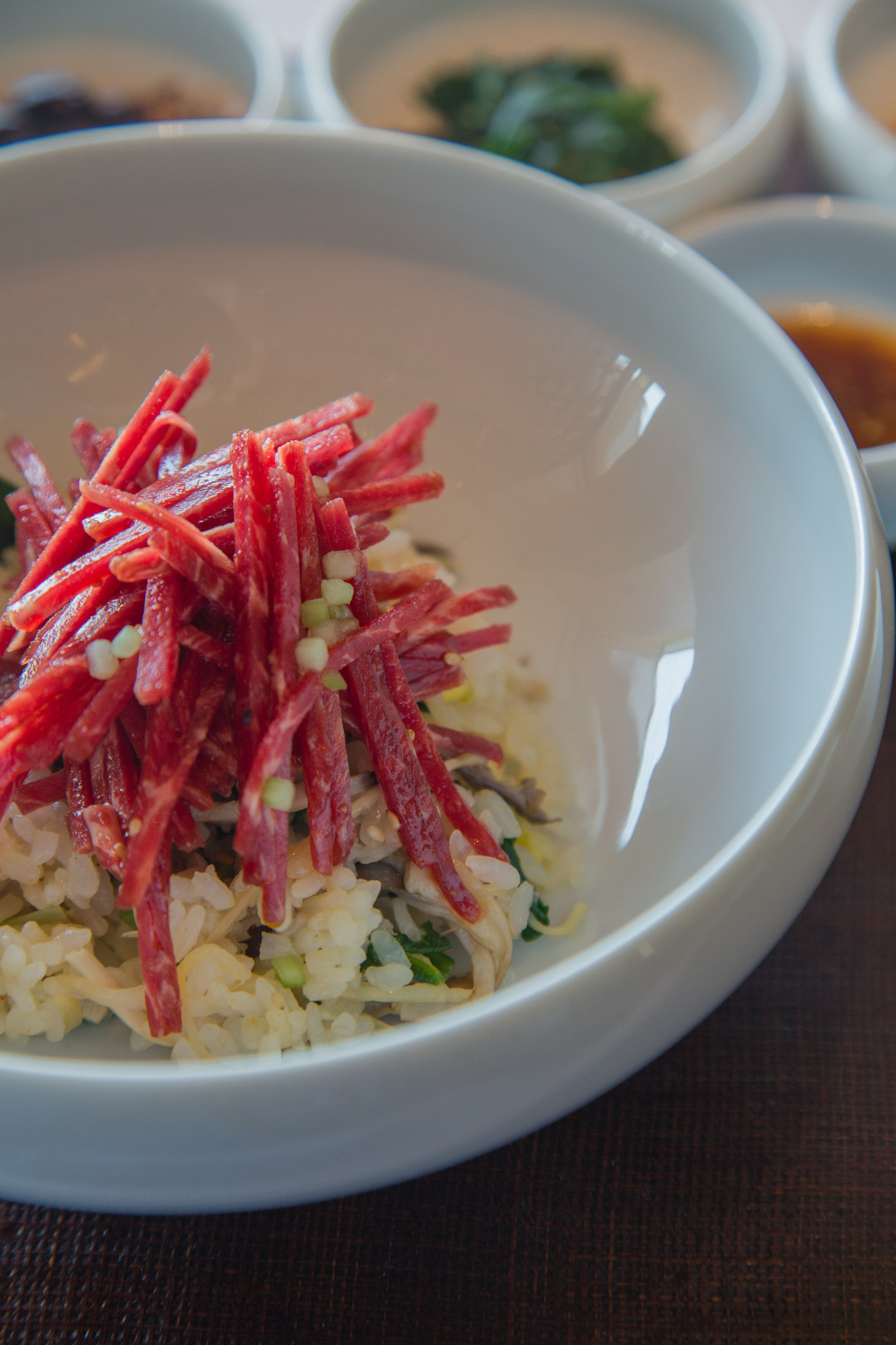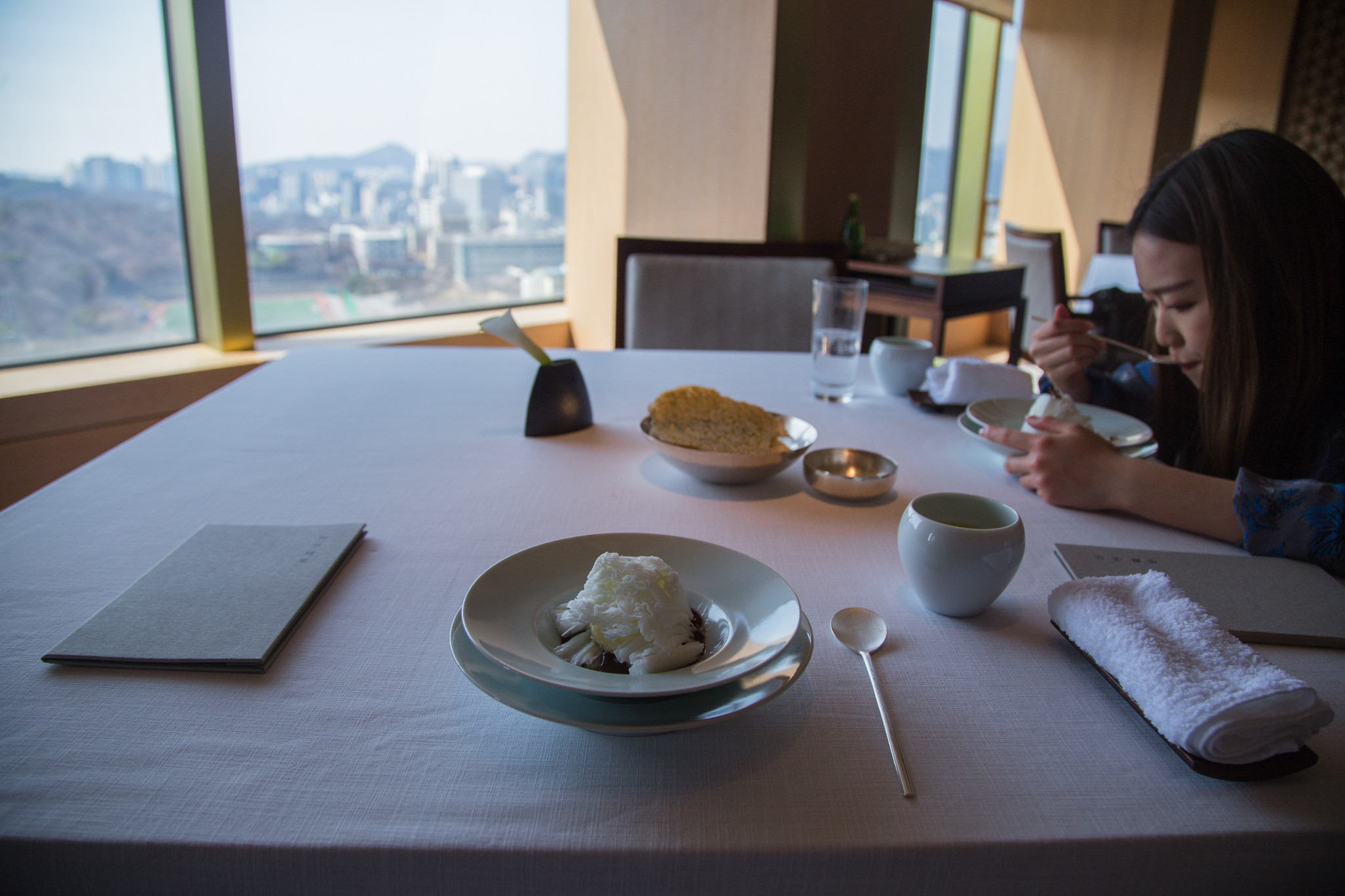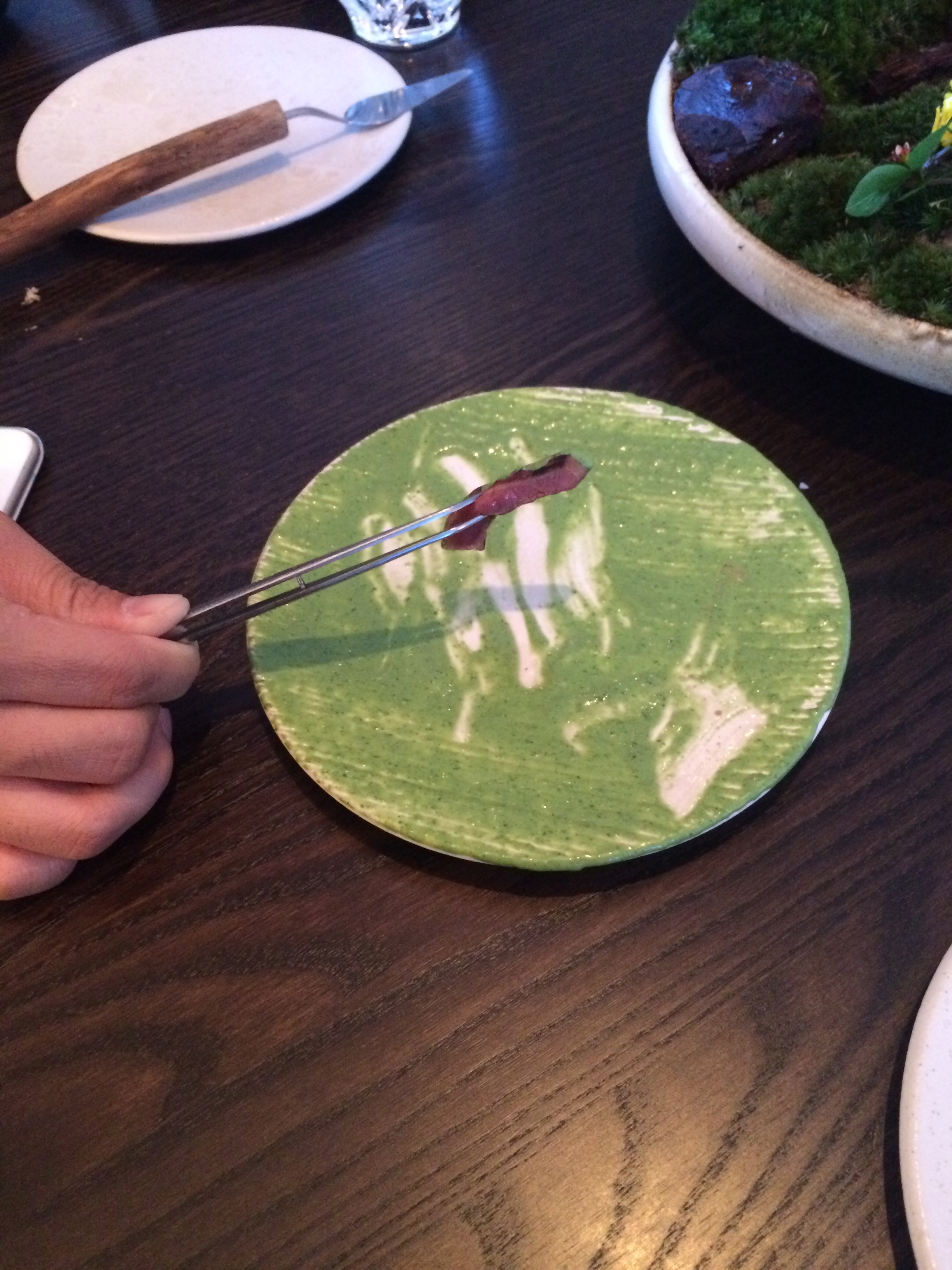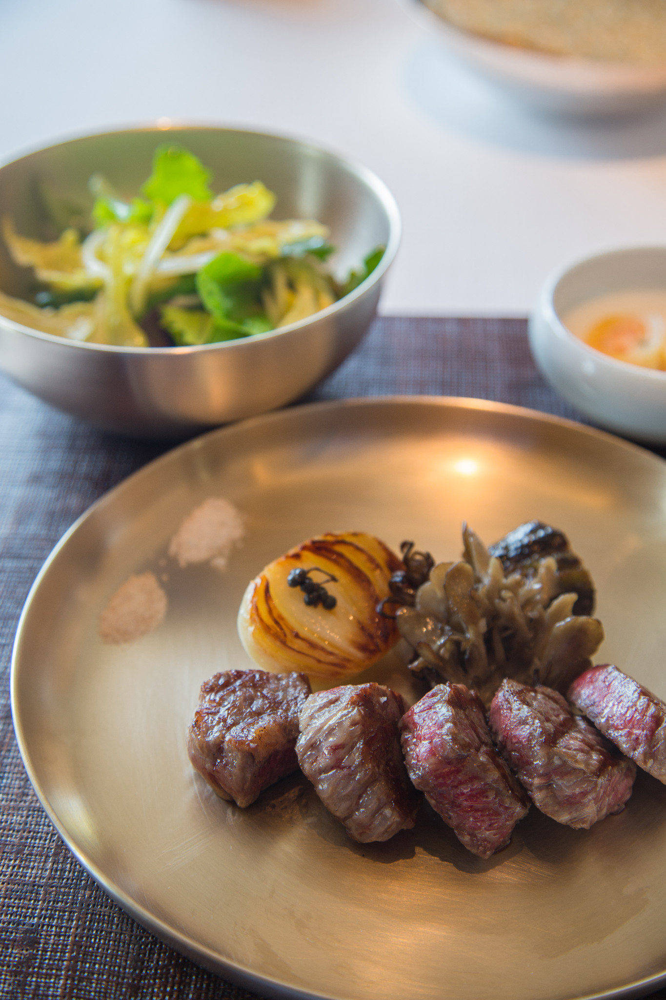 主菜选的是烤韩牛里脊,之前吃过不少牛肉,这道牛肉可以说颠覆了我之前的味觉体验。摆盘非常简单,服务员介绍可以尝试两种不同的盐,夹起一块牛肉沾上盐放入口中,一开始是一点点焦香,牙齿咬破牛肉之后,肉汁一下子就全部涌出来了,里脊之前进行过腌制,微甜的肉汁搭配着焦香和脂肪香的牛肉,连咽都没来得及咽就脱口而出:太好吃了!!!
