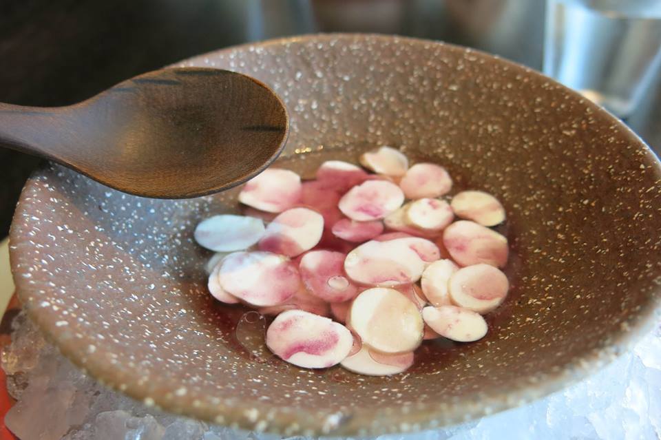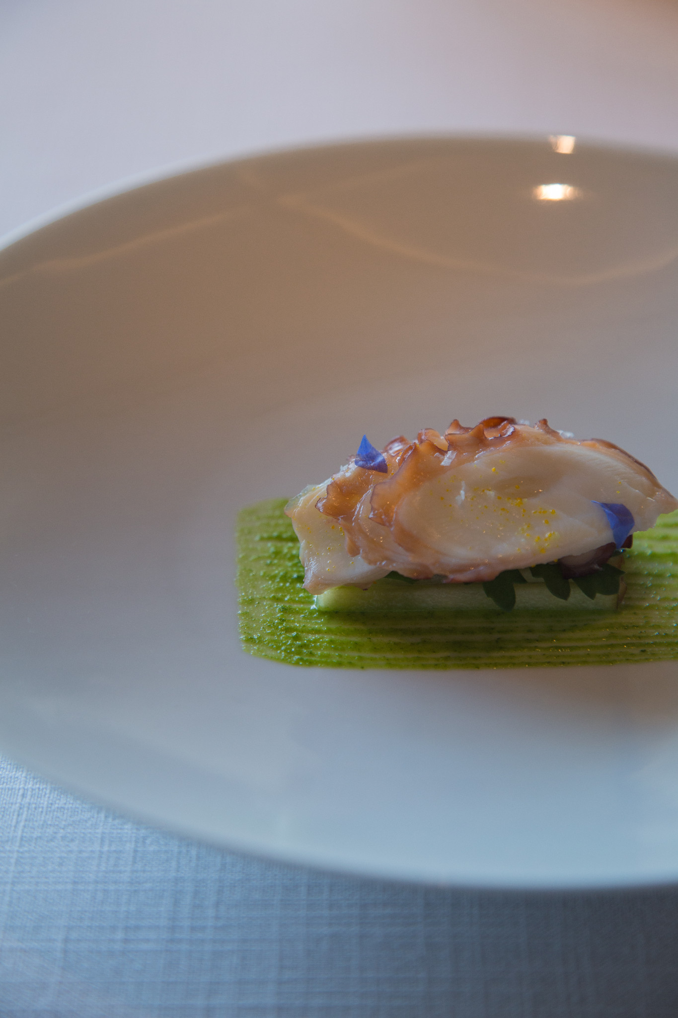 凉拌章鱼端上来就能看出是道很清新的菜,服务员介绍每片章鱼可以搭配下面的苹果丝和薄荷酱一起食用。