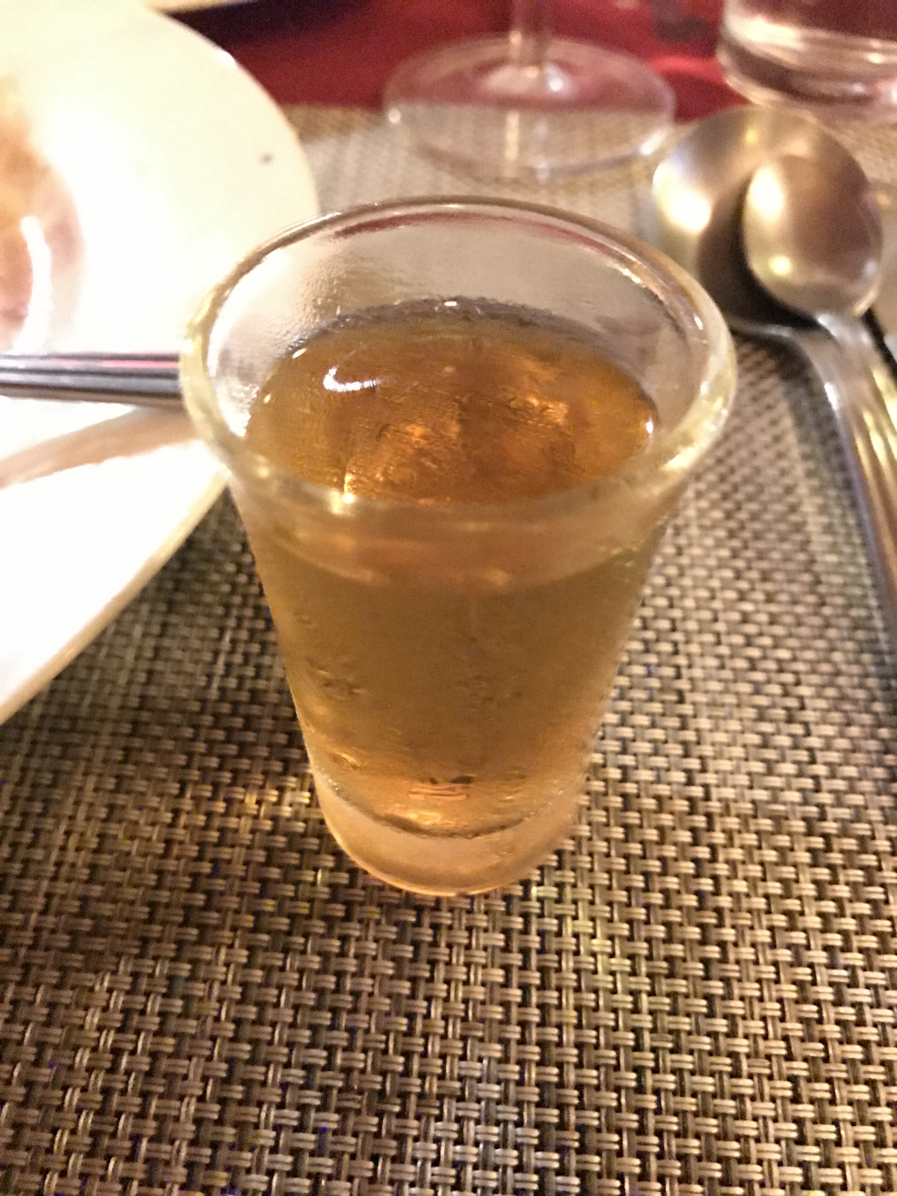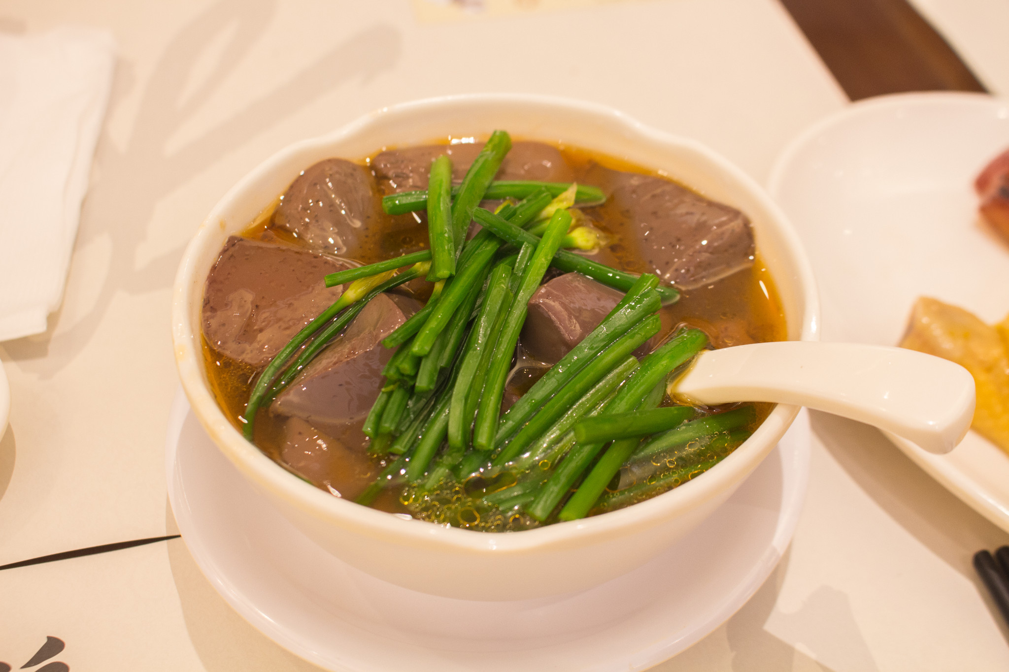 韭菜花鹅红,鹅血块很大,入口简直像果冻一样,又滑又嫩,汤稍微有些辣味,遮住了鹅血仅有的一点腥,太好喝了。