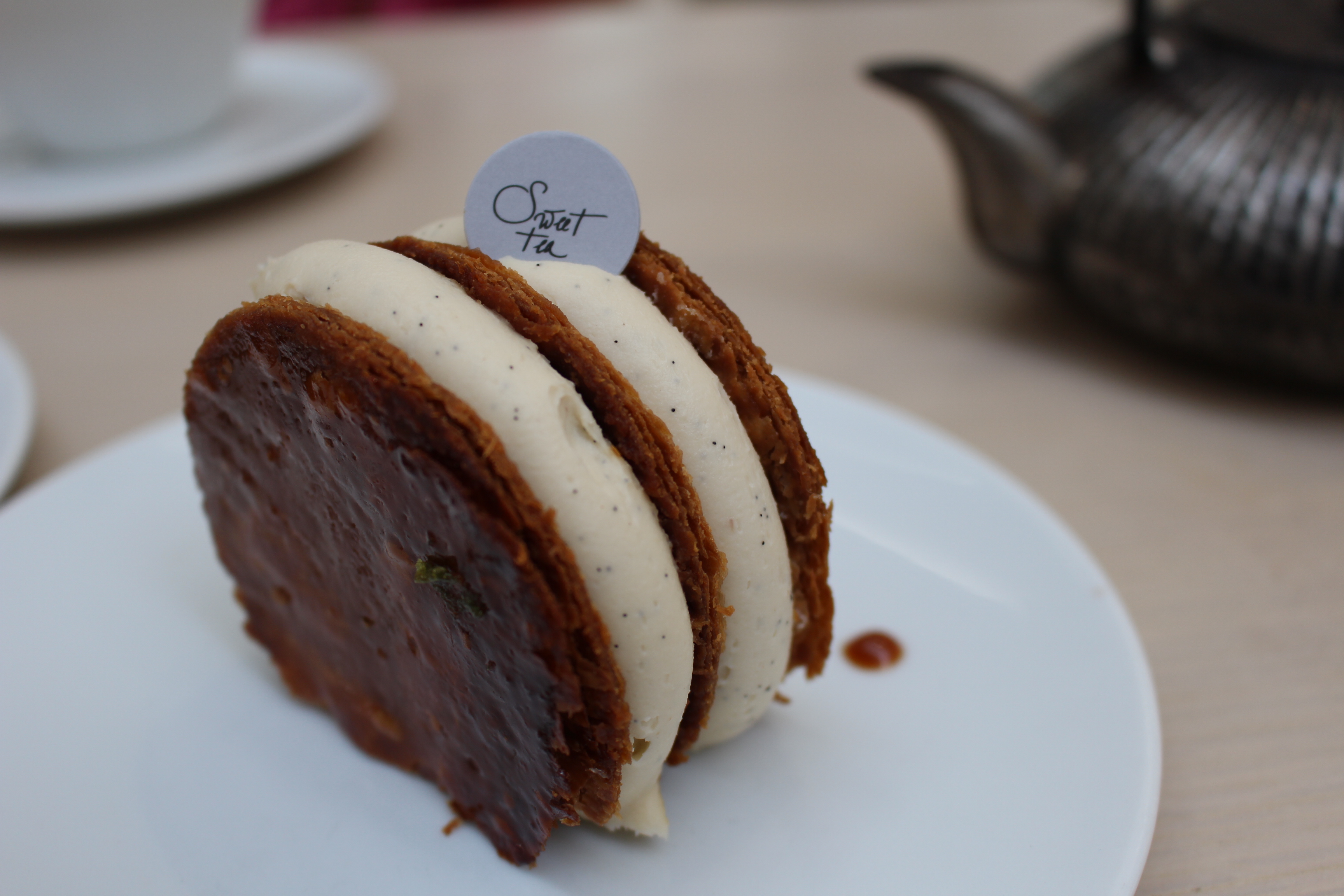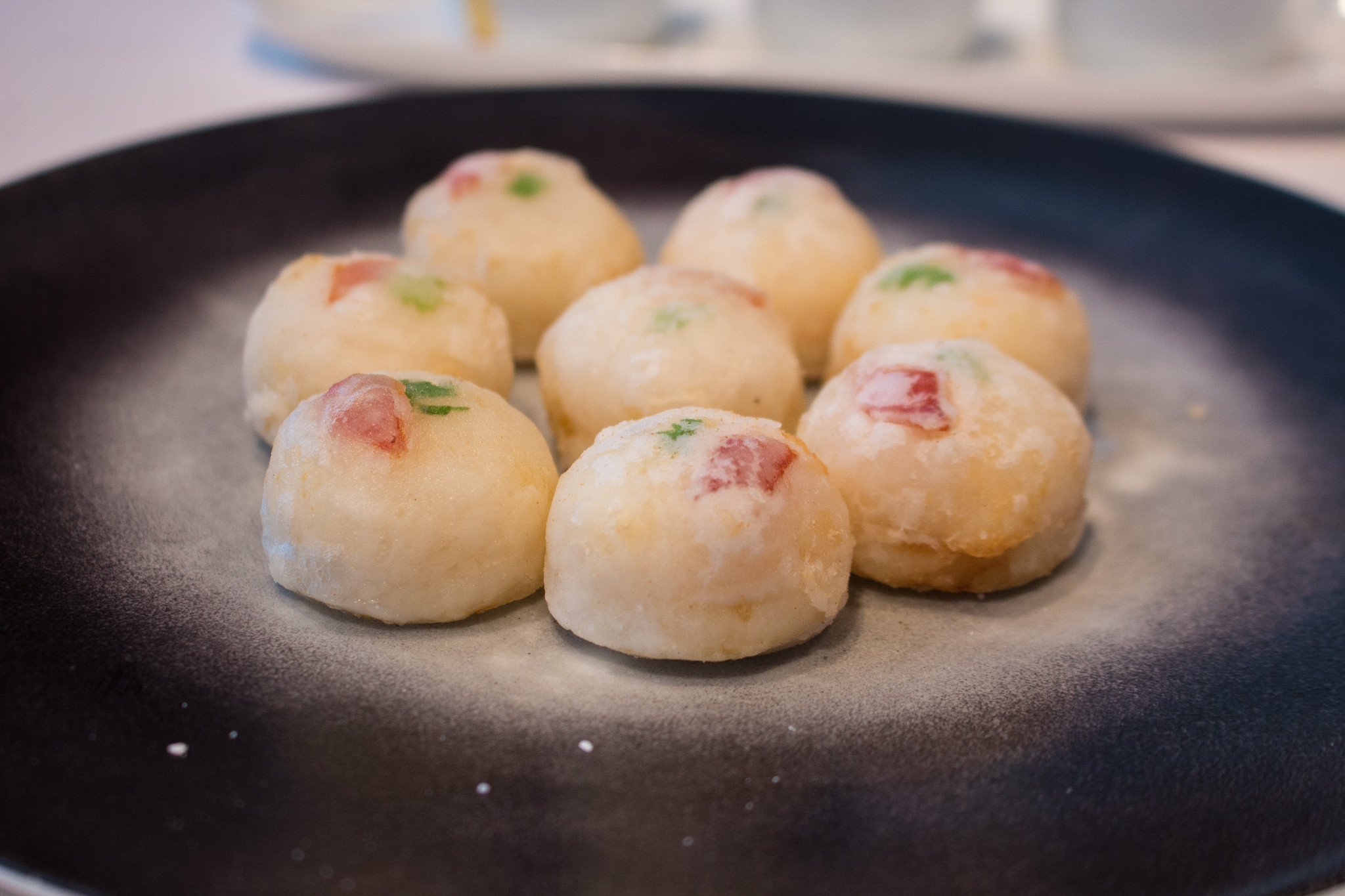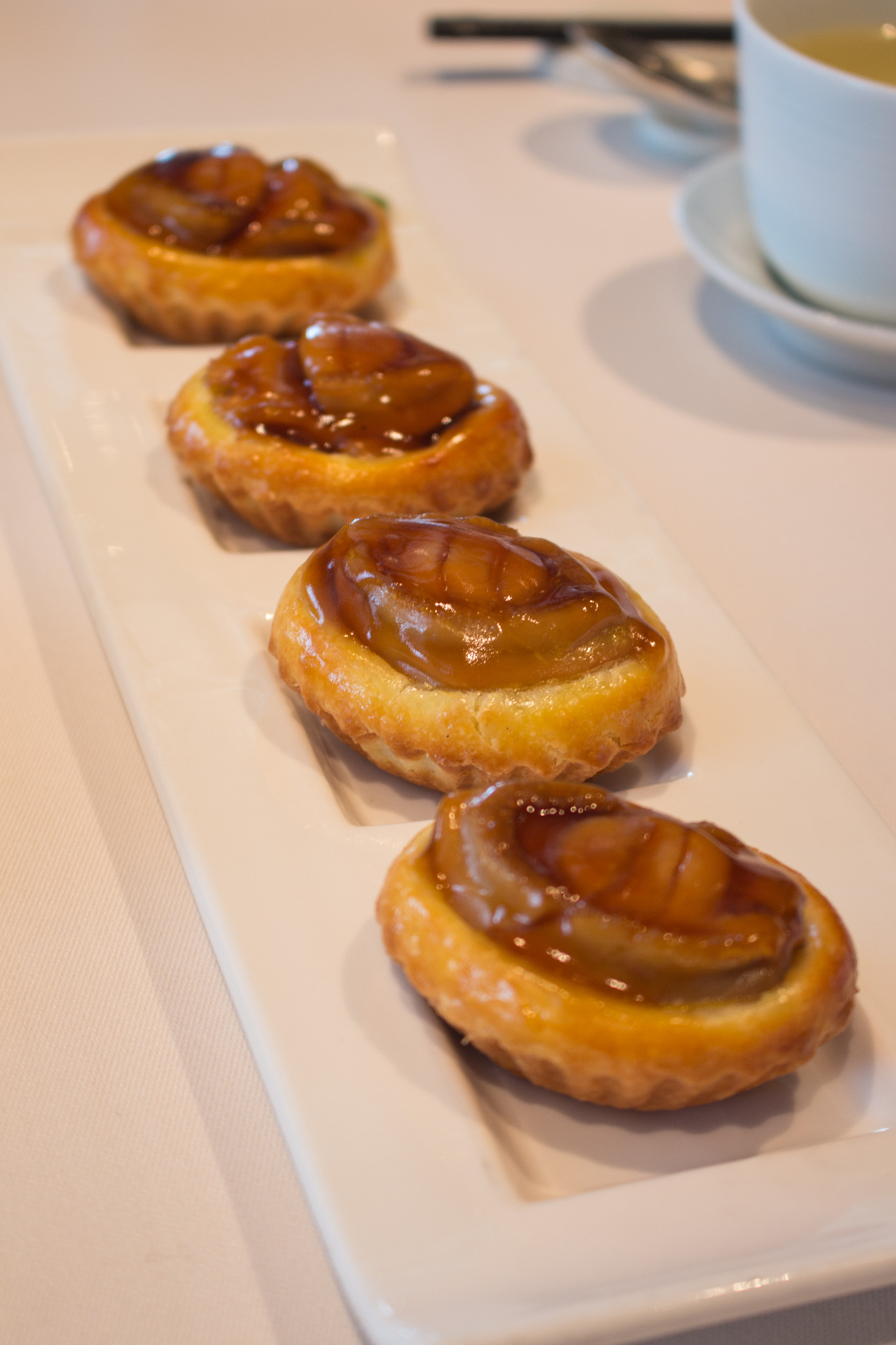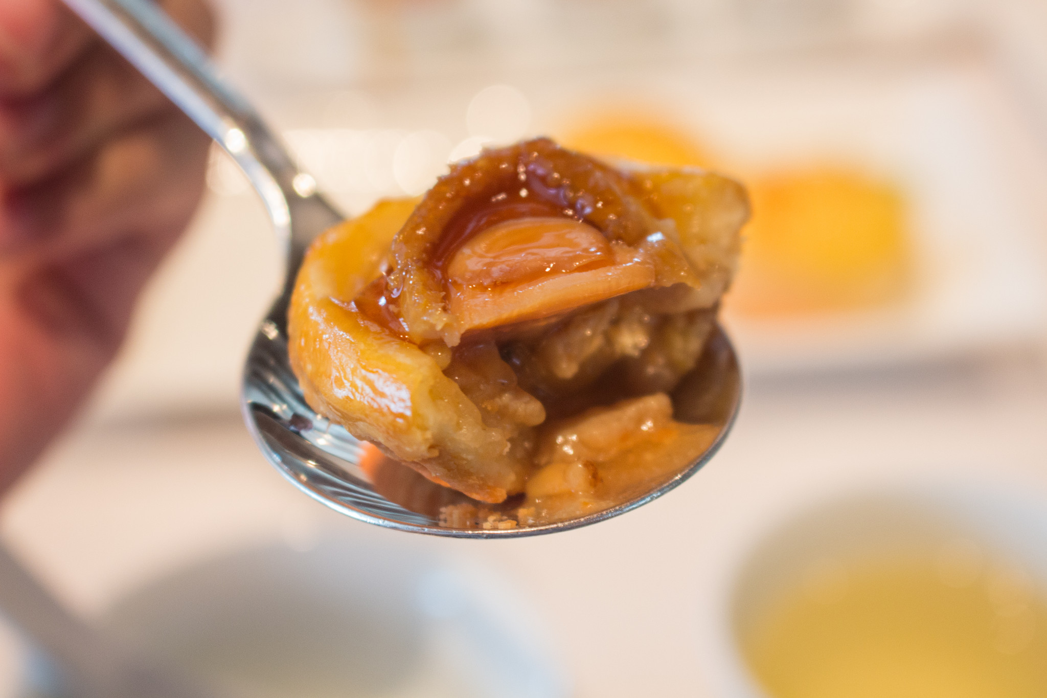 当家点心之一的鲍鱼鸡粒酥,看起来一块很大,其实鲍鱼已经切成三份拼在一起,每份刚好是一口的大小(女生)。鲍鱼肉质紧实,底下的挞皮比鲍鱼还要好吃。