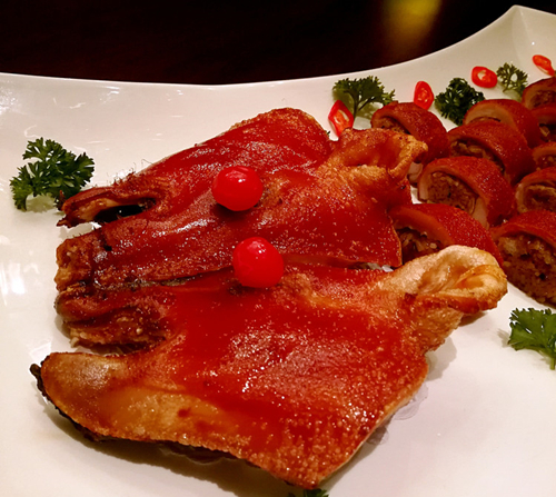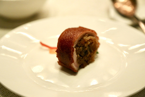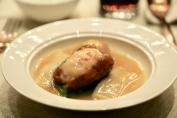 糯米脆皮黄金乳猪。哈哈~一道硬菜,上菜时惊艳四座,这道菜像被我们在场所有的人检阅一般,拍照留念。其实仔细看,并没有完整的一头乳猪,毕竟是米其林出品的菜式,不如北方豪放派的烤乳猪,一整只直接上,人家在细节部分还是做得很到位的。