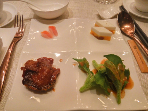 四喜临门。作为一道前菜,小家碧玉般的陈列在我眼前 ,三下五除二就被我消灭了。后来经服务员点拨,其实吃这道菜也讲究顺序。先吃熏鱼,开胃,再吃冰草除口腔里的味道,然后吃左上的酸酸的类似于泡菜的,最后吃右上的甜品。