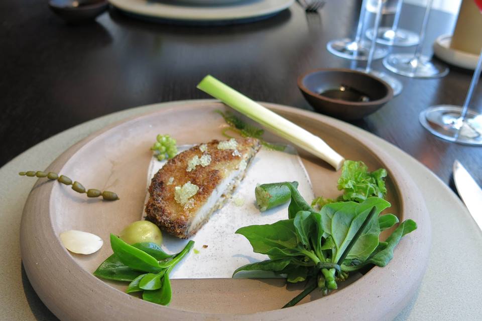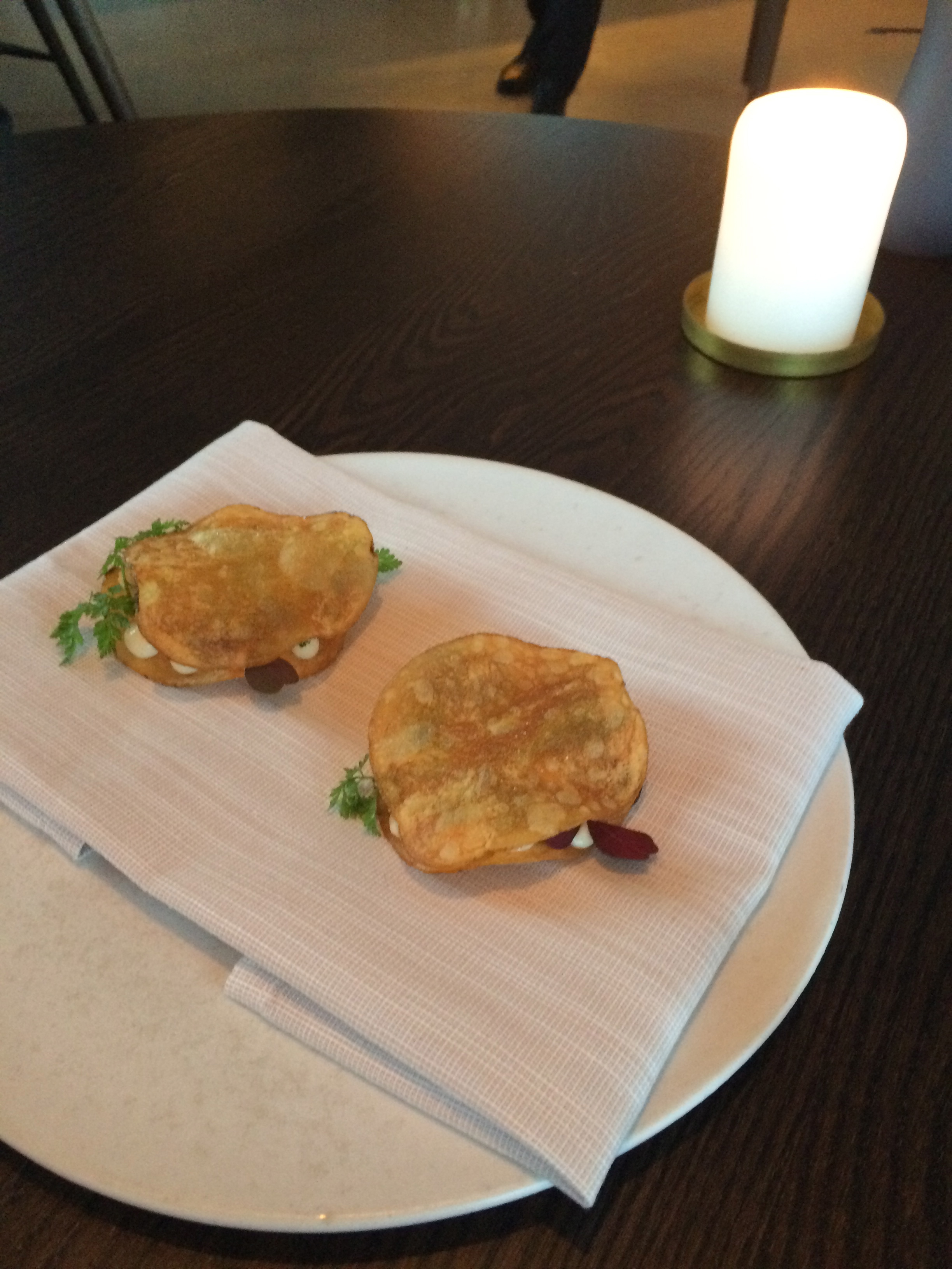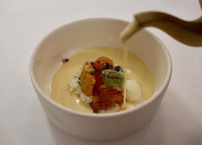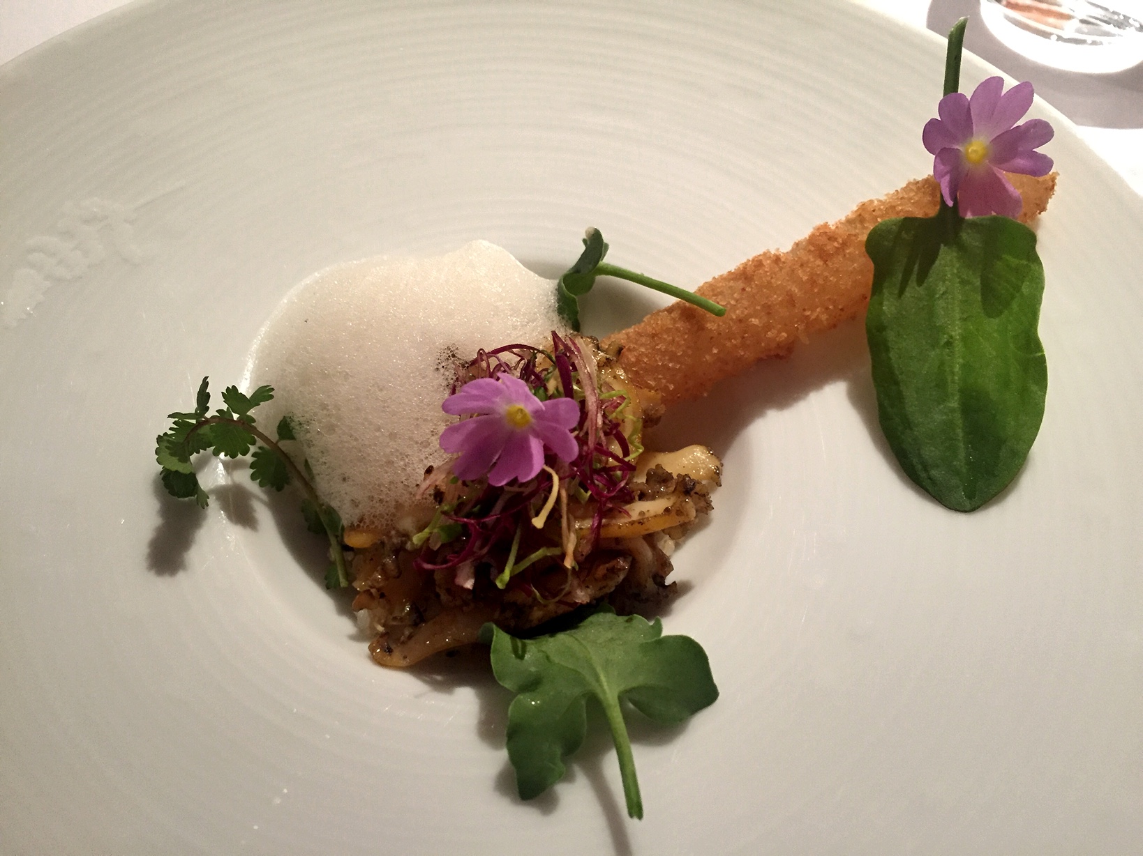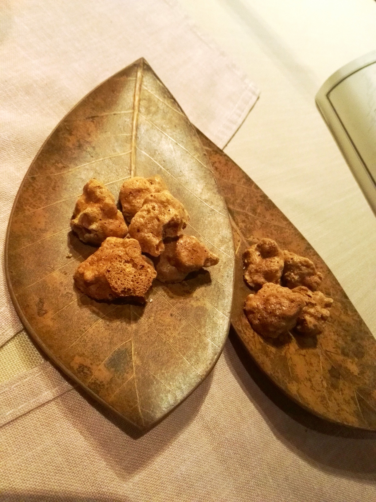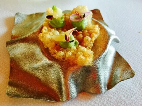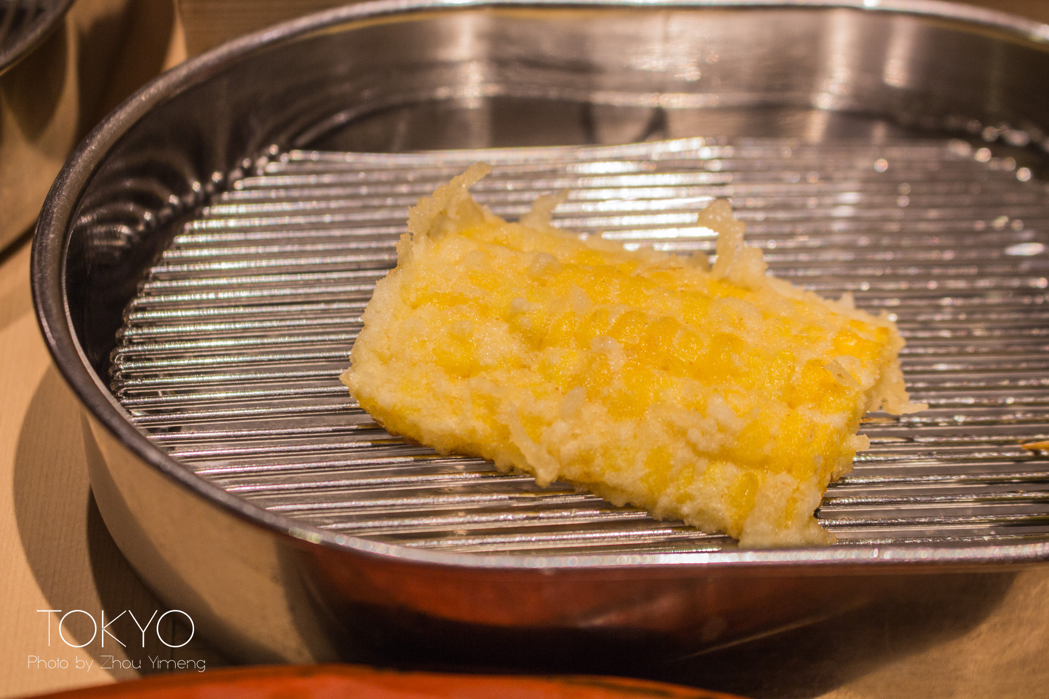 本以为下一道是炸鱼类,没想到上来的是玉米,第一口沾盐放到嘴里,简直有惊艳的感觉:怎么会这么的好吃!!! 整片玉米沿着棒子切下来炸制,甜度和汁水保持的太好了,可以说是我吃过的最好吃的玉米,直到现在都难以忘怀。