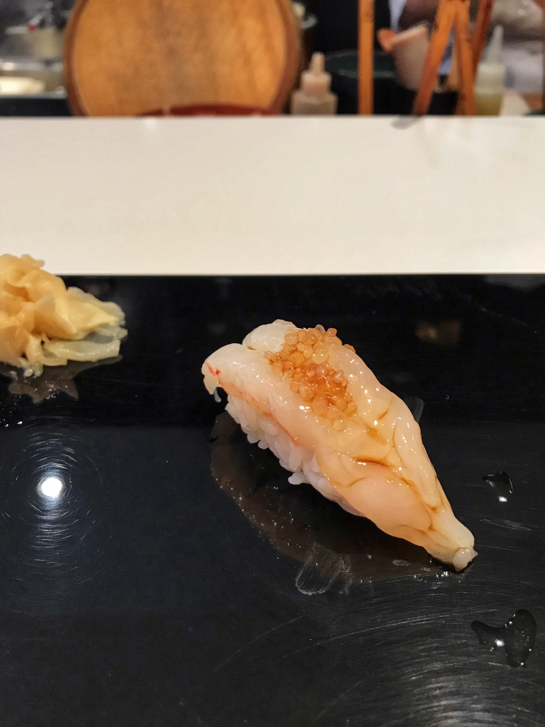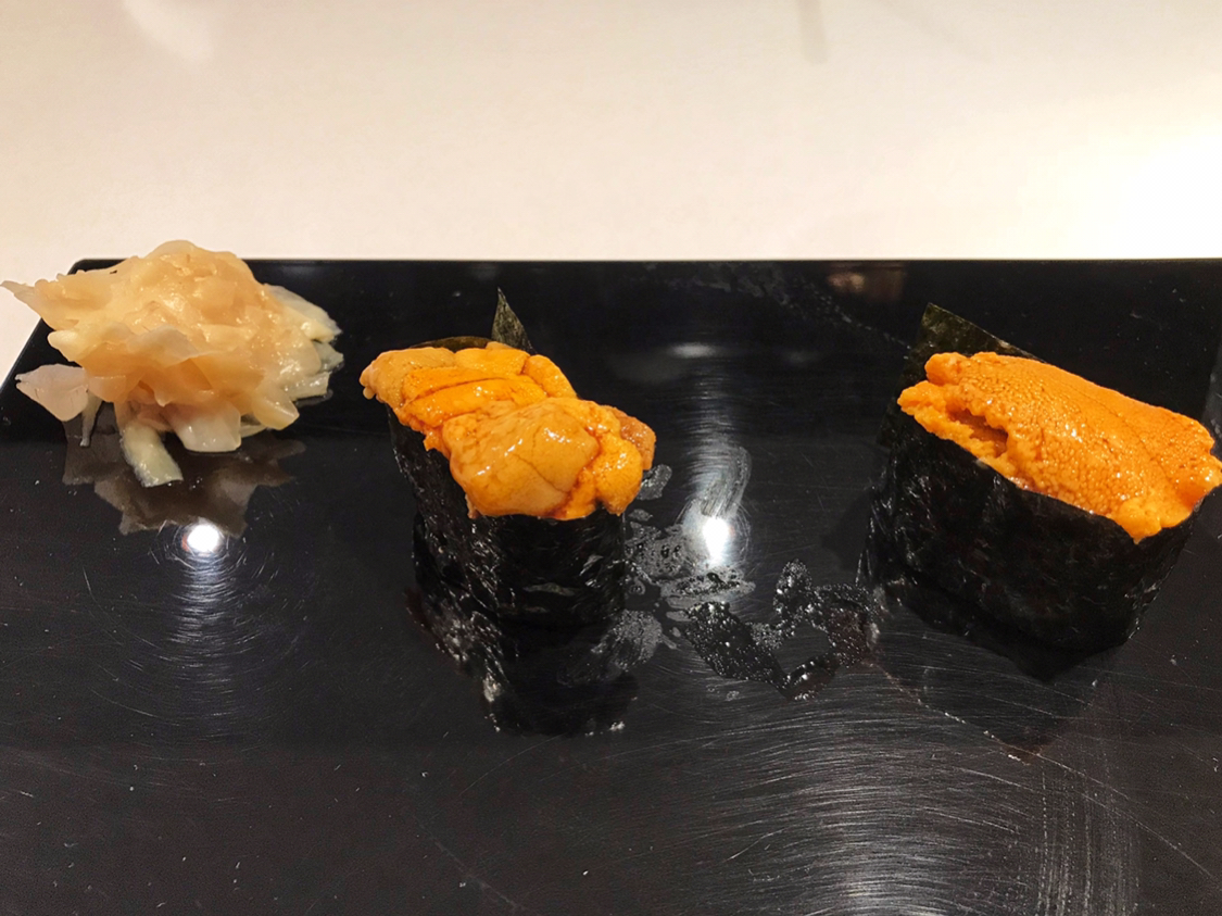 入席时服务员介绍的今日特别菜单军舰海胆,用的是日本和美国两款不同的海胆。海胆从冰箱里拿出来的时间太短,入口的温度甚至还有些冰牙,差评。