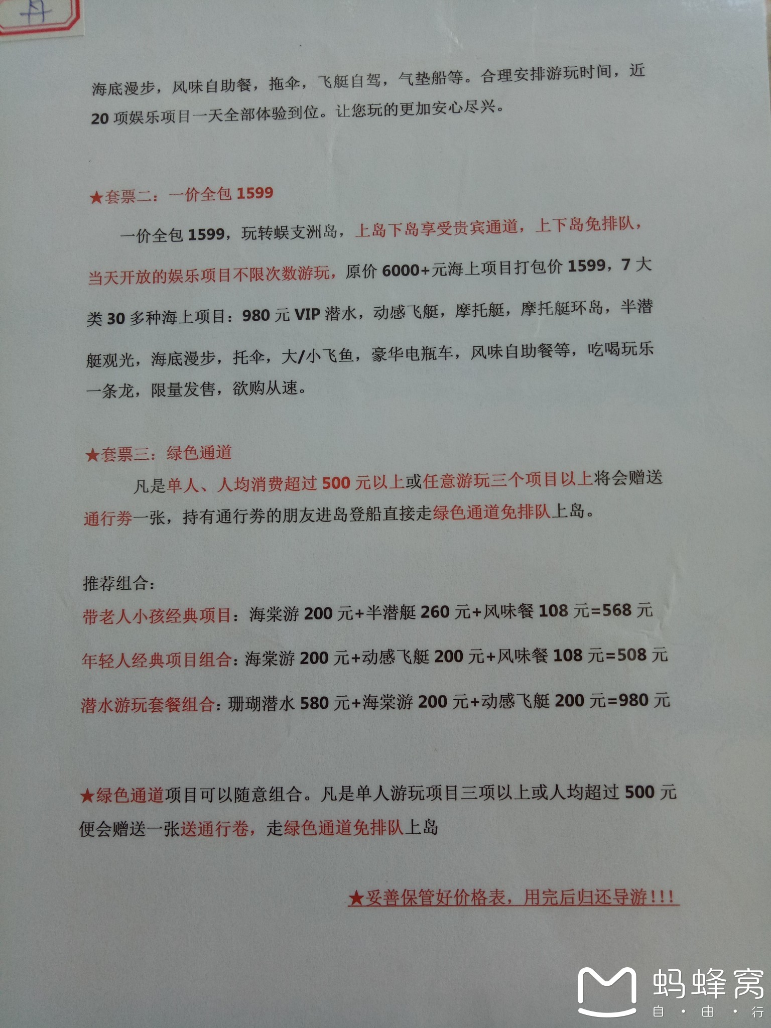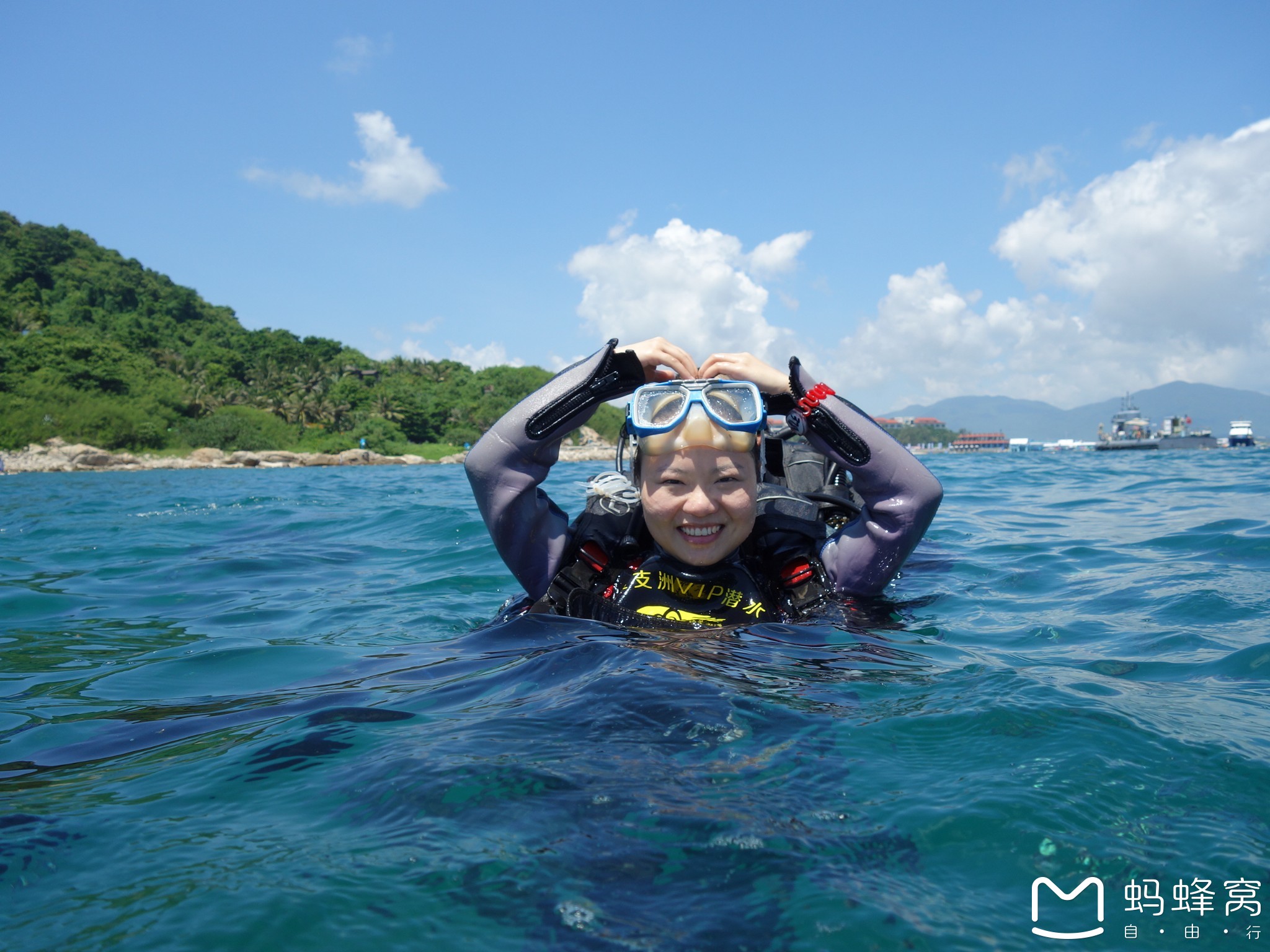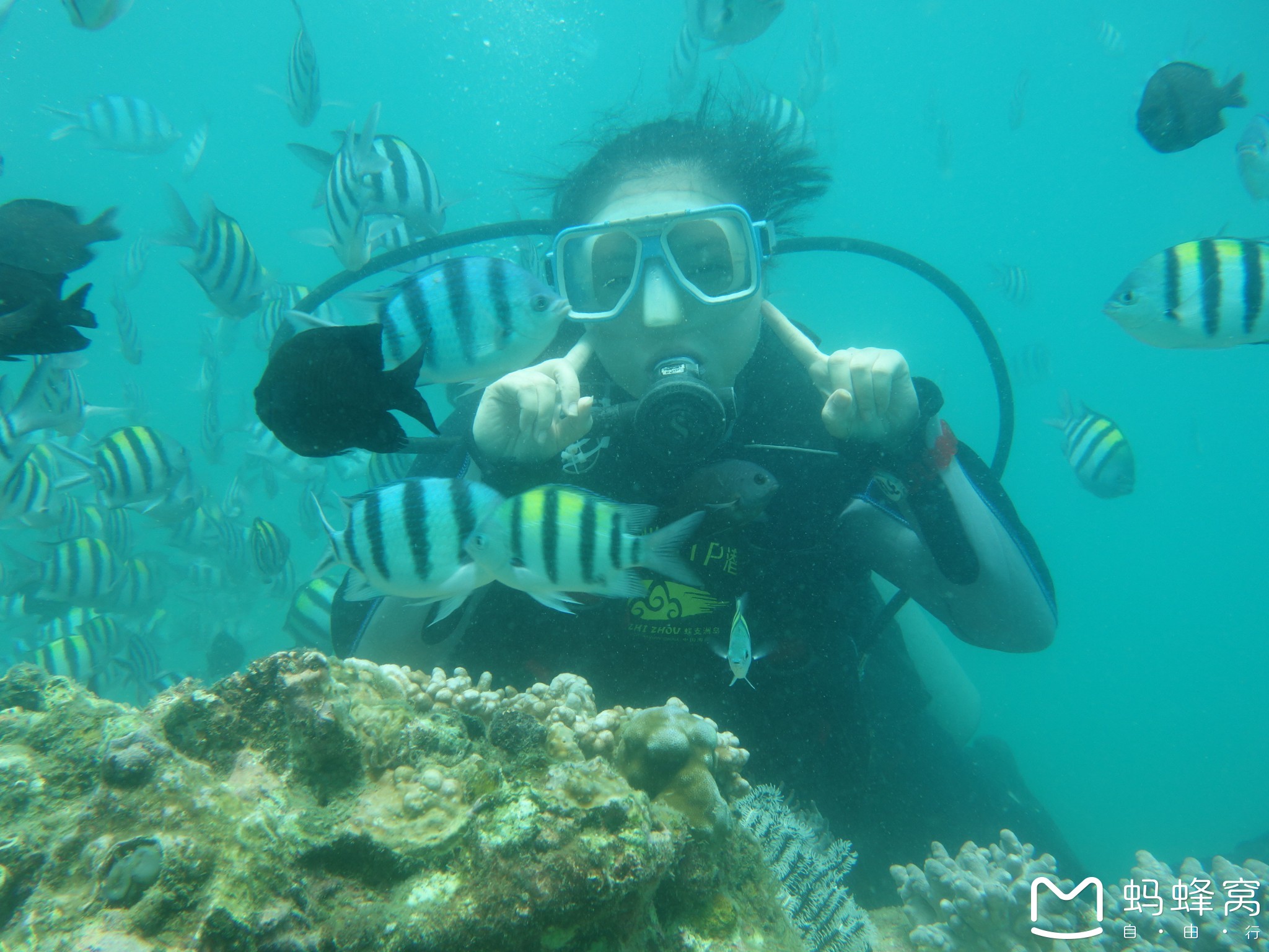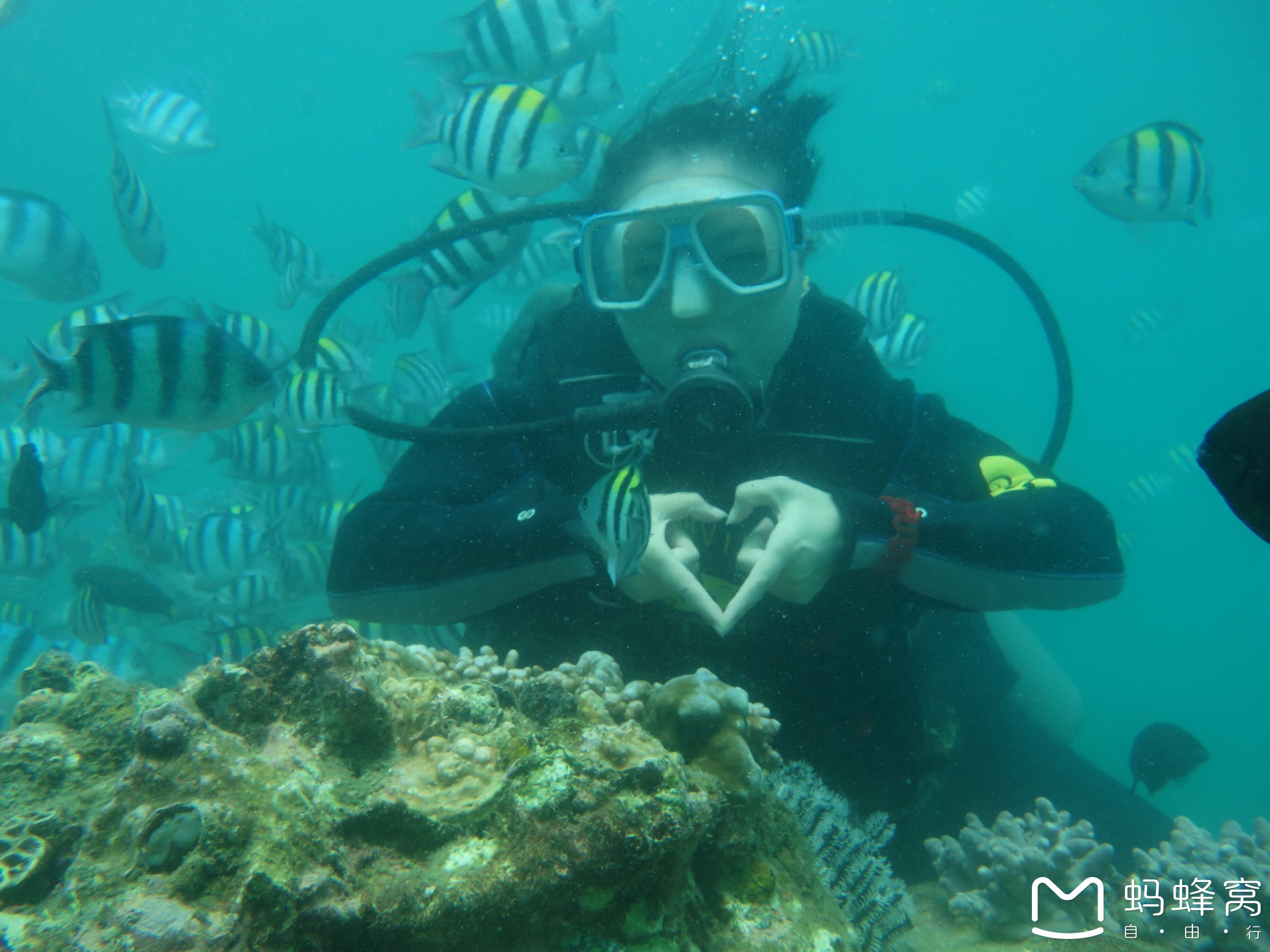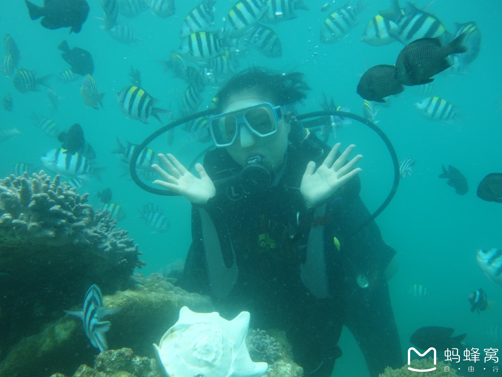 一、潜水项目是在来游客中心,要排几次队:1、排队买鱼食,咬嘴,租柜子(如果你没有在上岛之前买票的,在这也可以买票)2、排队领潜水鞋3、排队领潜水衣(是放在大水桶里消毒)4、排队更衣(如果人实在很多,就要排,否则不需要,建议带泳衣,如果你不潜水的话,要沐浴更衣是要收费的,好像是20元。)5、排队培训(分批次培训,下海潜水前要经培训人员讲解安全事项,大约十来分钟)6、排队上船到潜水区7、排队下海潜二、潜水安全注意事项:1、是用嘴呼吸的,不能用鼻子。2、几年内做大型手术、半年内做过手术、有中耳炎等等疾病是不能潜水的。3、在培训你的时,认真听讲解,学会排压方法,万一耳朵痛,就要排压。4、下潜过程中是不能说话的,所以记住两个手势:竖起大拇指表示耳朵不痛要排压,或是不舒服要到水面上;水下时,教练(都是一对一的,比较安全)时不时会打OK手势问你有没有问题,如果没有就回复OK手势,如果有就竖起大拇指。5、教练会先让你在 水上 练习用嘴呼吸,当你已经牛掌握了方法,就可以下潜了。6、不要紧张,要放松,耳朵痛是正常的,不要太紧张,可以先排压,如果能排压就没问题(有时坐飞机也会耳朵痛);如果一直痛就不要忍着,先浮出水面。7、潜水时所产生的垃圾如鱼食塑料袋等要放在潜水衣袖口内。三、水下拍照:1、如果要拍照,就直接和教练说,他会叫人在水下给你拍照。2、你要会潜水了,他才能在水下给你拍照,否则没法拍。3、潜水完后,会给张拍照的单子,填完后到游客中心取。我换好衣服什么之后,就拿到照片了。4、鱼食在 水上 不要开,在水下时再开。喂鱼时,像挤牙膏一样,挤出来再用手拨开,这样,它们就会在你身旁或身后,不会挡在前面防碍拍照了。5、说好的照片,不是打印出来的,而是给个U盘,一般15张或多点,当场确定下U盘是不是能正常使用,里面的照片满意与否,一般都会要啦,毕竟潜水的机会不多啊。