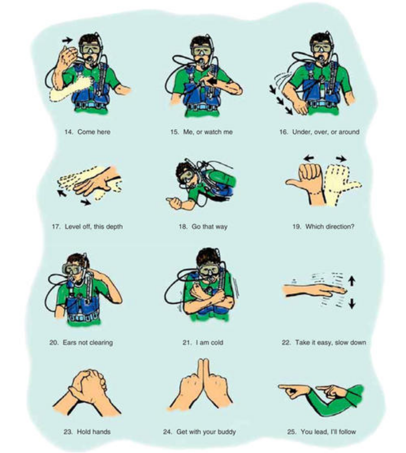 ok、上升、下潜、不舒服、有危险,掉头这里先纠错一个说法,一些潜水新手喜欢用竖起来大拇指表示“一切都好”的意思,其实这是错误的,竖起来大拇指是上升的意思。“一切都好”是OK的手势。大拇指朝下,是下潜的意思。来回摇晃你的手掌,久是表示有问题,哪里不舒服,或者是你遇到什么困难等。教练握紧双拳,用胳膊做成“X”形状,然后一个拳头指向某个方向,就代表那个方向有危险,别过去。教练的食指一直在转圈,意思就是让你掉头。这些都是比较常见的手势,还有一些其他的手势,当你在学习OW潜水证时,会学到。