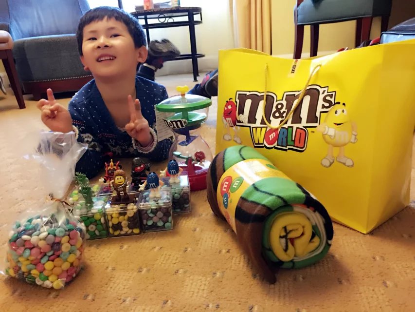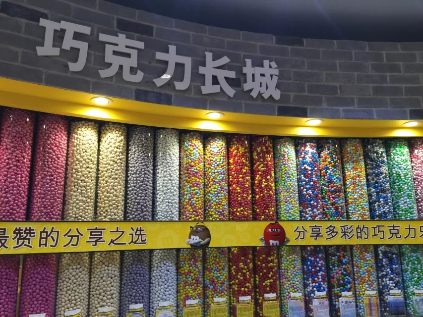 五颜六色各种缤纷的色彩让我很是喜欢,巧克力长城甜蜜浪漫,各式卡哇伊的糖果机让人们爱不释手,眨着眼睛留着长睫毛的M豆玩偶真是可爱,有着他们图案的衣服、杯子、还有零钱包好有趣味。忍不住六百多大洋又出去了,带着甜蜜和对下一次