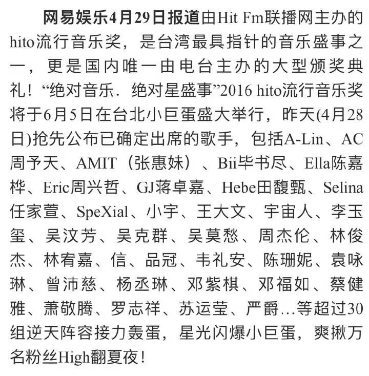 一般来说金钟奖出席的较多是活跃在台湾影视上的男女明星 还有歌星等等金马奖的话 就要看当年入围的有哪些电影了一般来说主创团队都会出席这些信息都是可以提前在网上得知的TOP2音乐类(小巨蛋)和你的音乐偶像近距离接触~金曲奖是每年必有的 hito和kkbox没有太留意这些信息在FB上都可以看到 微博贴吧也会有粉丝搬运这些信息像这些活动如果拿到了门票就可以进到现场真的嗨上天视觉与听觉的盛宴当时我只去了hito不过真的超值想见的明星都有看到虽然不是近距离但还是满足了现场也是high上天