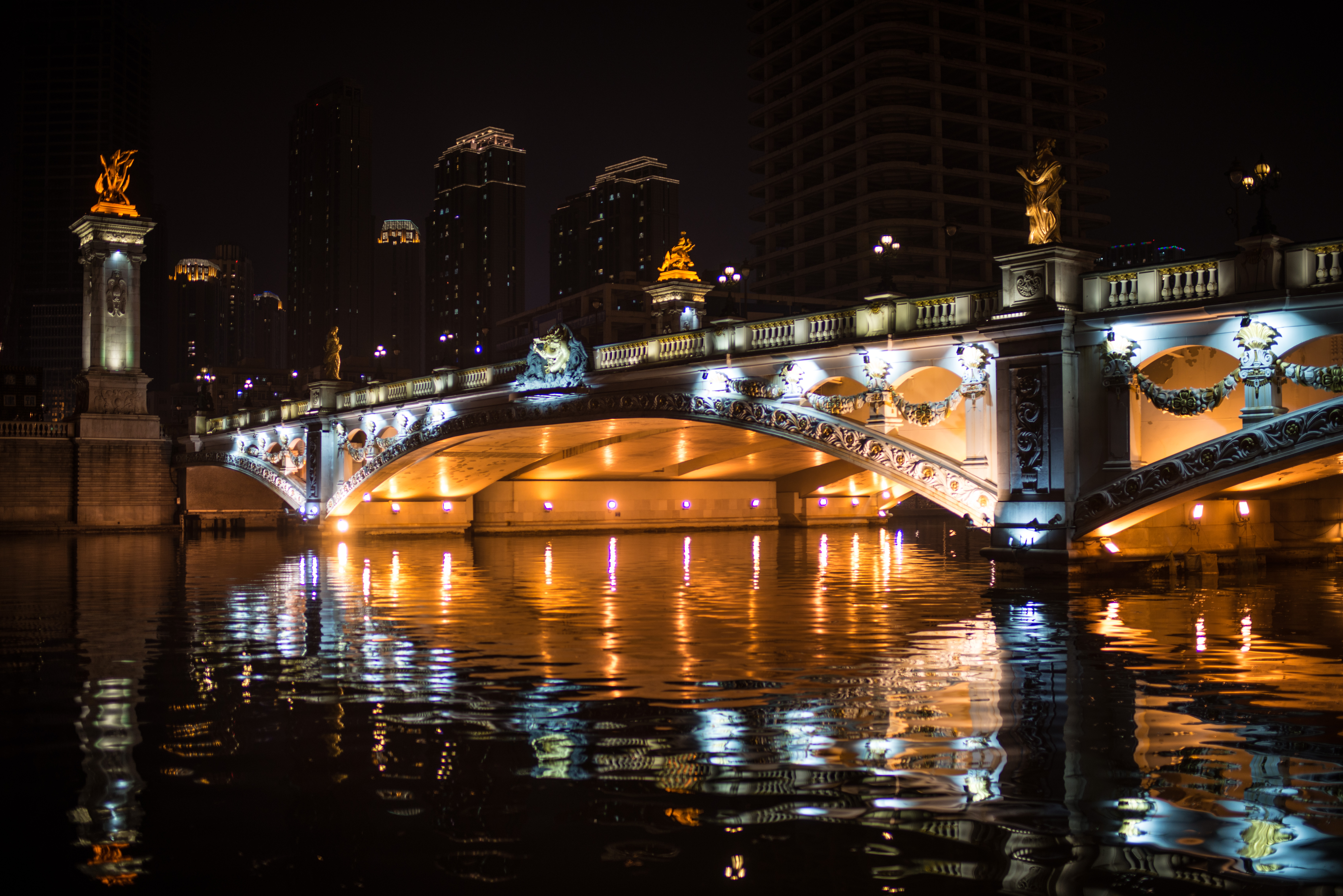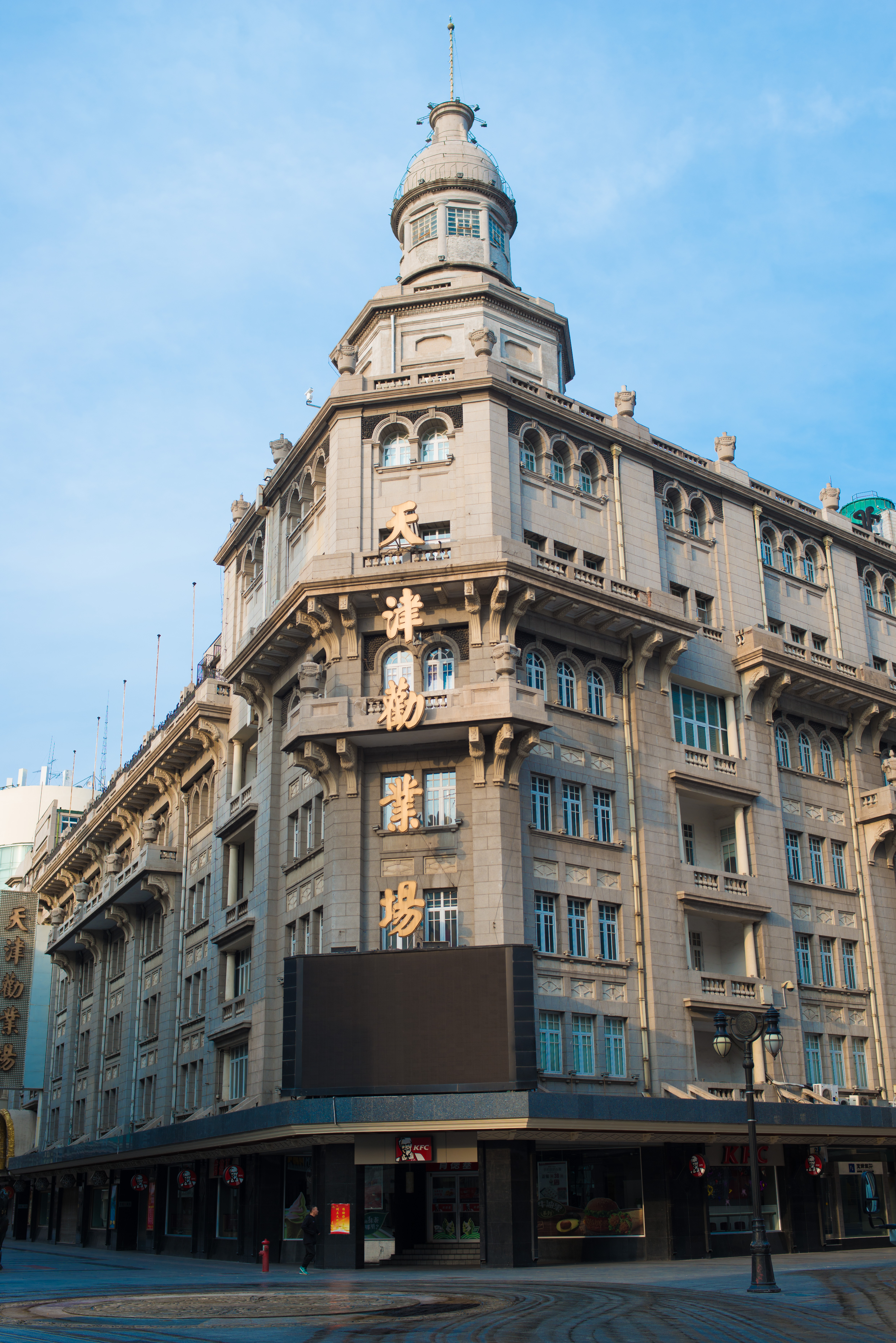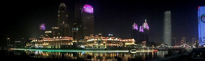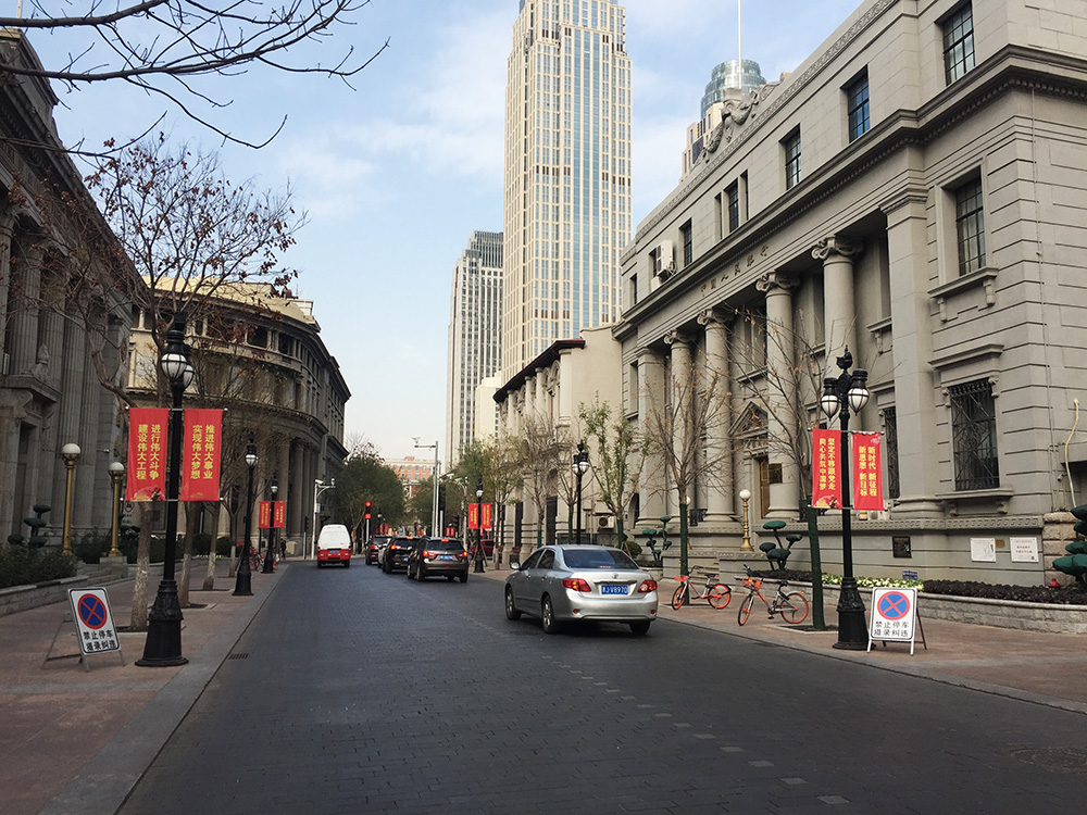 津湾广场周边。这里的解放桥也是一座传统风格的桥梁,知名度不亚于上海的外白渡桥,风格也类似,津湾广场及附近的传统金融街区分布着大量老