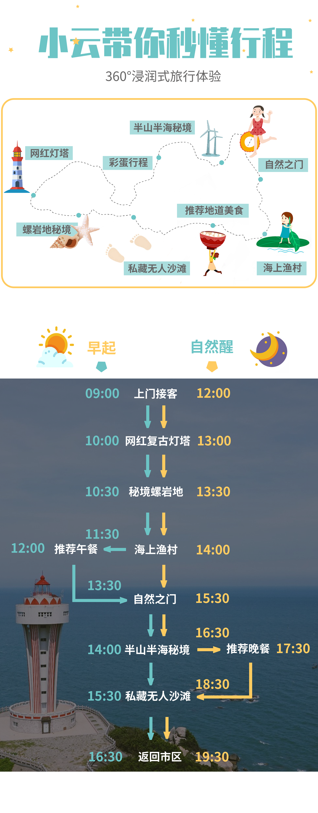 自驾一日游一般有环岛一日游,以海岛历史人文为玩乐主题如宋井、金银岛、总兵府、南山寺等景点环岛一日游,以海岛山海景为主题如后花园生态村、风能发电场、黄花山森林公园等景点环岛一日游,期间青澳湾作为海岛最核心的景点必去,这里有最漂亮的海湾、4A级泳区、地标北回归线广场,同时青澳湾吃、住、玩、购相对方便。