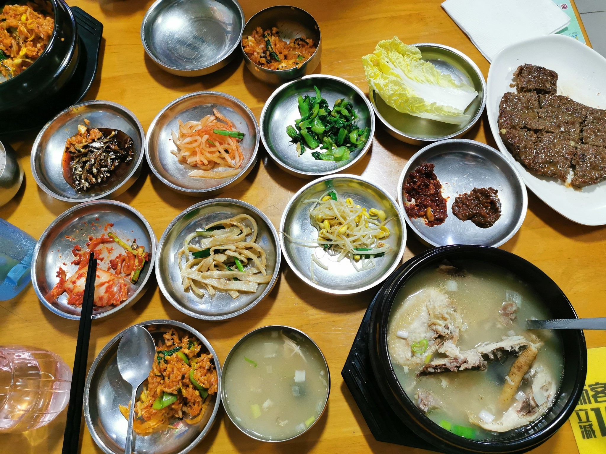参鸡汤、烤牛肉饼、辛拉面、炒杂菜、卷饭都很不错。泡菜汤很酸,慎点!