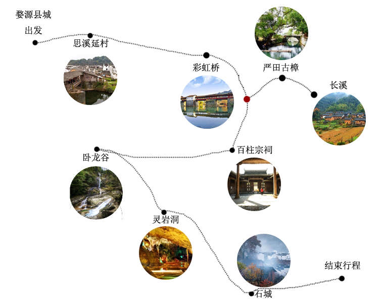 主要包括了五龙源漂流、江岭、晓起、江湾、汪口、水墨上河、月亮湾、庆源以及鲜花小镇篁岭。