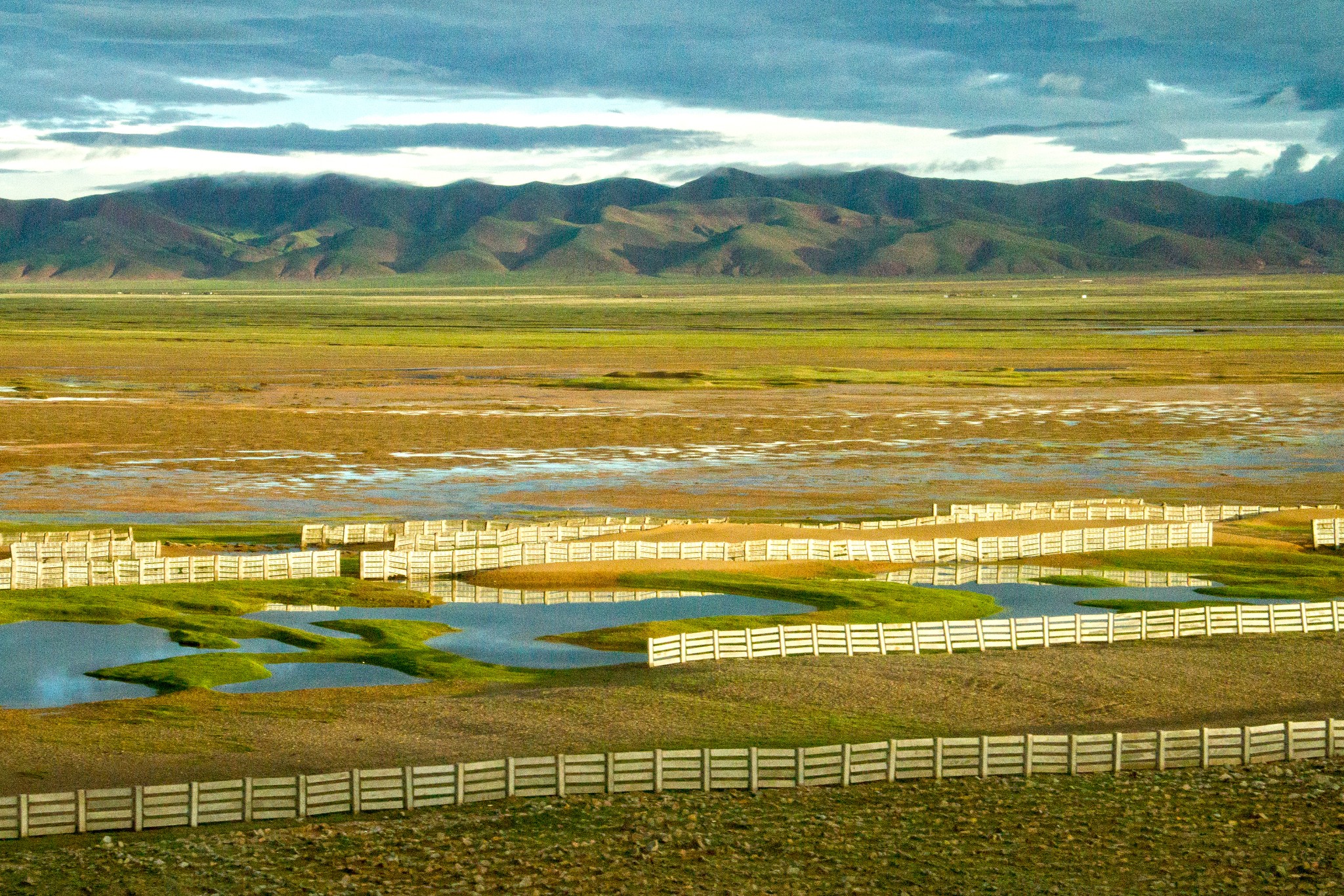 高山、湿地与绵延不断的篱笆墙构成一幅美丽图画