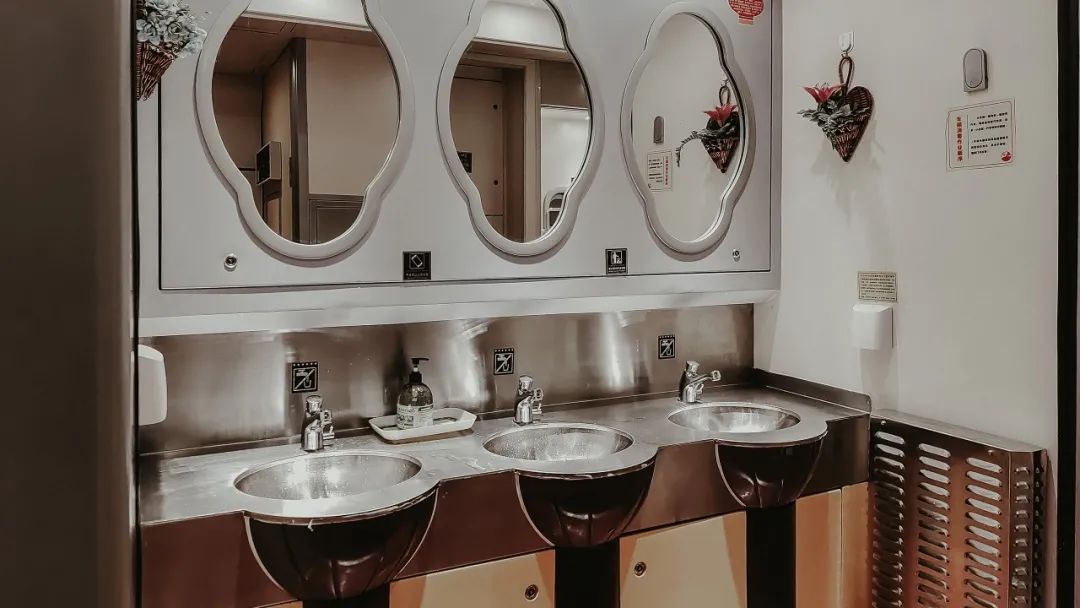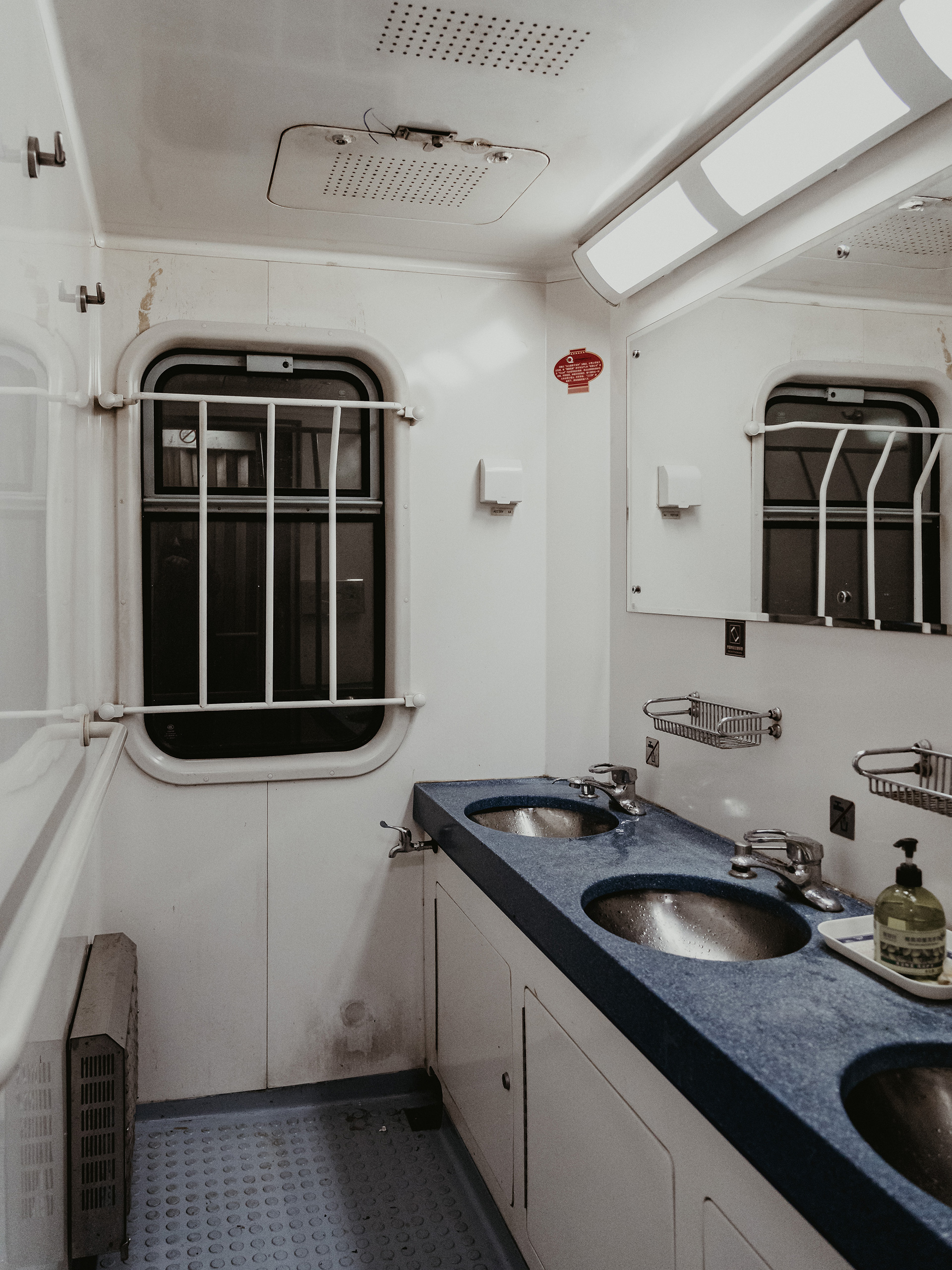 每节车厢都有一排洗手盆,可以在晚上的时候刷牙、洗脸。