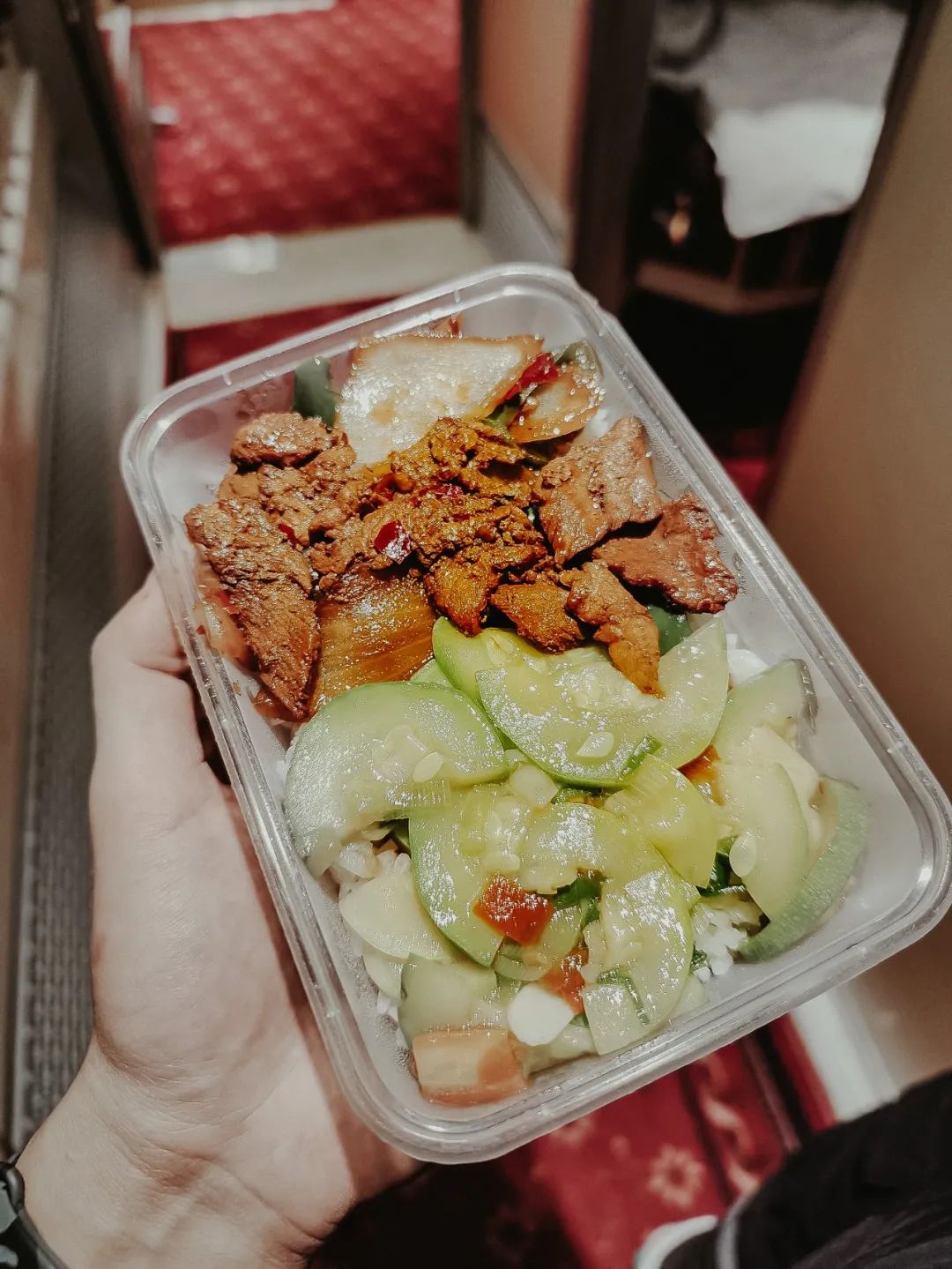 列车提供的餐饮,不仅有餐车提供的盒饭(25元一份饭),也可以选择到7号车厢去点餐,只是价格相对来说会贵一点,基本都是含有辣椒的,对于不能吃辣的我来说,却是有点食之无味。