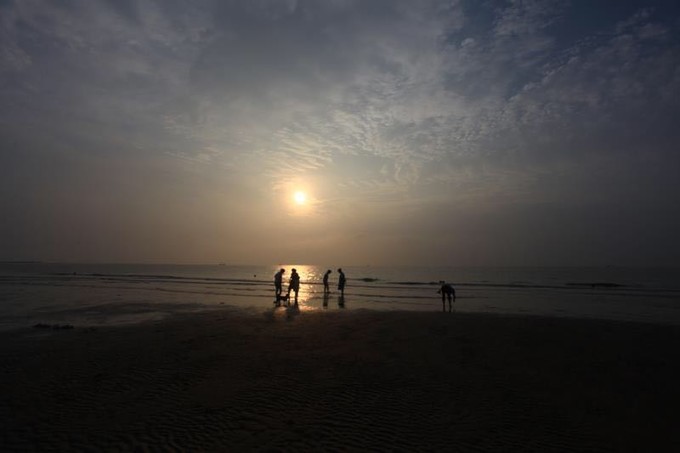 一个人在海边等日出。