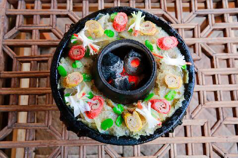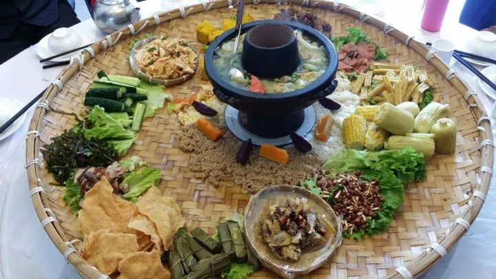 腾冲火锅的用料及制作系以青菜、芋头、淮山、红苕、黄笋等,用鲜肉骨头汤煮熟为底料,上铺一层泡皮,泡皮之上点缀一圈蛋卷,即成一色香味俱佳的腾冲火锅。
