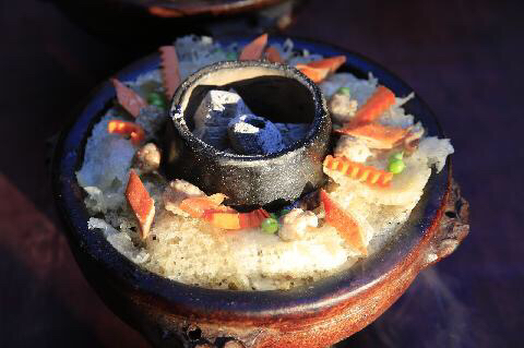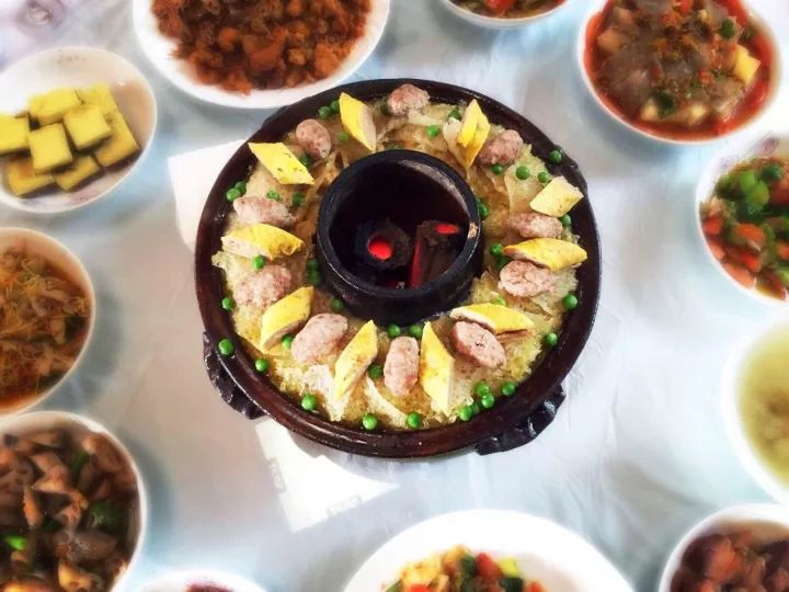 土陶火锅,中间的“锅肚”里放炭火,鲜美诱人。