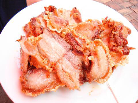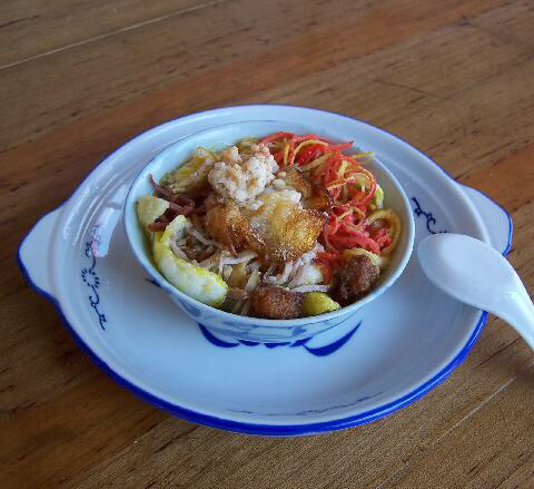 烧肉米线是将黄皮、酥肉、黄瓜、切成碎末,放入凉米线,拌上芝麻油、花椒油、油辣椒、蒜泥、味精、酱油、干腌菜油、花生油、葱花、特制白醋(一般由店家自己制作,秘方独特),吃起来特别清凉可口,并且烧肉跟米线搭配起来的味道特别独特,是腾冲比较出名的小吃。